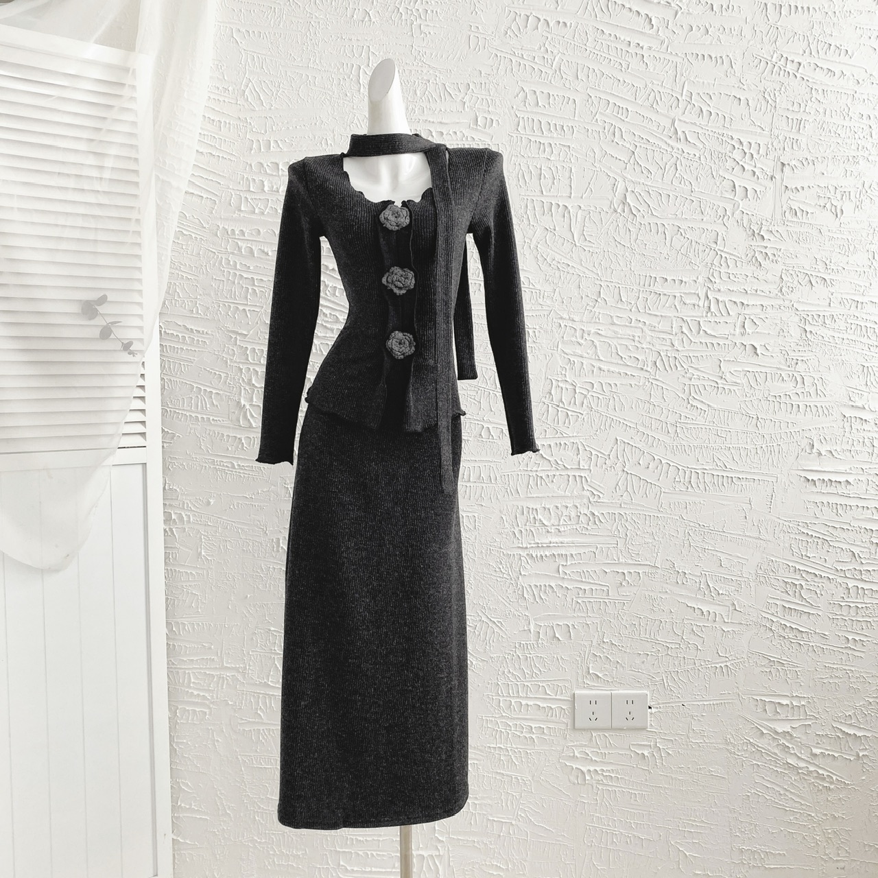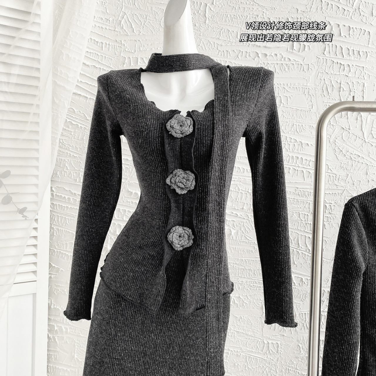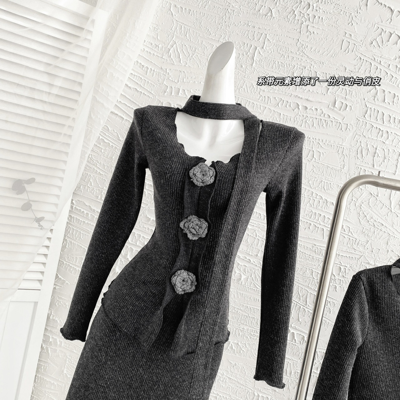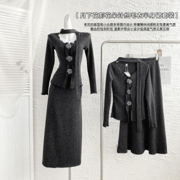 FA56283# 木木家设计感立体花朵飘带上衣+松紧高腰显瘦半身裙 服裝批發女裝批發服飾貨源