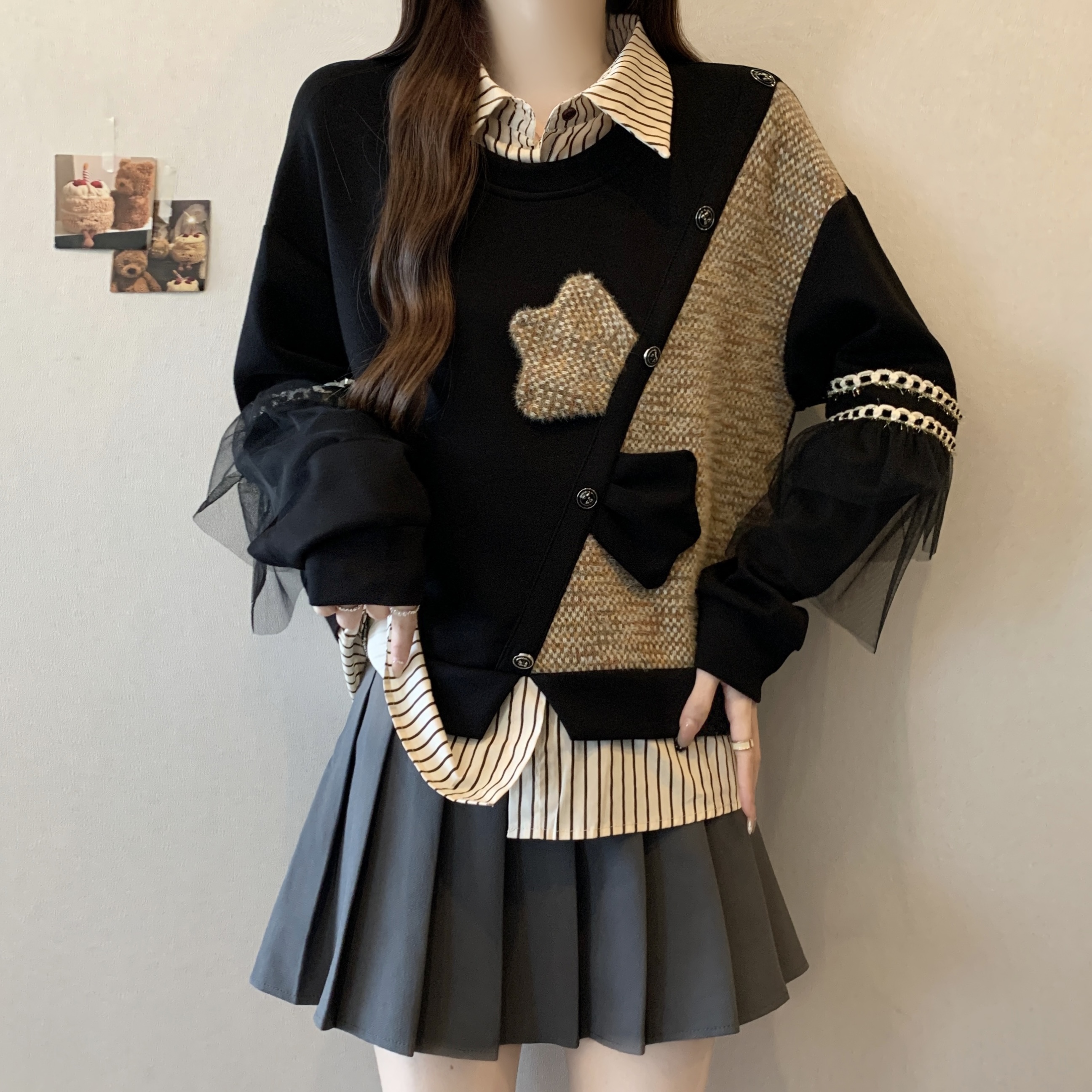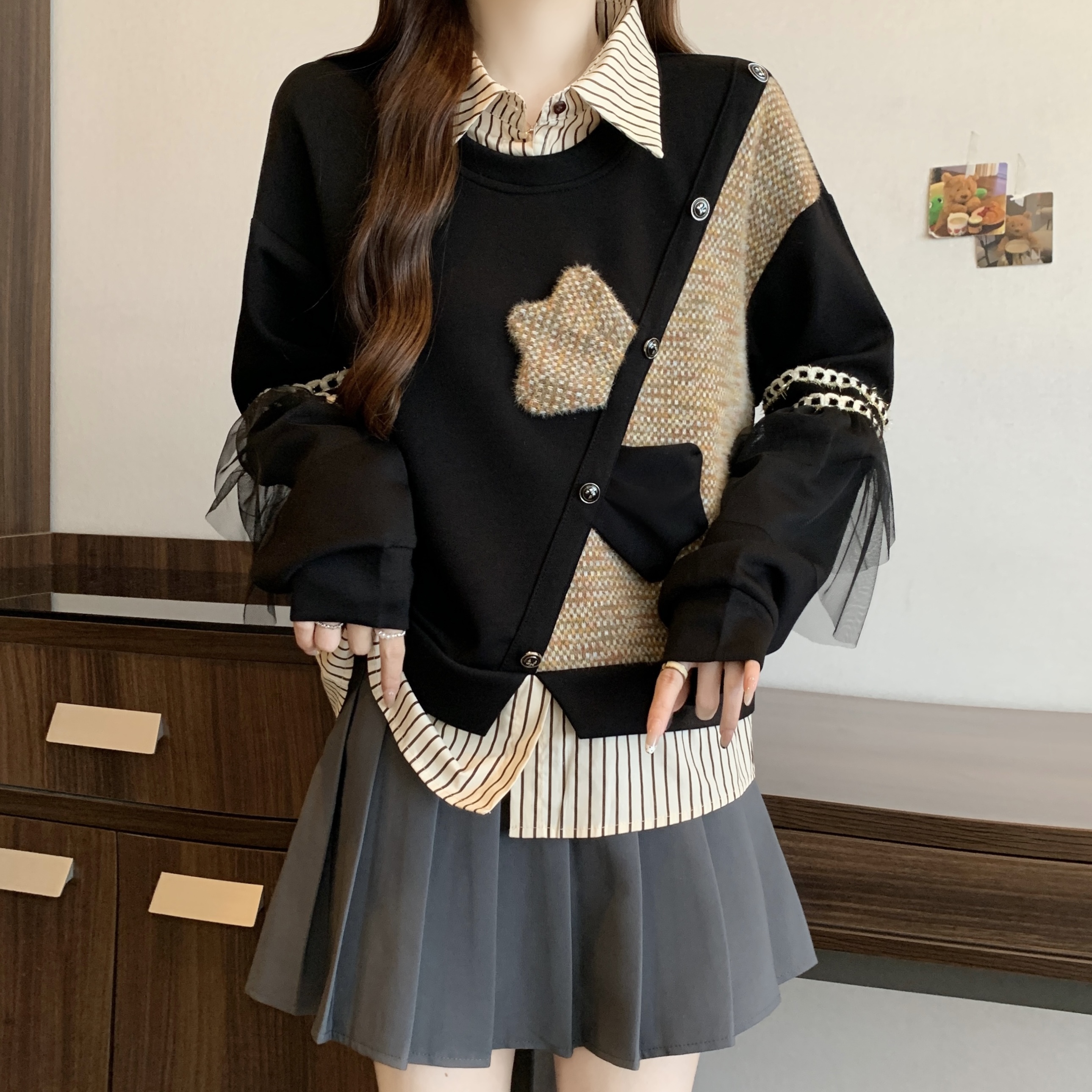 FA56307# 大码胖mm秋冬新款时尚学院风假两件卫衣小香风时尚洋气显瘦上衣女 服裝批發女裝批發服飾貨源
