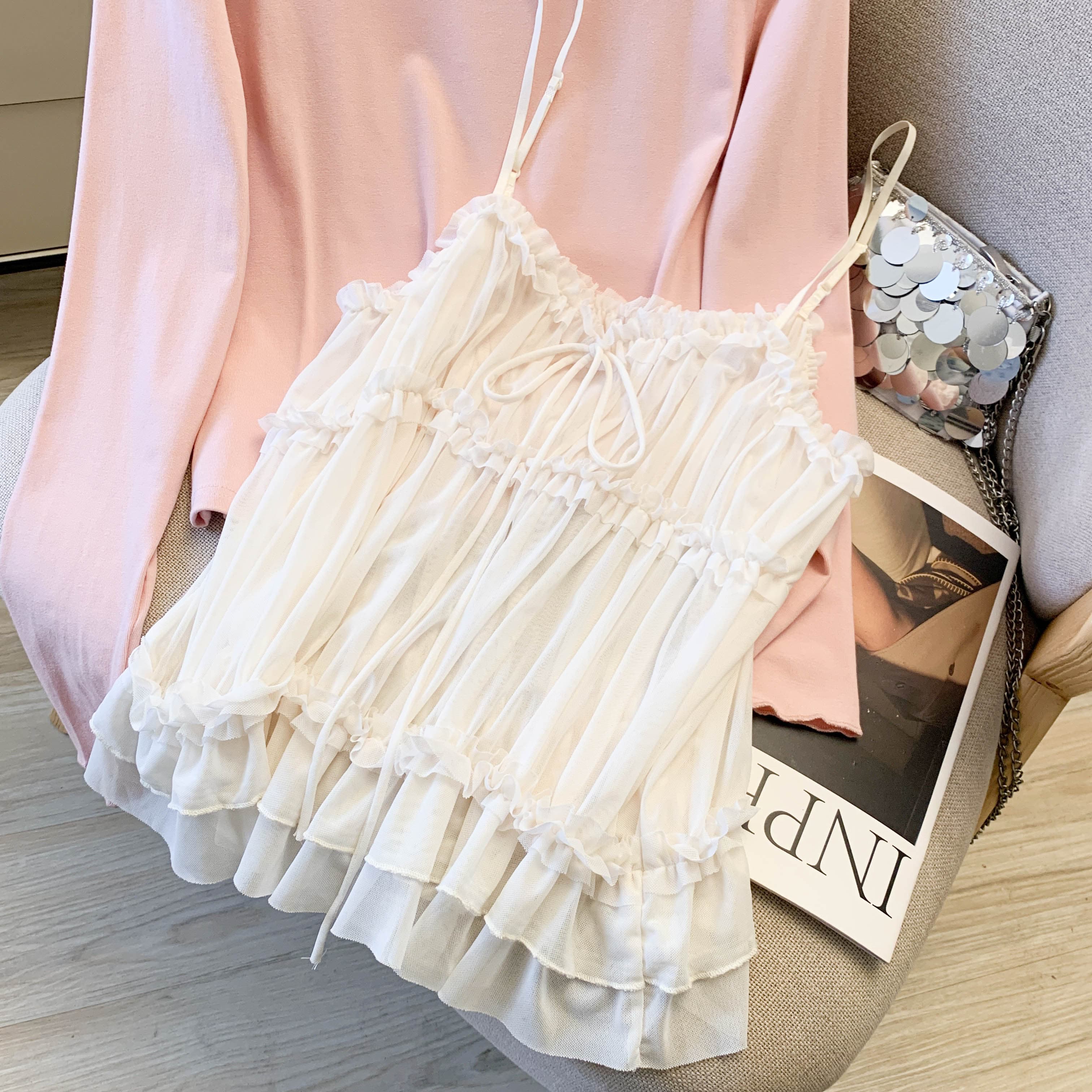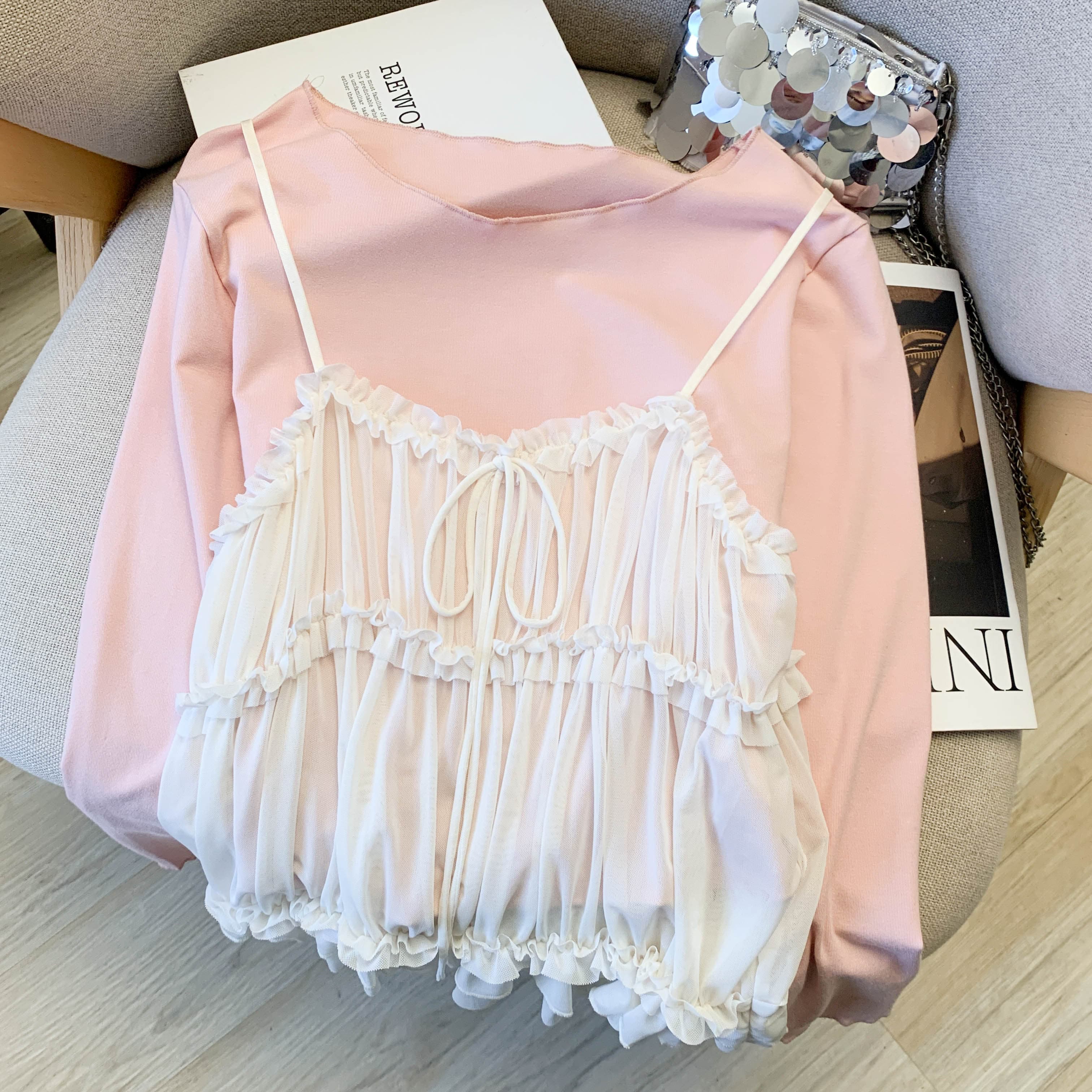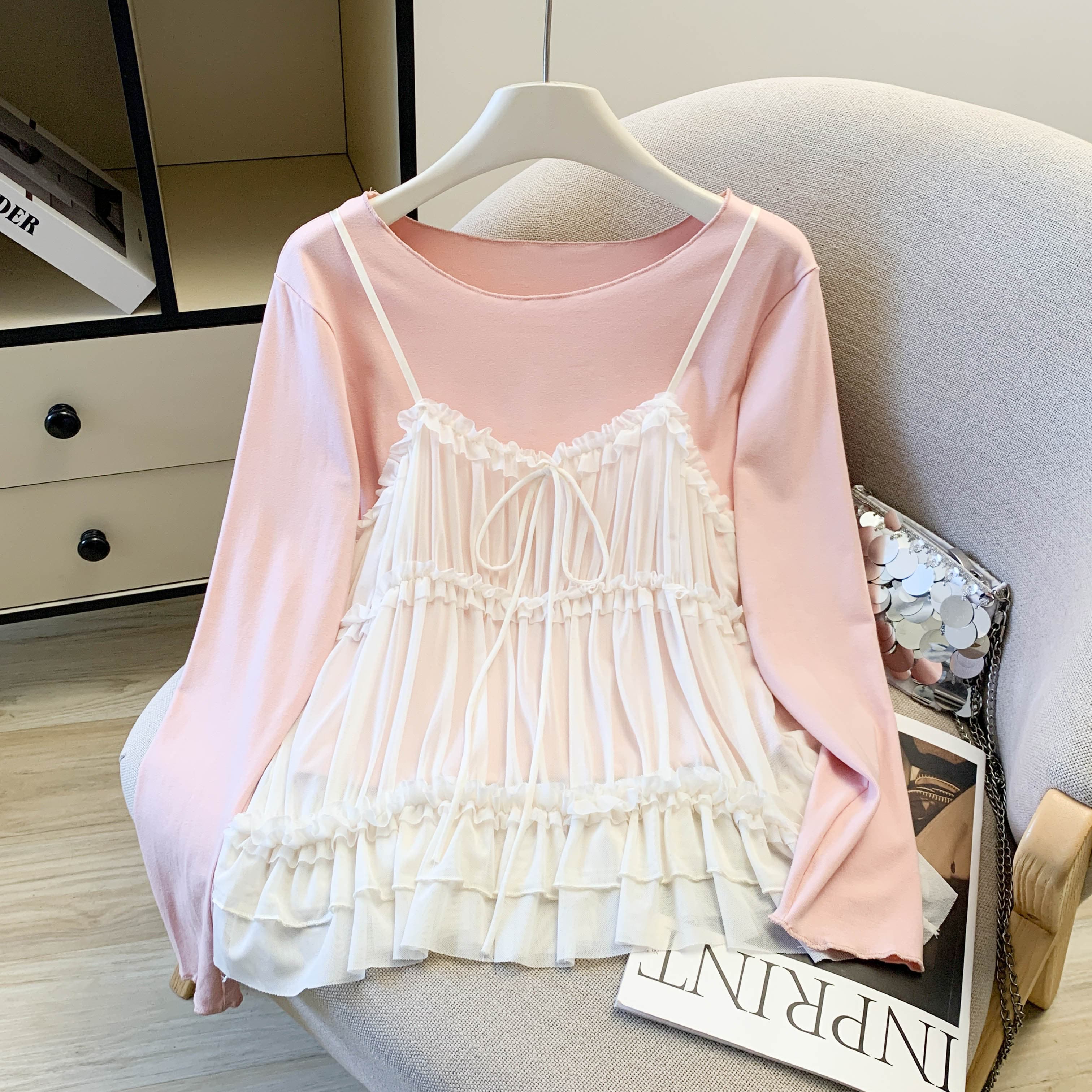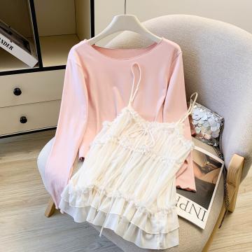 FA56431# 温柔风甜美粉色T恤打底衫网纱吊带背心两件套女春季新款上衣 服裝批發女裝批發服飾貨源