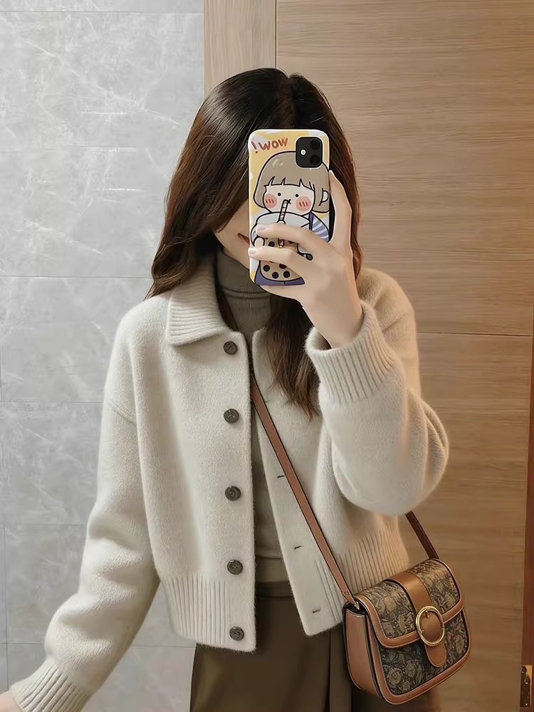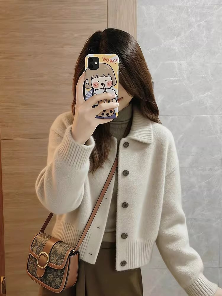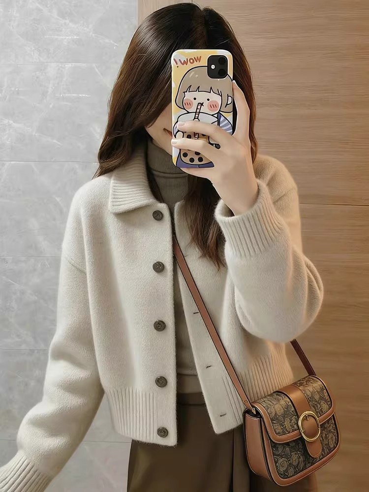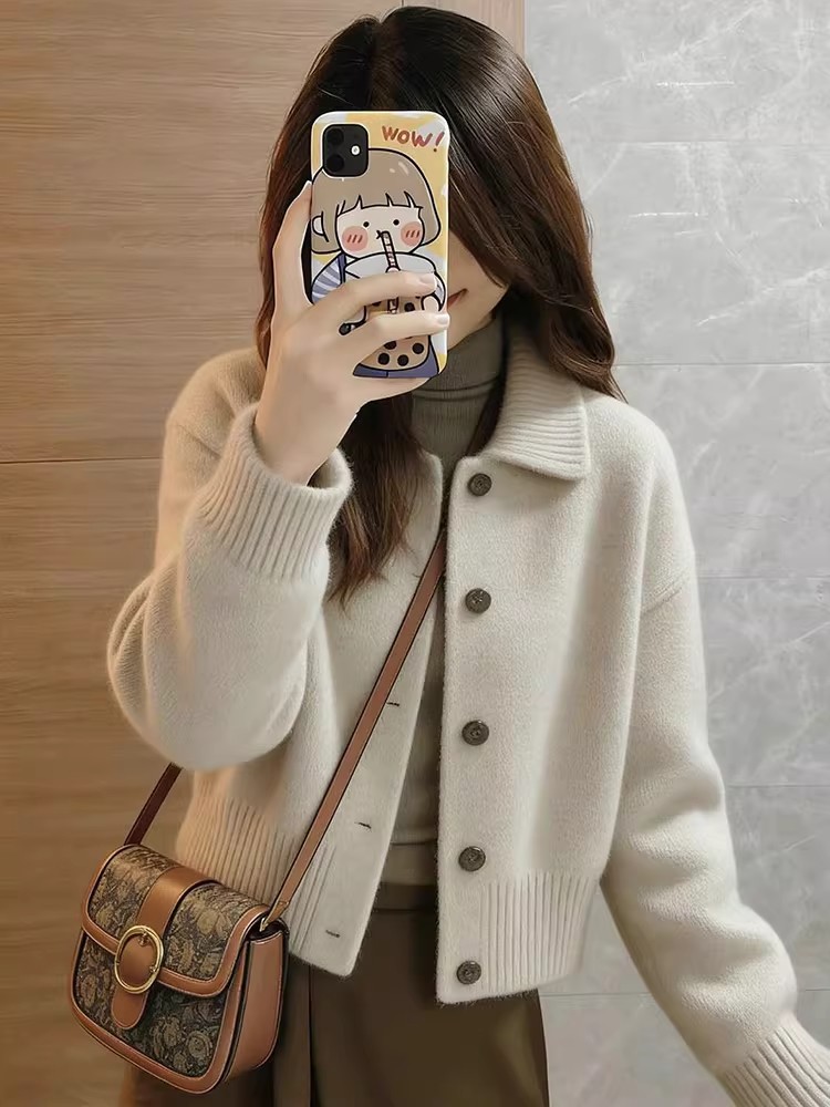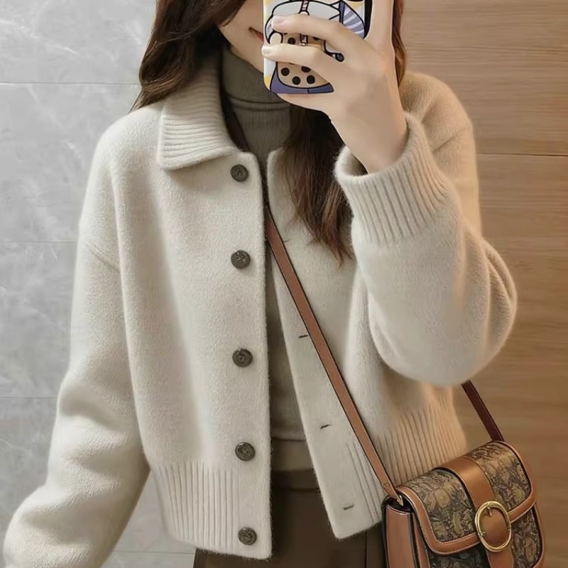 FA56463# 巨好看的早春外套新款小个子米色翻领针织开衫短款毛衣外套女 服裝批發女裝批發服飾貨源