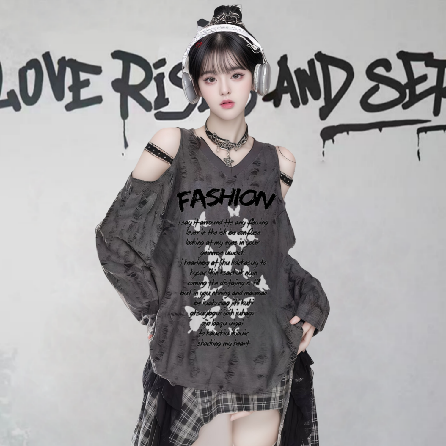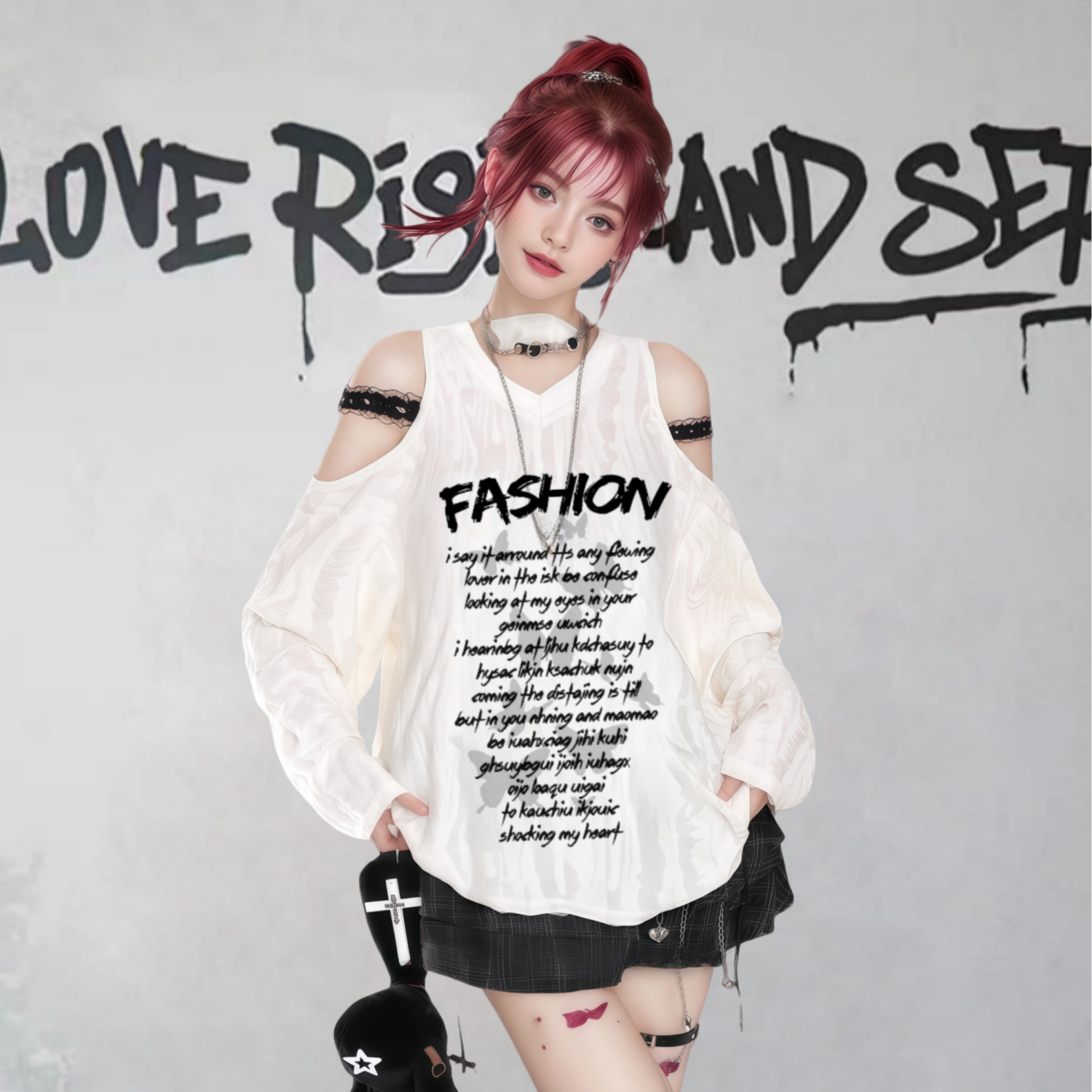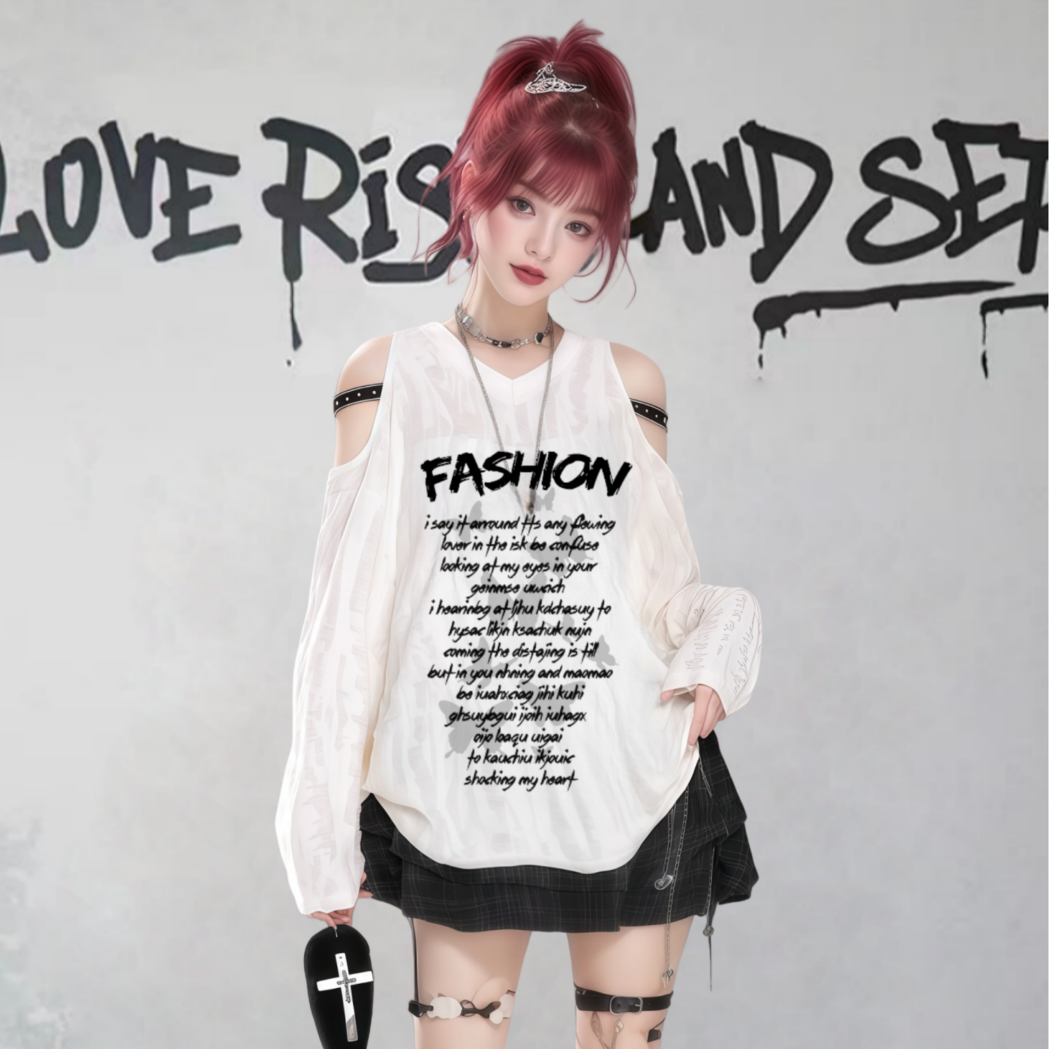 FA56487# 美式甜酷长袖T恤女春秋亚文化风设计感宽松露肩上衣女 服裝批發女裝批發服飾貨源