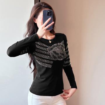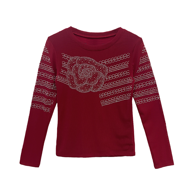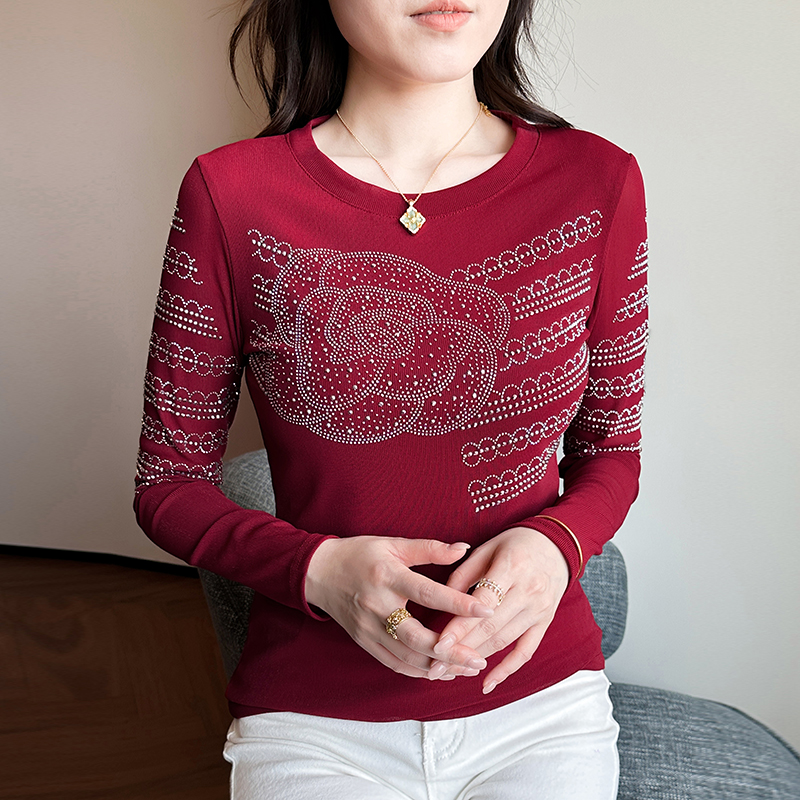 FA56511# 春夏新款圆领烫钻时尚洋气长T恤修身显瘦小衫减龄女士打底衫 服裝批發女裝批發服飾貨源