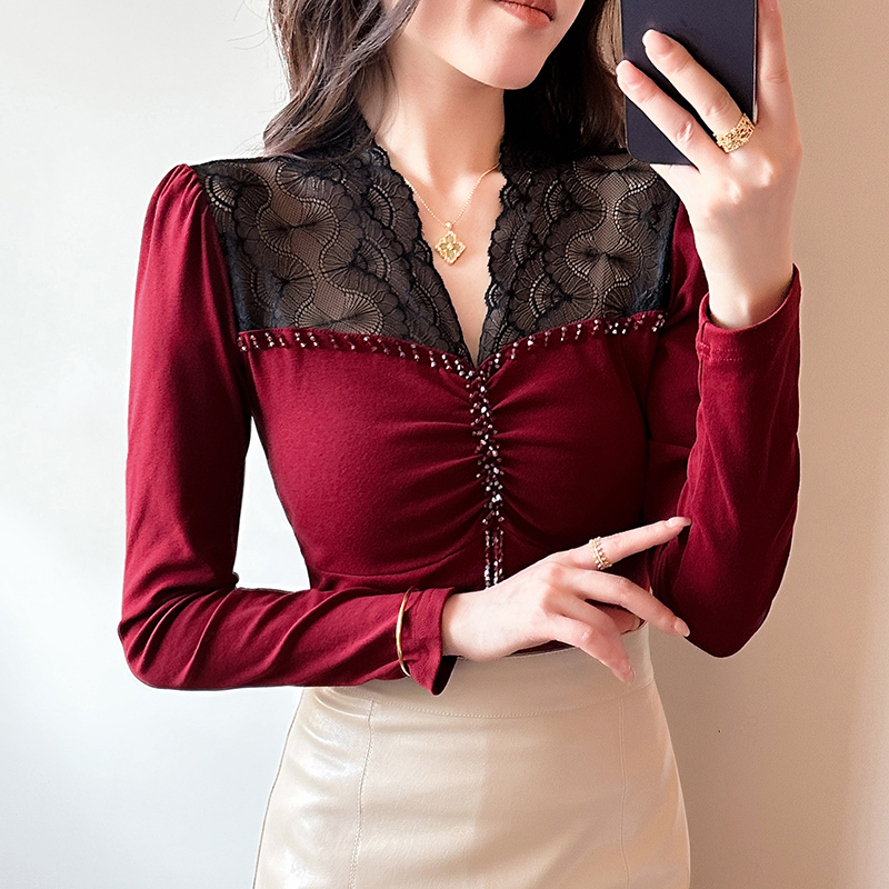 FA56512# 春夏新款时尚洋气蕾丝拼接镂空手工钉珠气质设计感上衣打底衫 服裝批發女裝批發服飾貨源