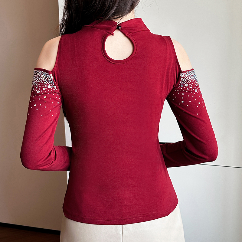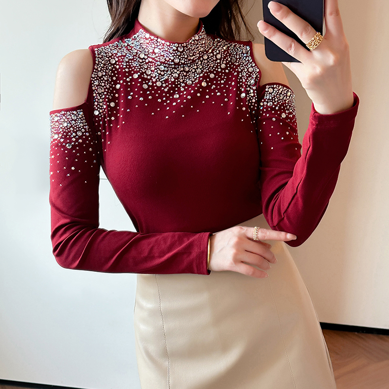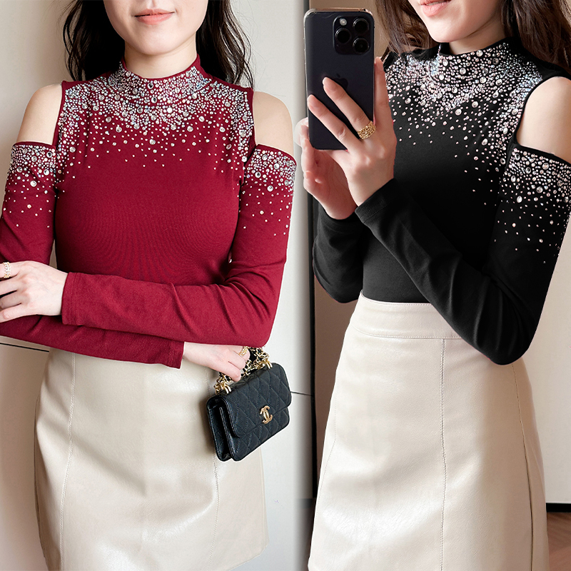 FA56513# 春夏新款圆领烫钻露肩修身显瘦女士打底衫 服裝批發女裝批發服飾貨源