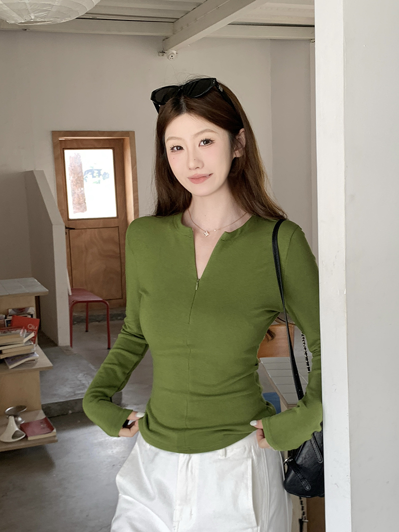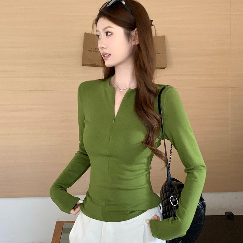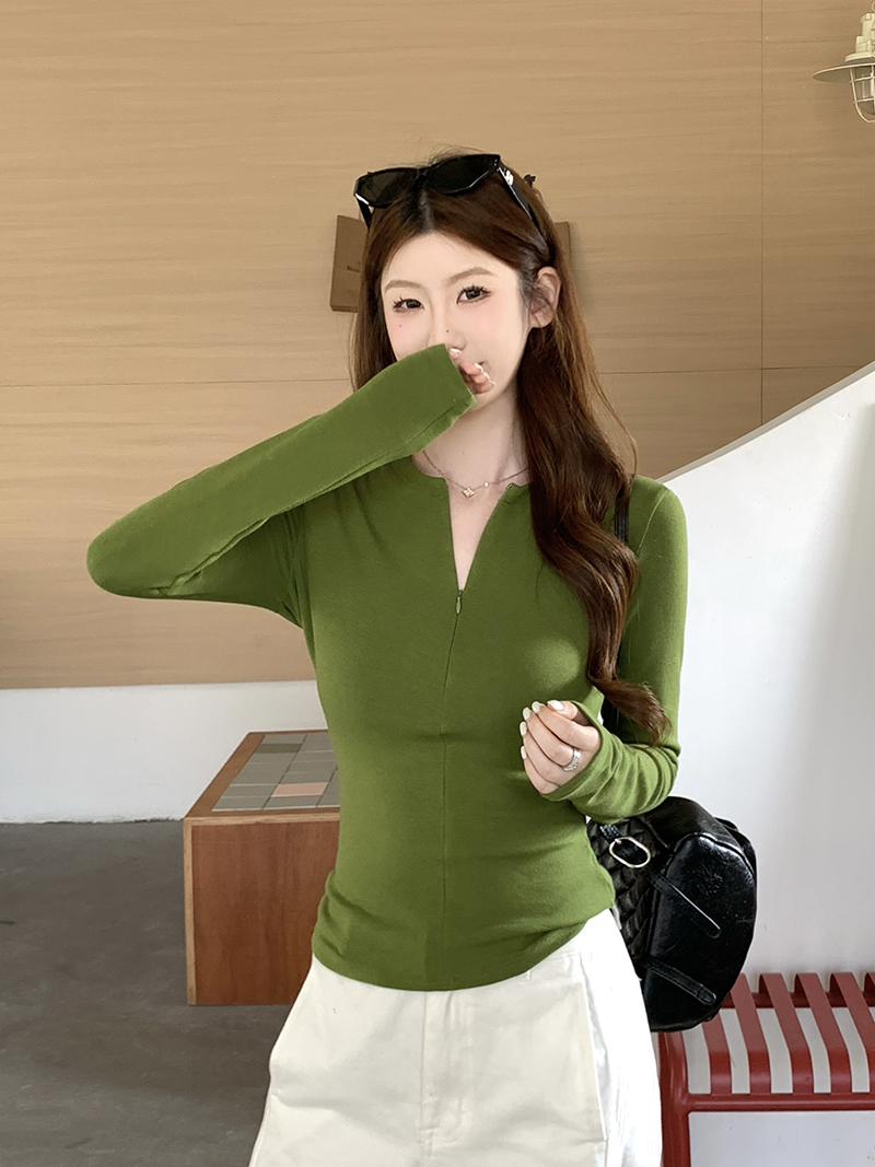 FA56515# 隐形半拉链长袖T恤女打底衫内搭秋冬高级感加厚绿色上衣 服裝批發女裝批發服飾貨源
