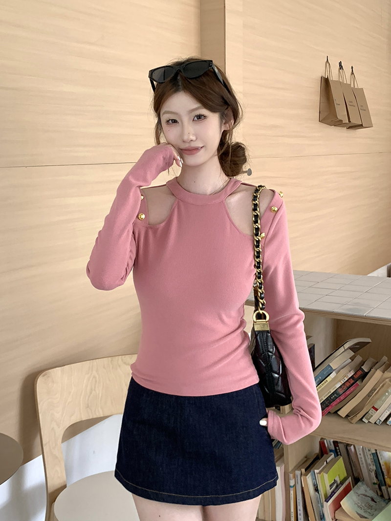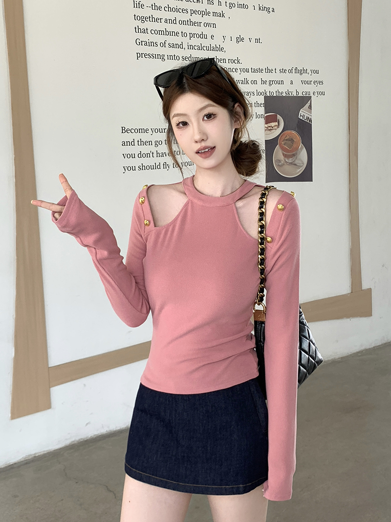 FA56517# 粉色温柔露肩修身长袖女新款气质小众减龄名媛辣妹风上衣 服裝批發女裝批發服飾貨源