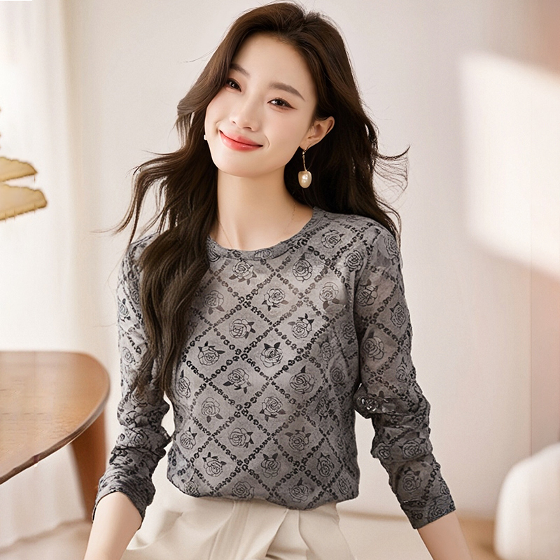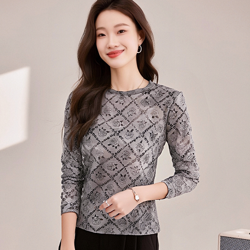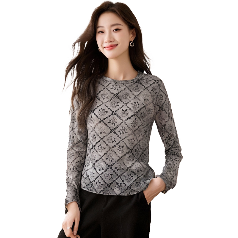 FA56537# 长袖上衣设计感修身高级打底衫女春新款印花圆领T恤 服裝批發女裝批發服飾貨源