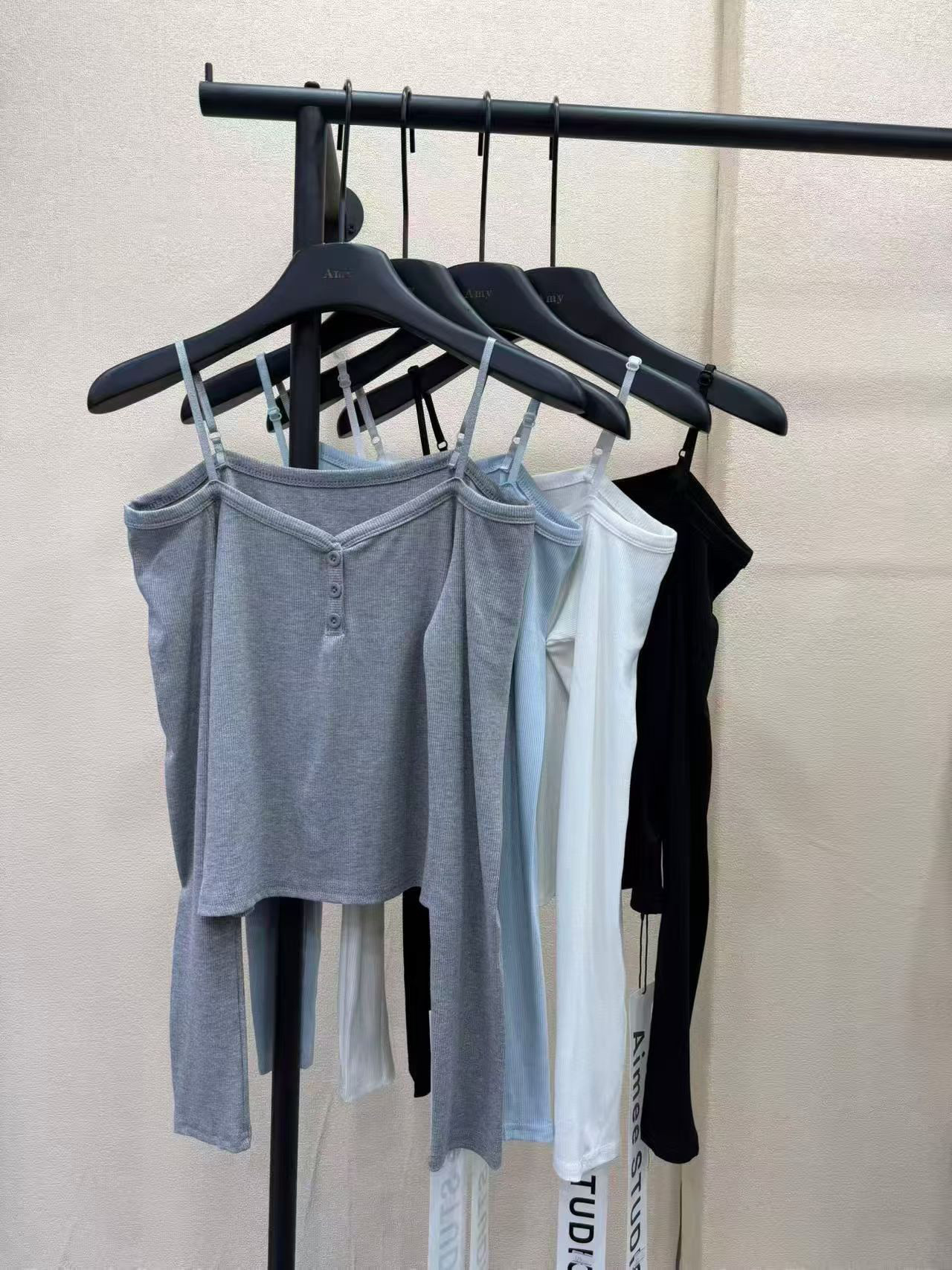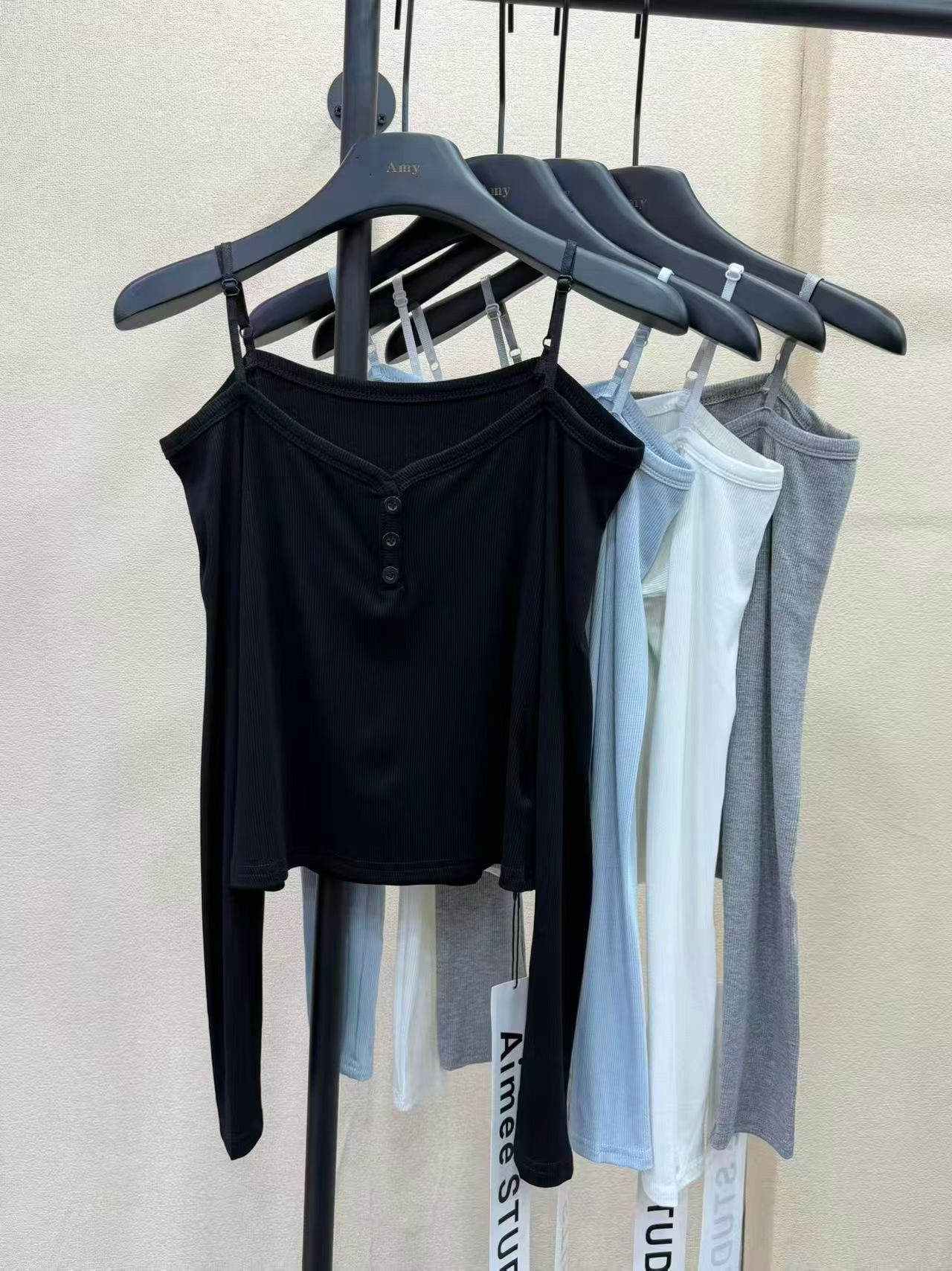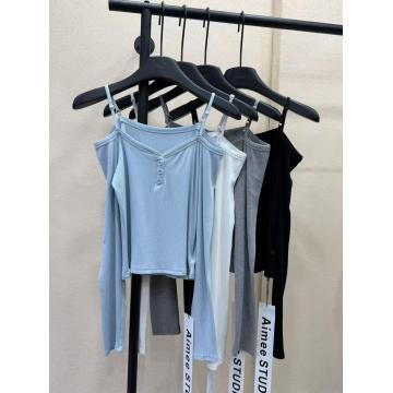 BY10514# 东大门春季女装新品韩版设计感吊带系扣长袖T恤上衣潮 服裝批發女裝批發服飾貨源