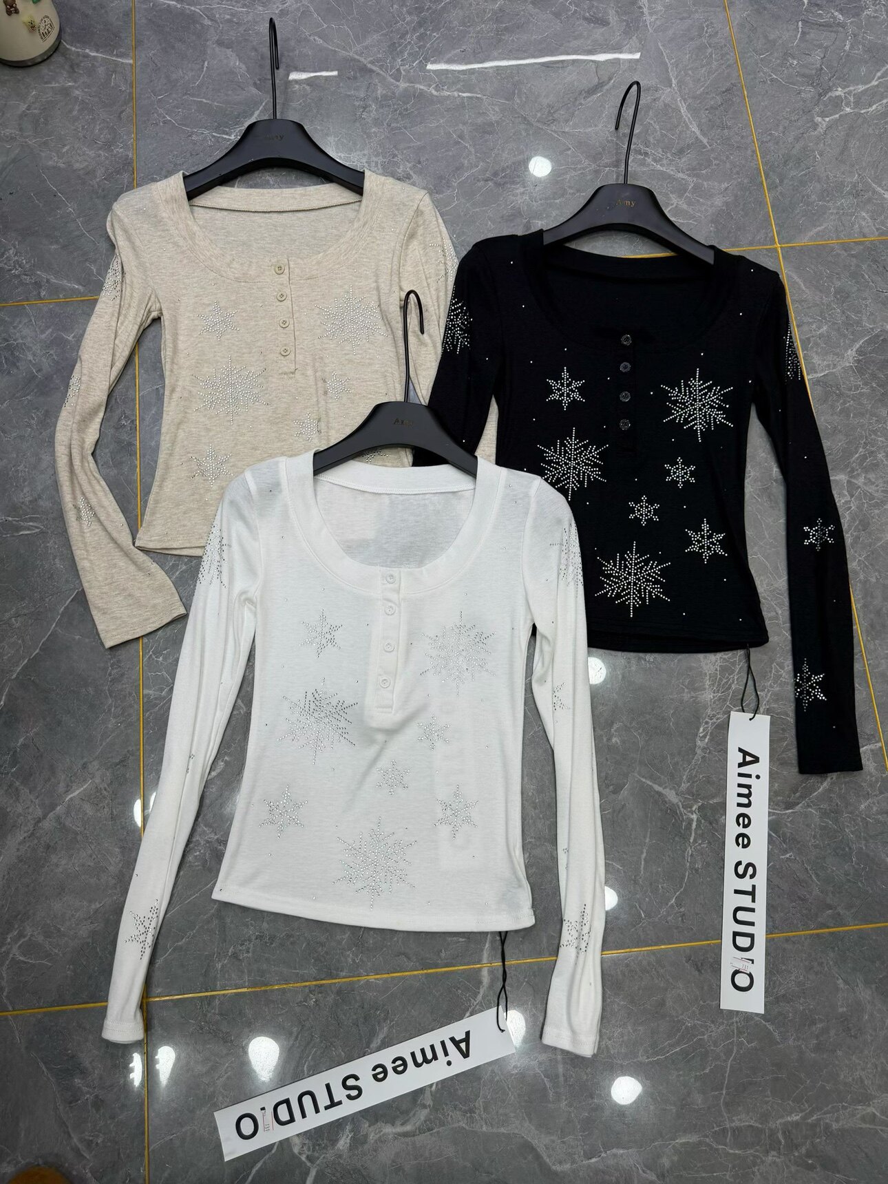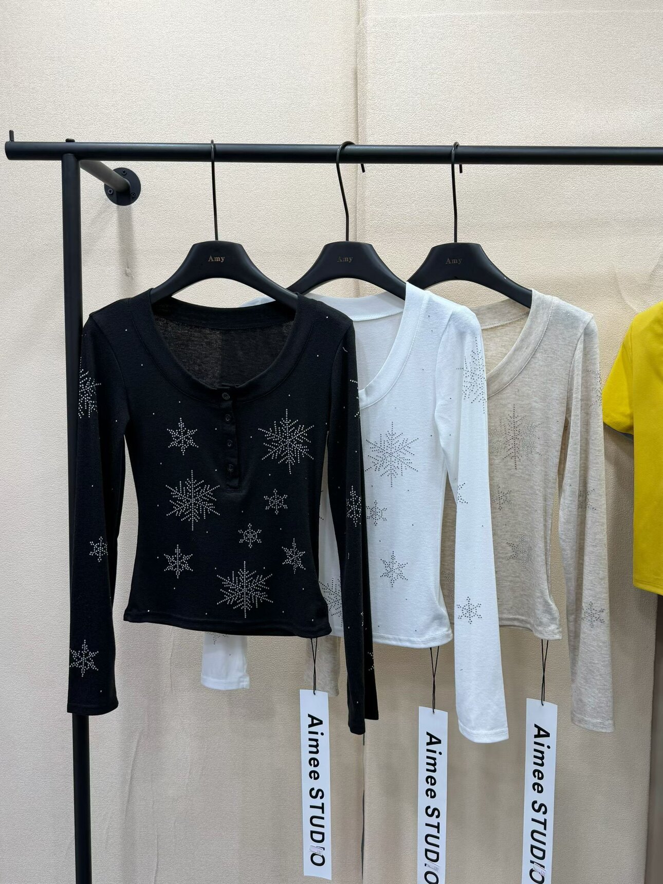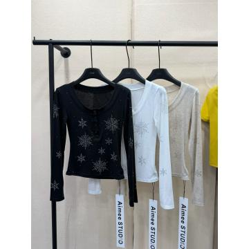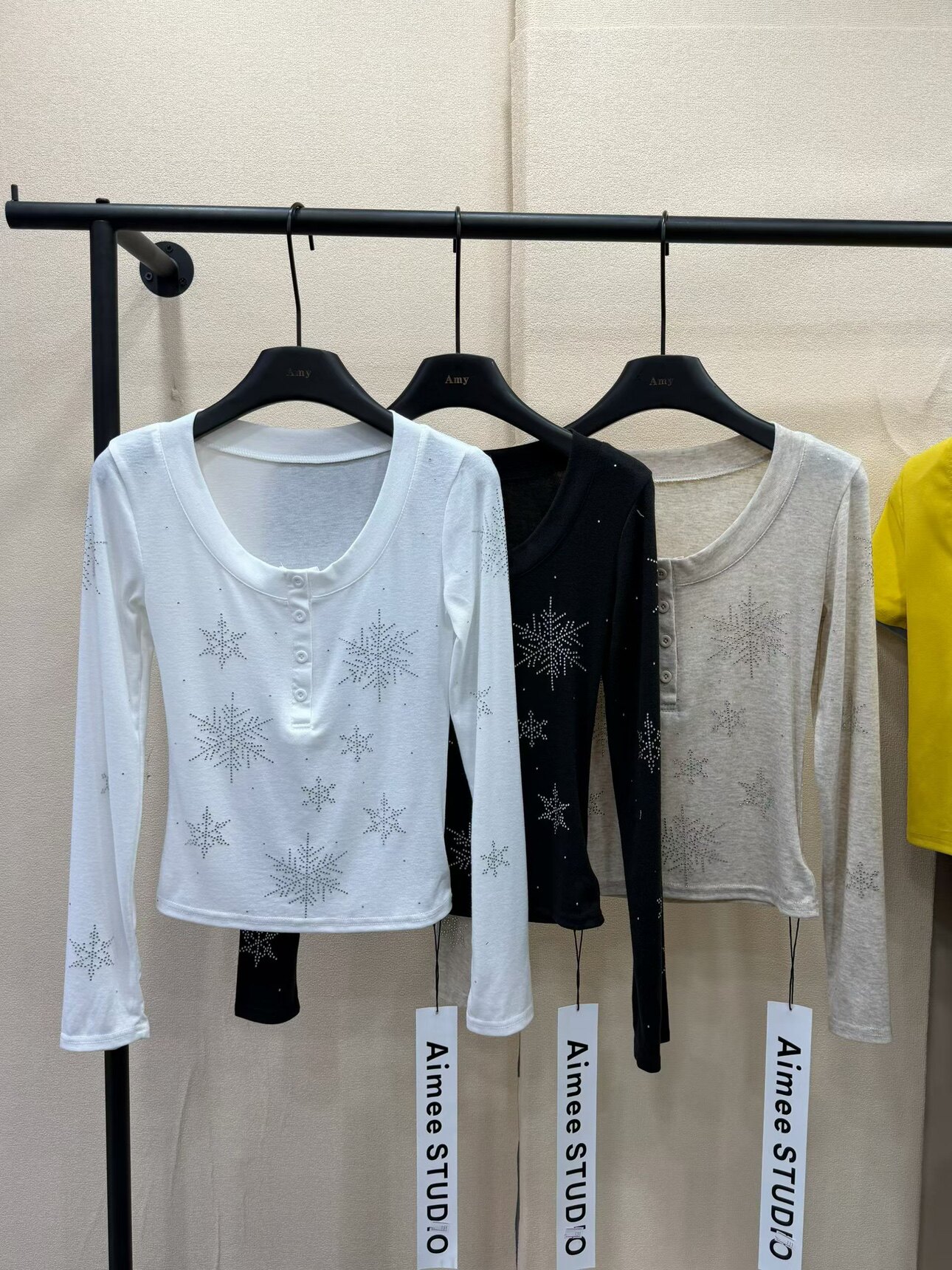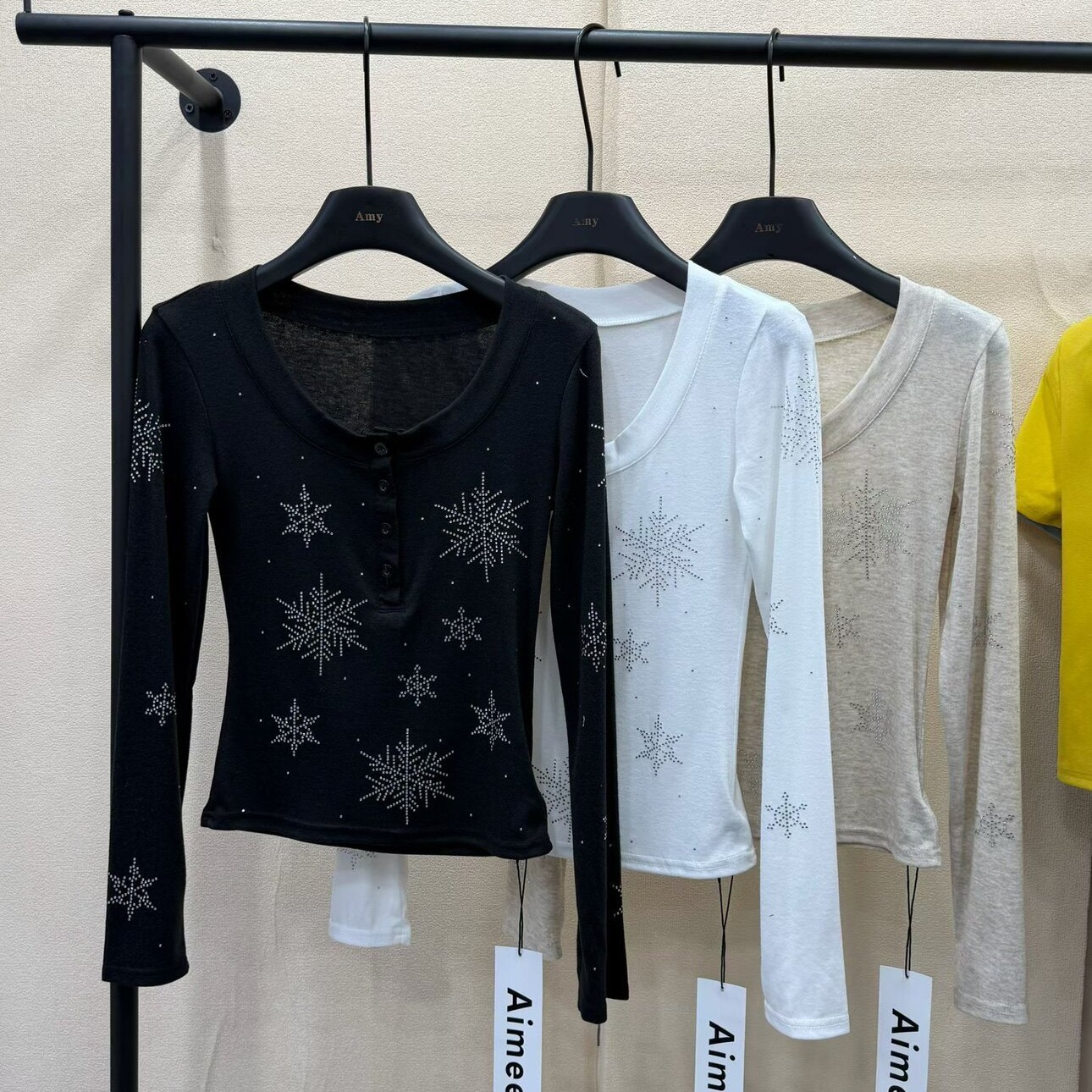 BY10517# 春季新款韩版时尚雪花烫钻长袖T恤女修身显瘦薄款T恤上衣女 服裝批發女裝批發服飾貨源