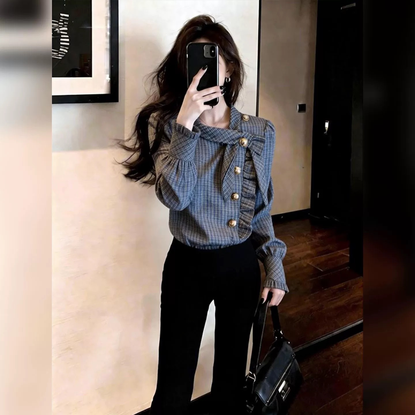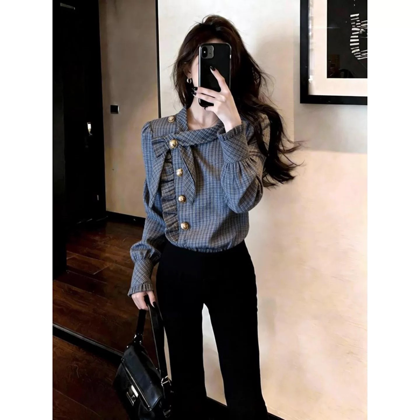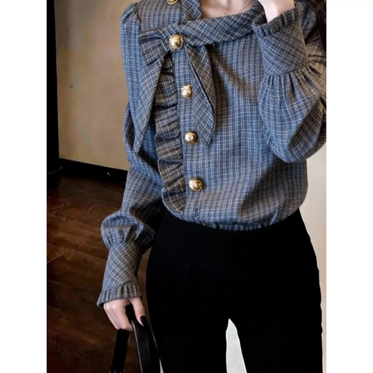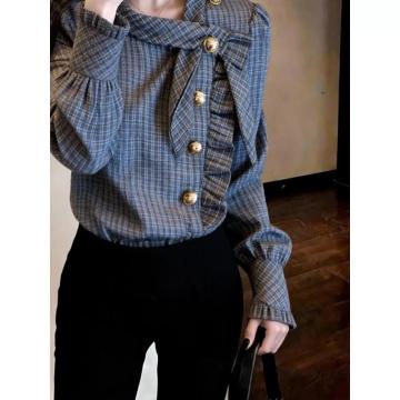 BY10536# 设计感韩版新款日常通勤休闲风格纹衬衫女春薄款侧扣窄袖开衫 服裝批發女裝批發服飾貨源
