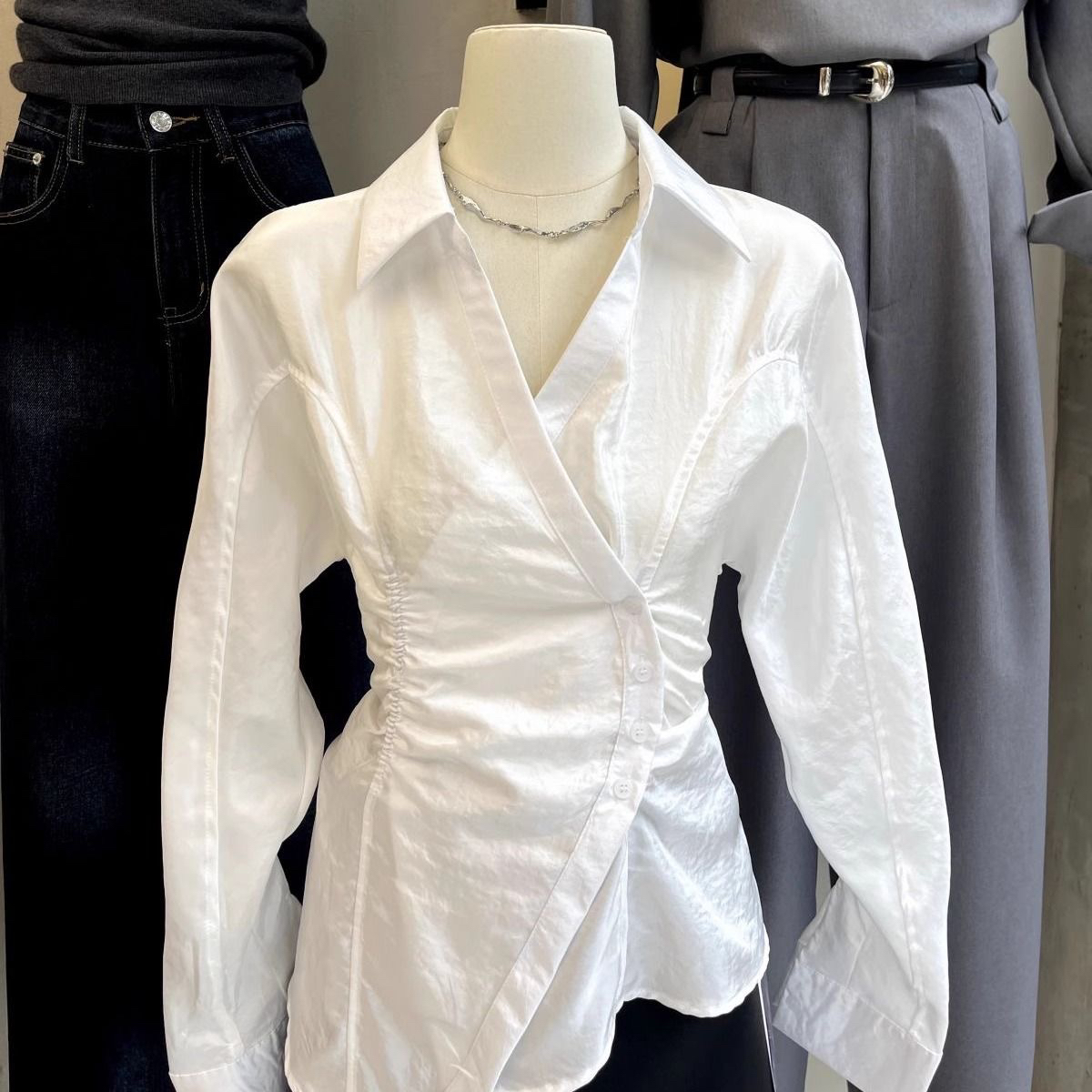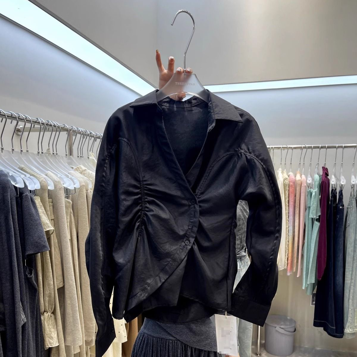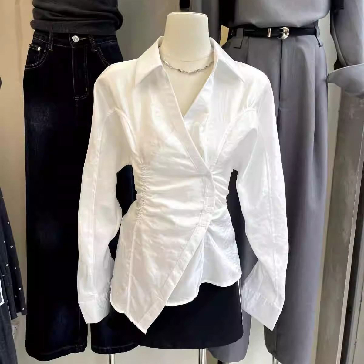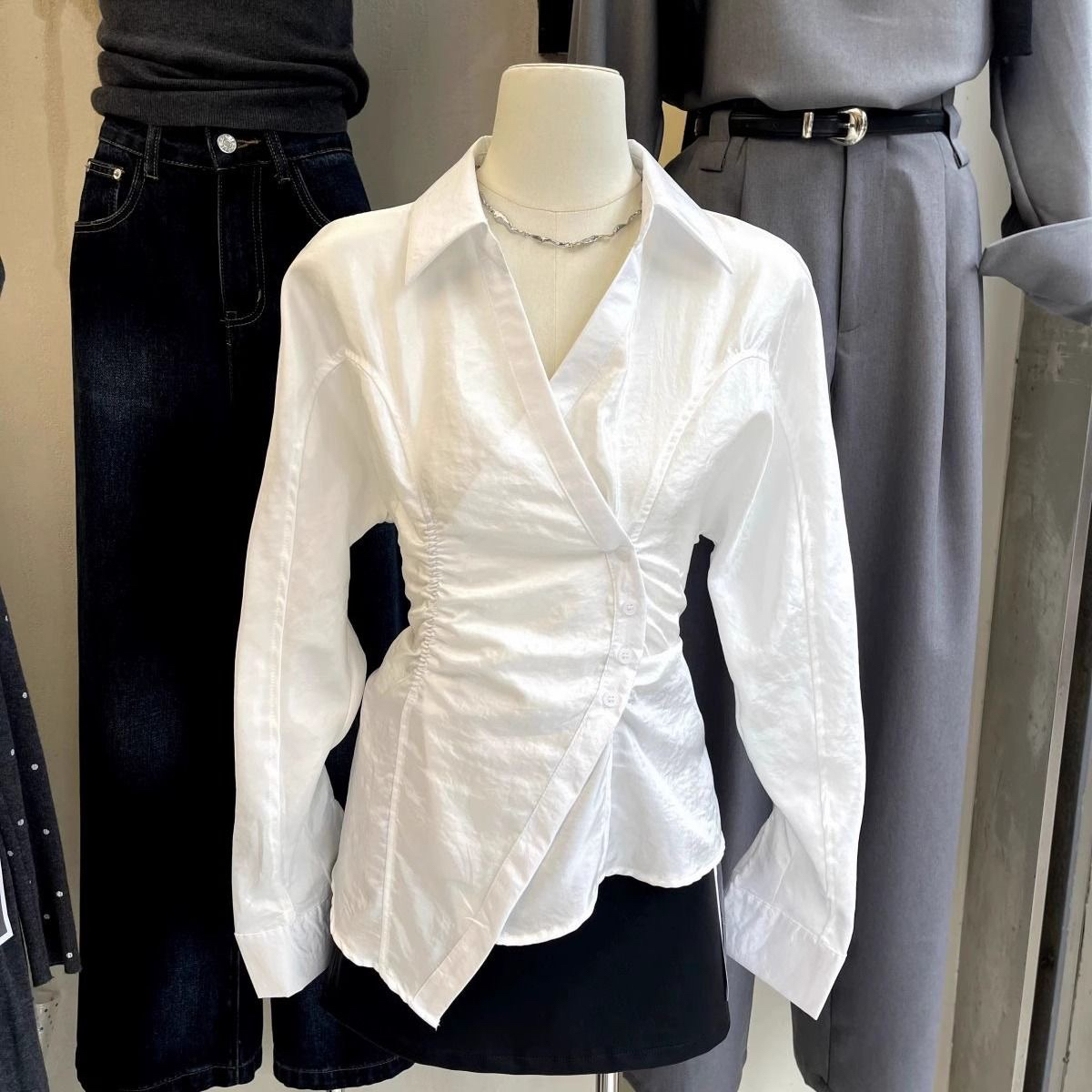 BY10611# 春季韩版新款设计感小众宽松中长款抽绳盐系长袖衬衫上 服裝批發女裝批發服飾貨源