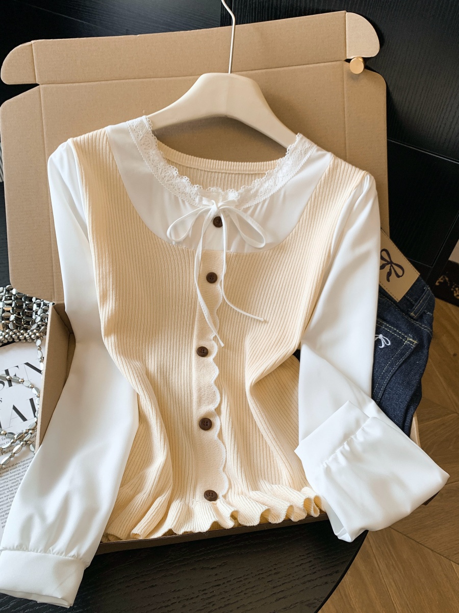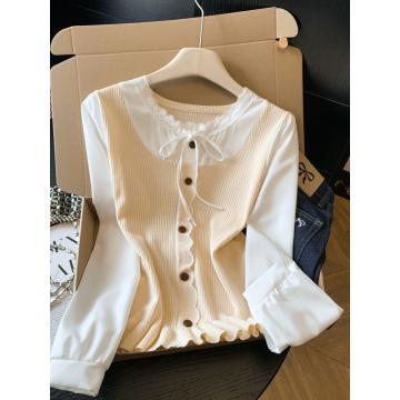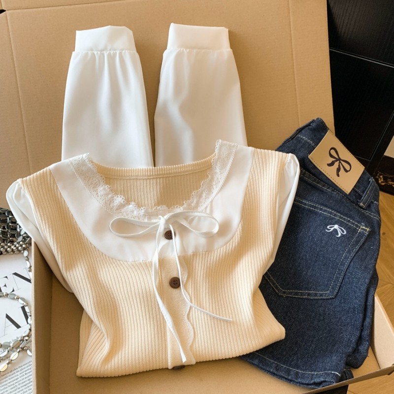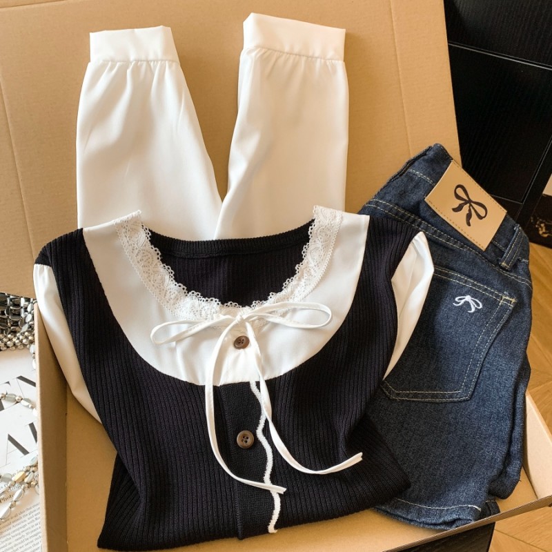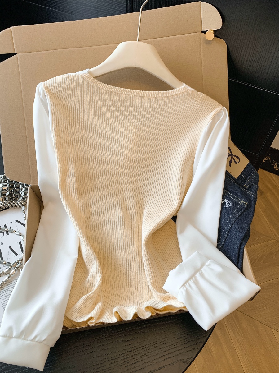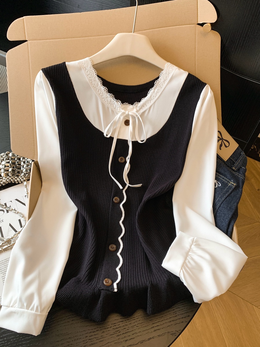BY10691# 春季新款假两件撞色针织拼接雪纺衫法式轻奢圆领洋气上衣 服裝批發女裝批發服飾貨源