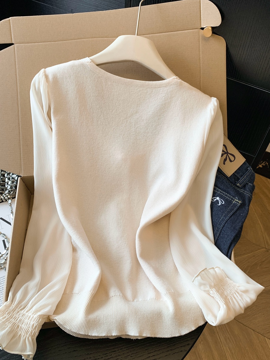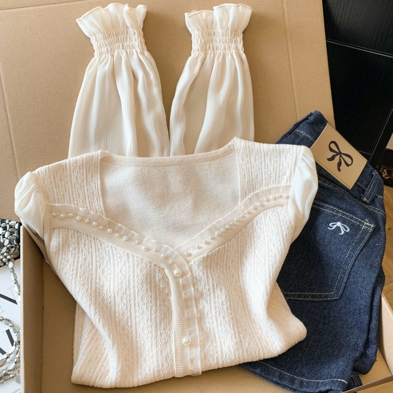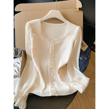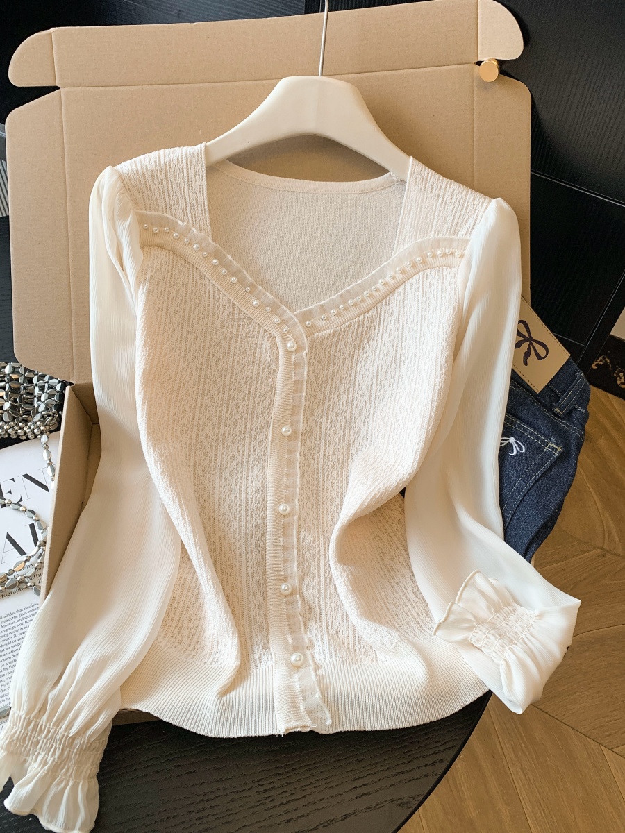 BY10692# 春季新款提花针织拼接雪纺衫法式方领轻奢钉珠上衣衬衫 服裝批發女裝批發服飾貨源
