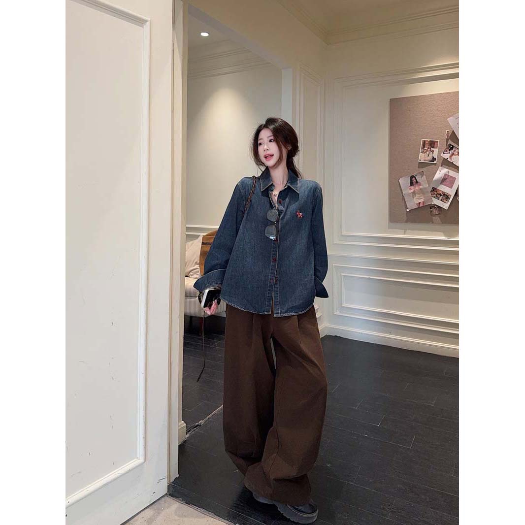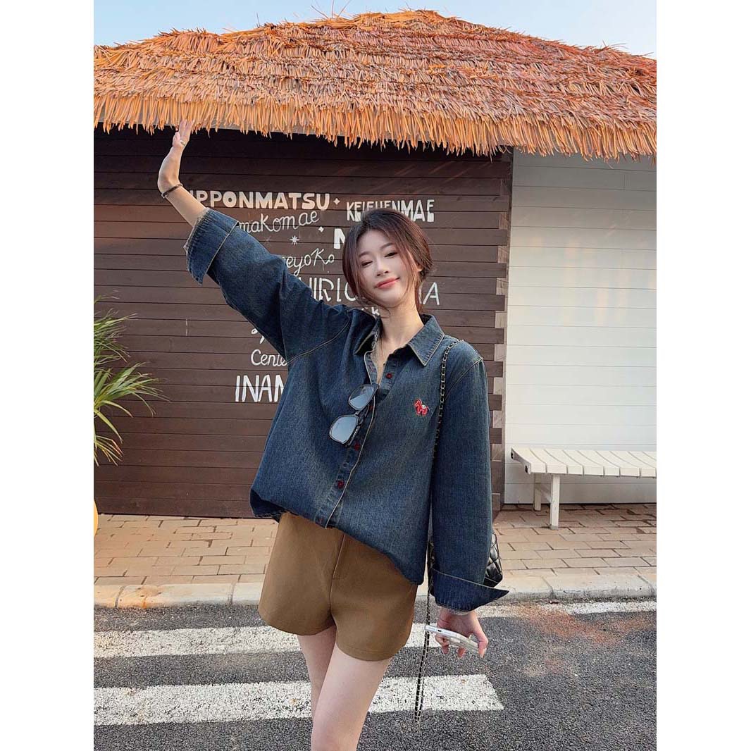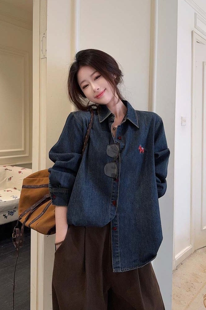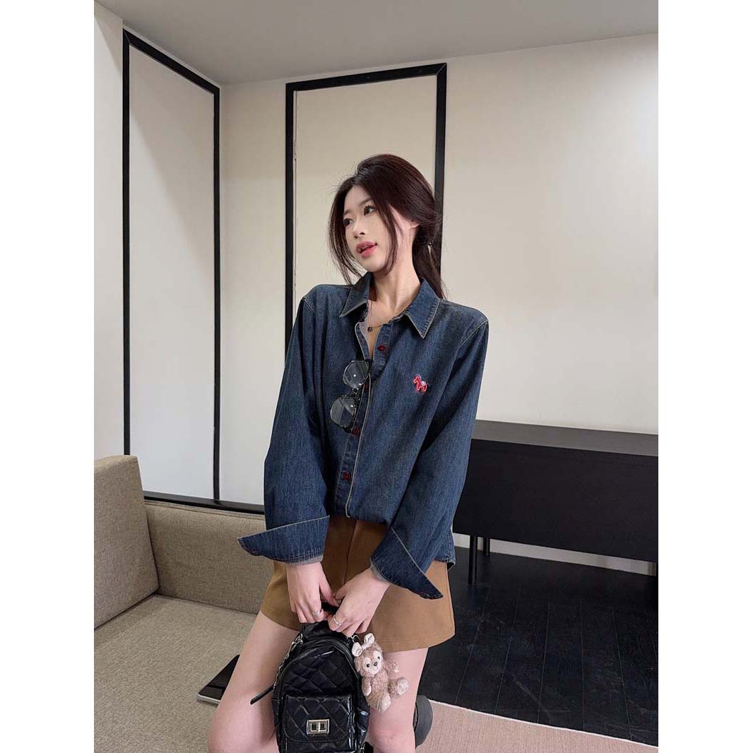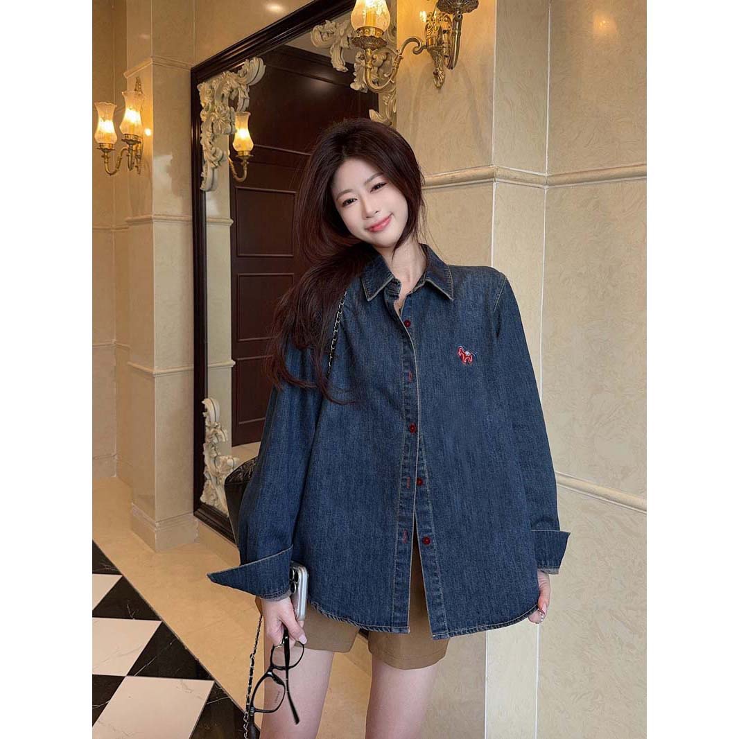 BY10830# 小马刺绣复古做旧牛仔衬衫女港风休闲百搭翻领长袖上衣 服裝批發女裝批發服飾貨源