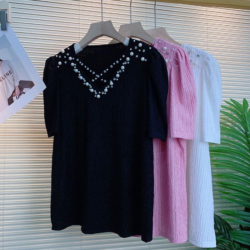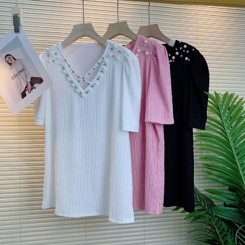 胖MM300斤大码宽松重工钉珠V领显瘦遮肉减龄中长款打底短袖上衣女 服裝批發女裝批發服飾貨源