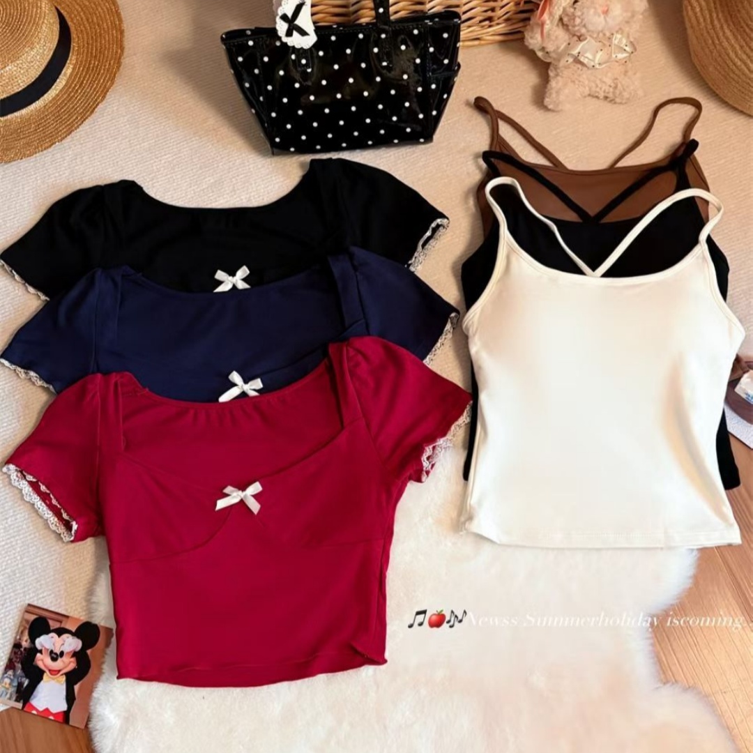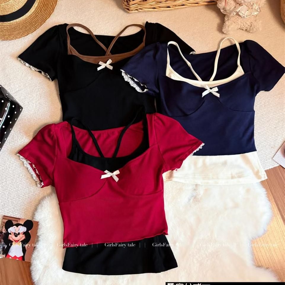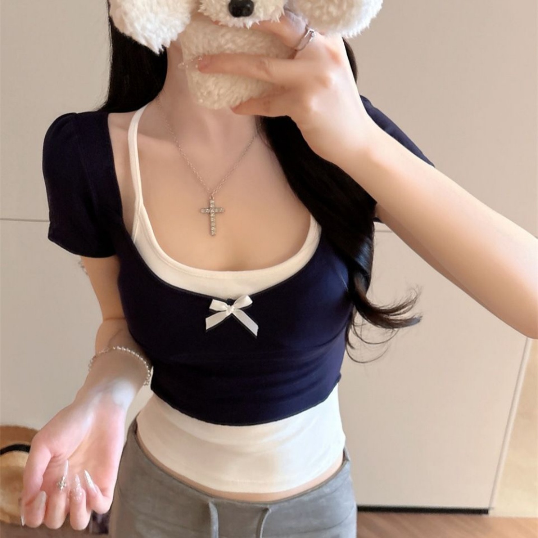 BY11264# 夏季新款辣妹风两件套撞色设计短款T恤修身显瘦固定带胸垫女 服裝批發女裝批發服飾貨源