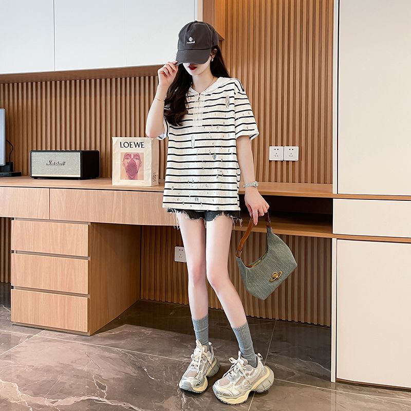 BY11275# 蕾丝连帽T恤女装新款春秋季洋气减龄宽松设计感条纹上衣 服裝批發女裝批發服飾貨源