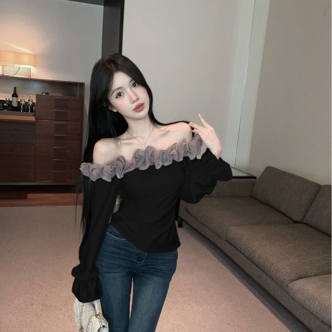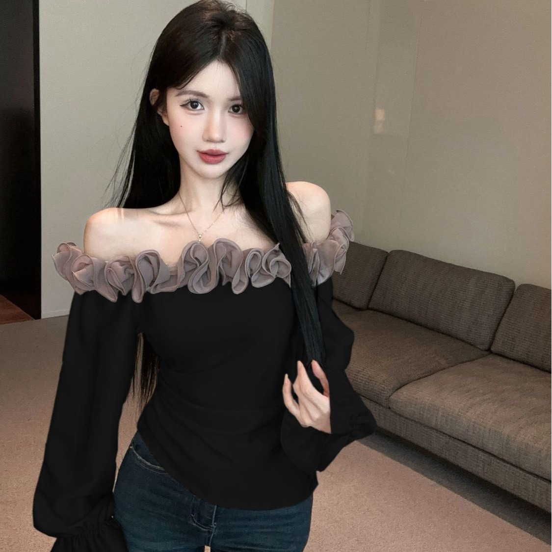 BY11458# 高级感轻奢减龄洋气一字肩上衣超好看独特漂亮衬衫女春 服裝批發女裝批發服飾貨源