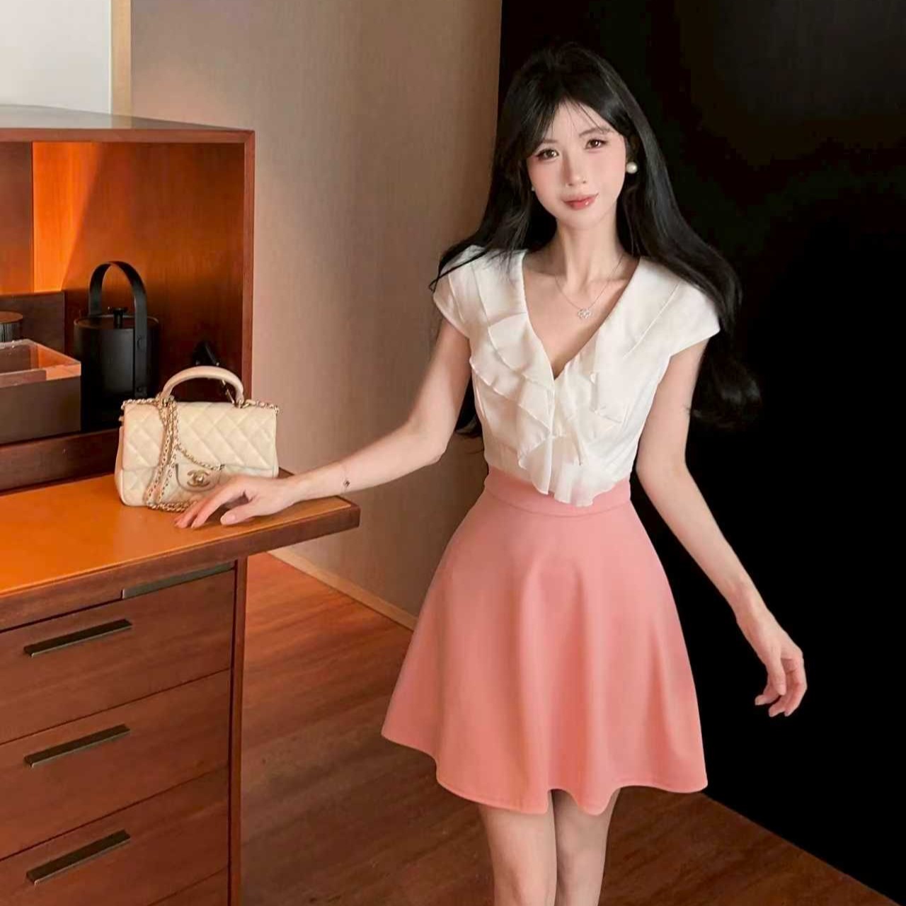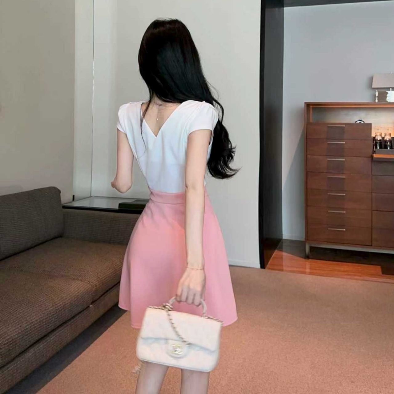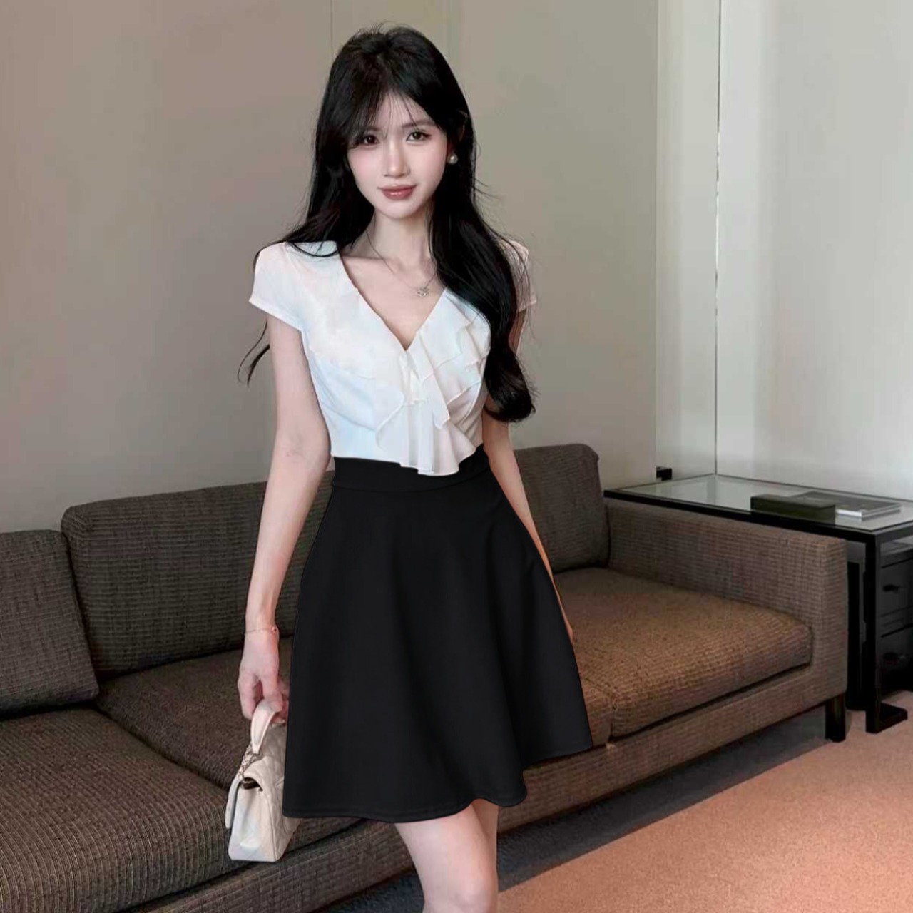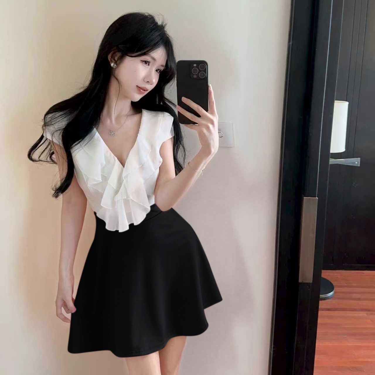 Home > 短袖连衣裙、夜店装 > BY11472# 性感v领雪纺拼接撞色收腰大摆连衣裙 服裝批發女裝批發服飾貨源