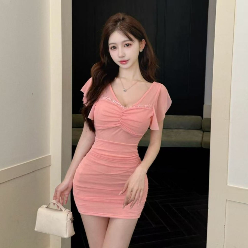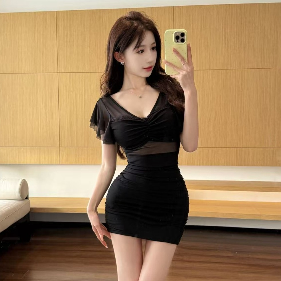BY11475# 辣妹性感网纱飞飞袖打底短款包臀连衣裙女纯欲V领修身显瘦短裙子 服裝批發女裝批發服飾貨源