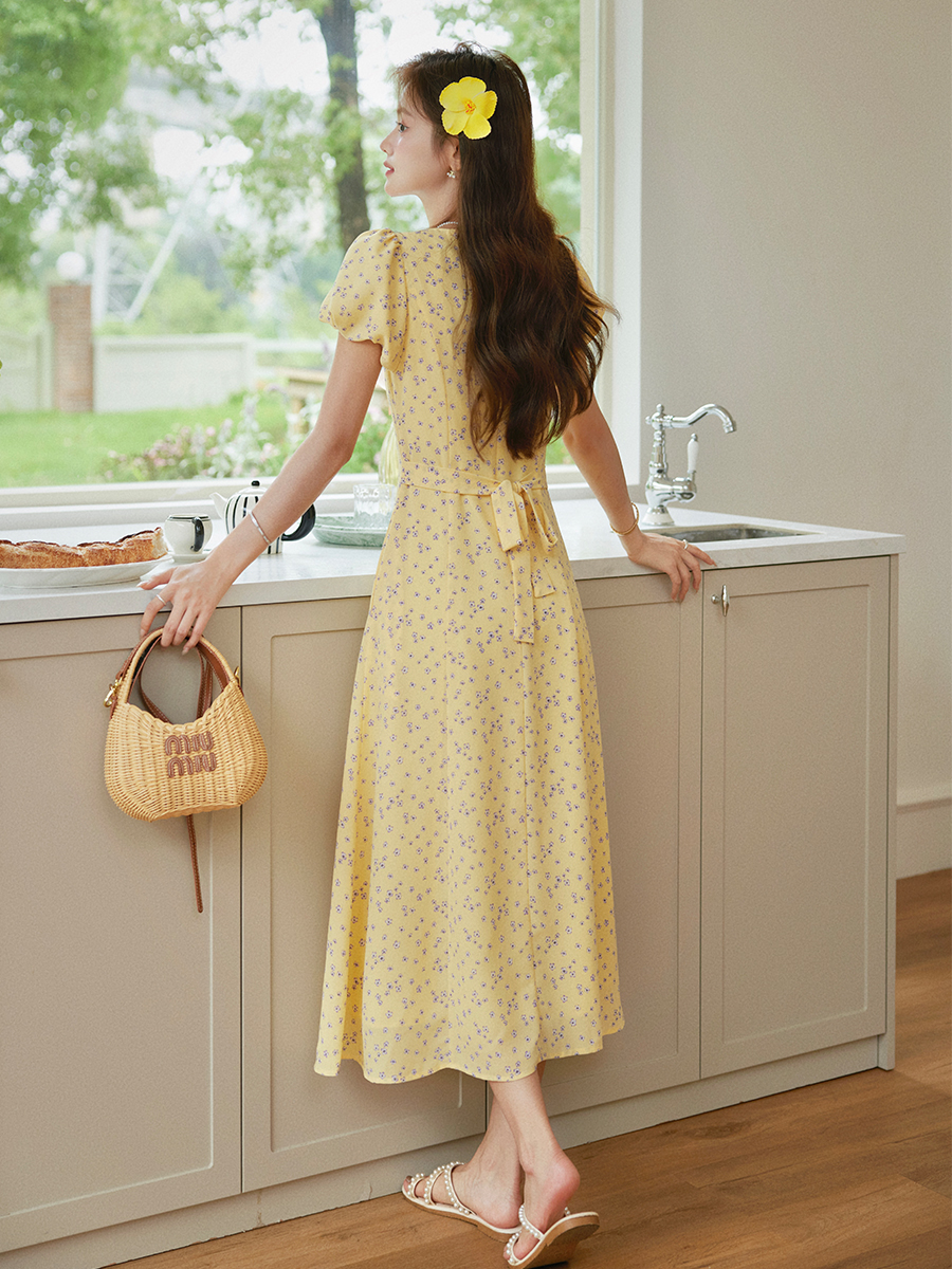 BY11497# 法式浪漫氛围感小众裙子优雅气质V领收腰显瘦碎花连衣裙 服裝批發女裝批發服飾貨源