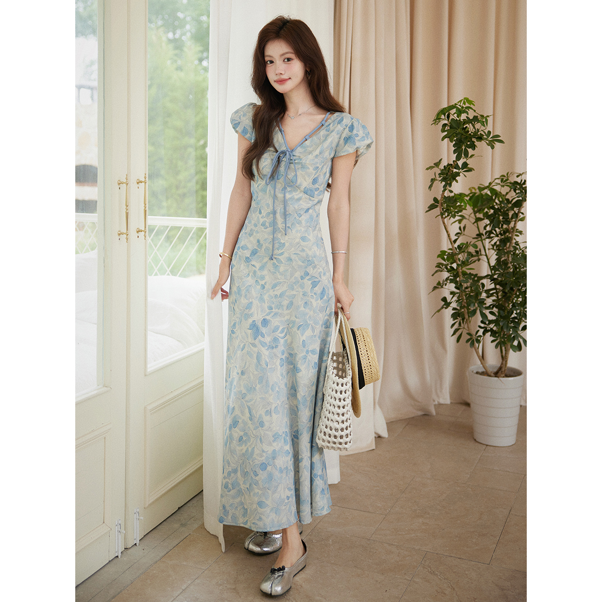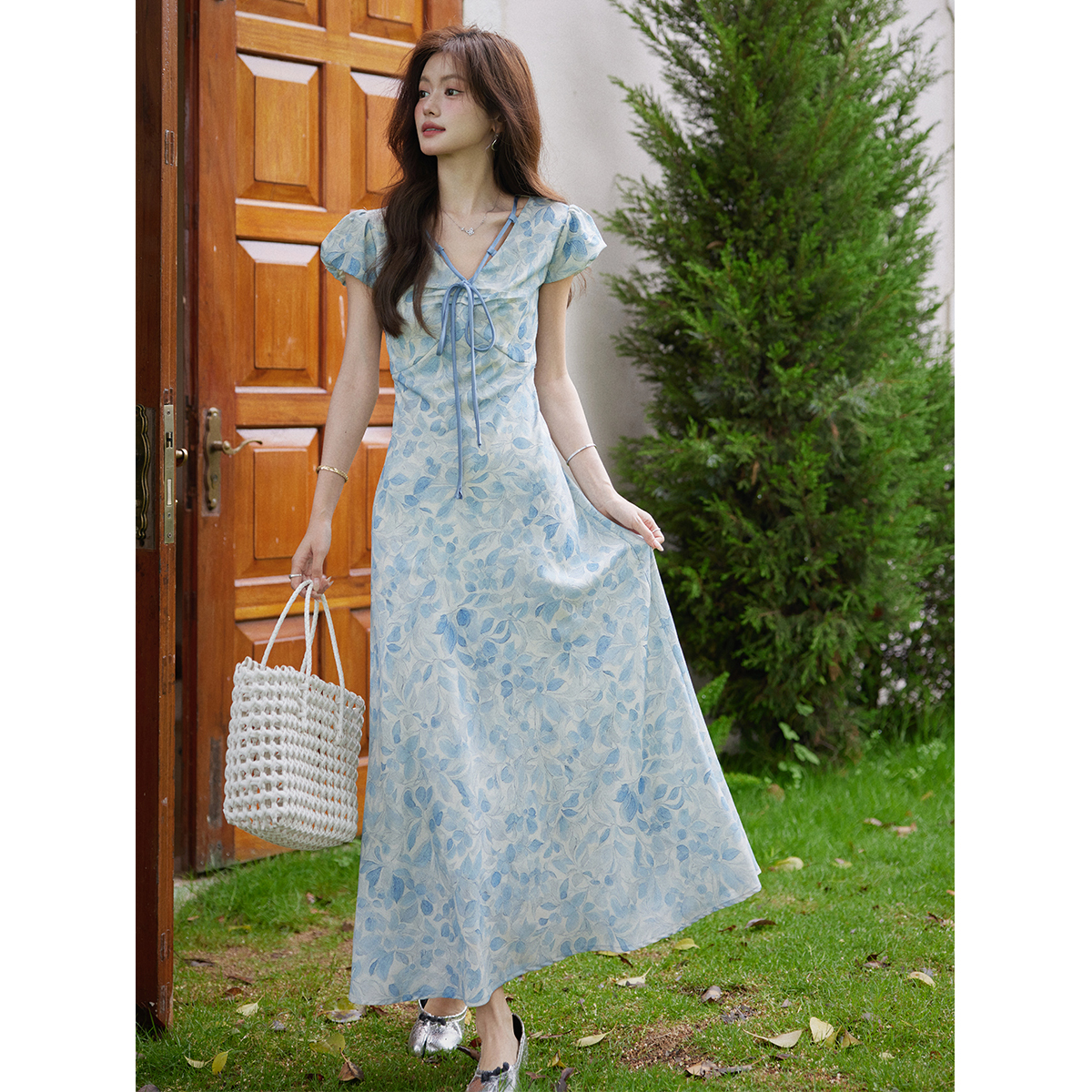 BY11500# 春夏新款A字收腰优雅气质显白蓝色印花法式短袖连衣裙 服裝批發女裝批發服飾貨源