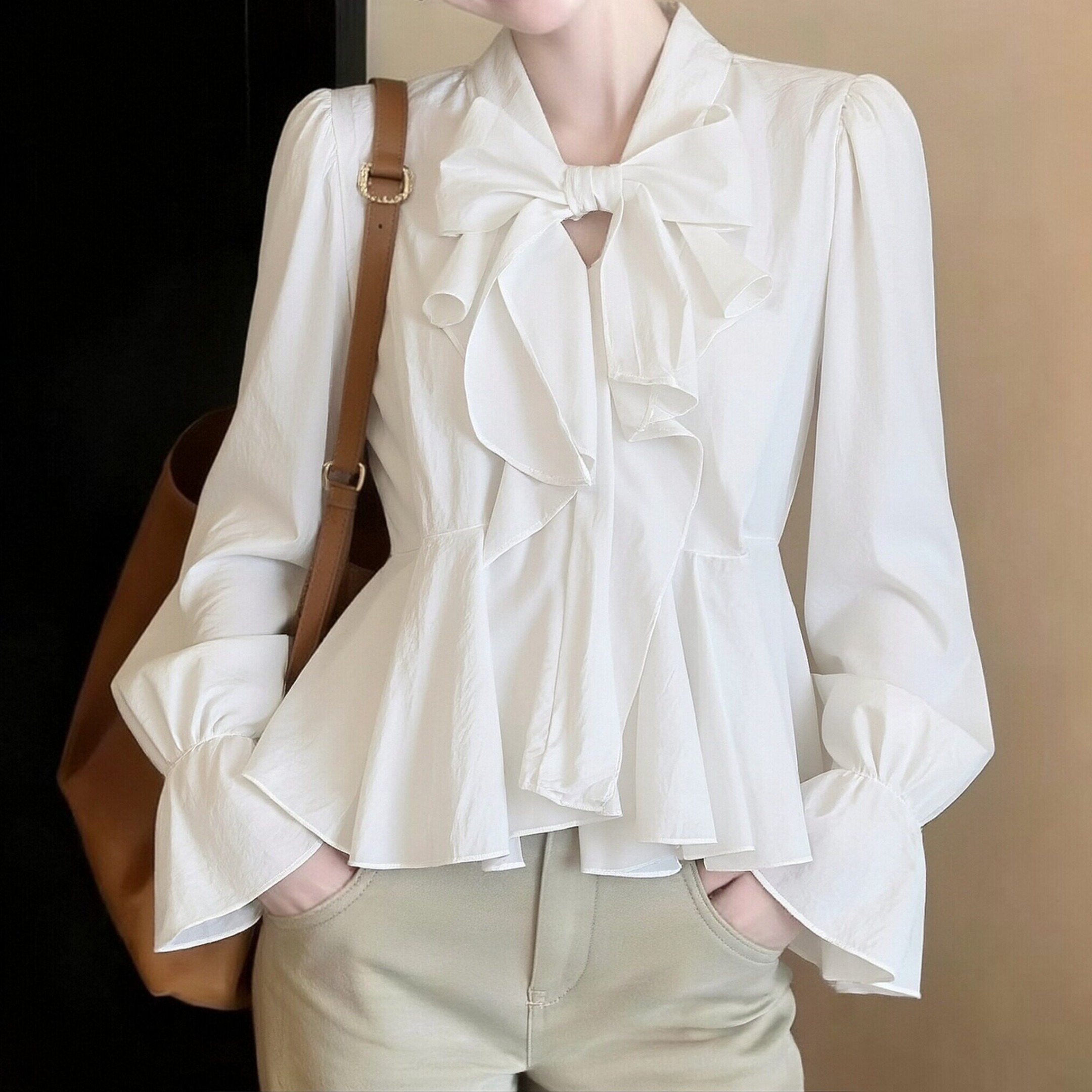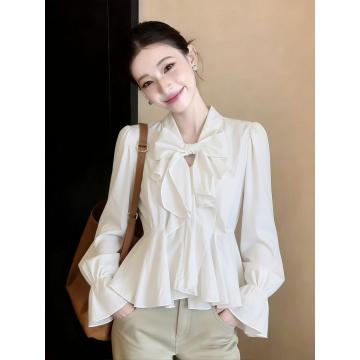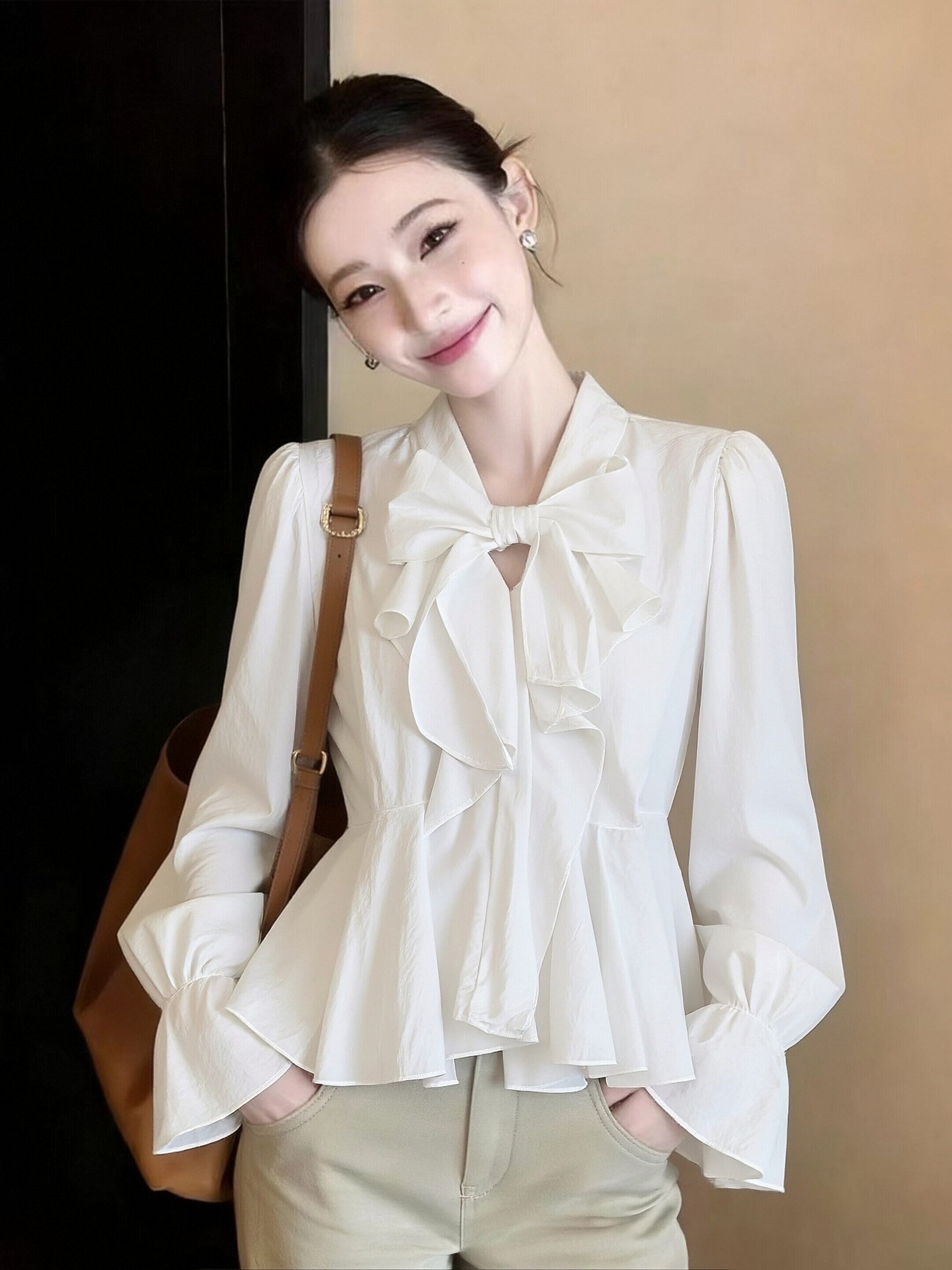 BY11518# 法式荷叶边系带白色衬衫女早春新款时尚百搭显瘦遮肚漂亮上衣 服裝批發女裝批發服飾貨源