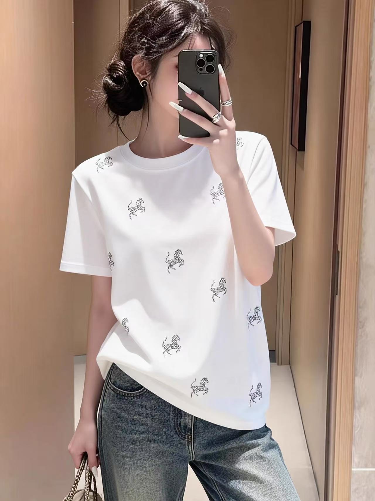 BY11533# 韩系设计感重工烫钻马年图案正肩短袖T恤女新款大码宽松显瘦上衣 服裝批發女裝批發服飾貨源