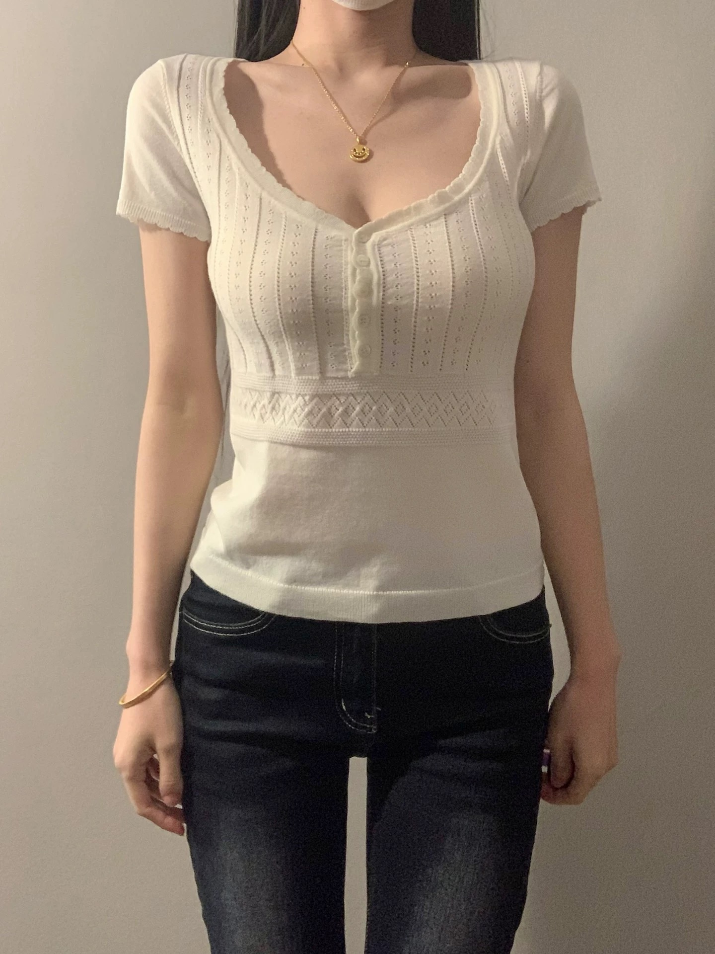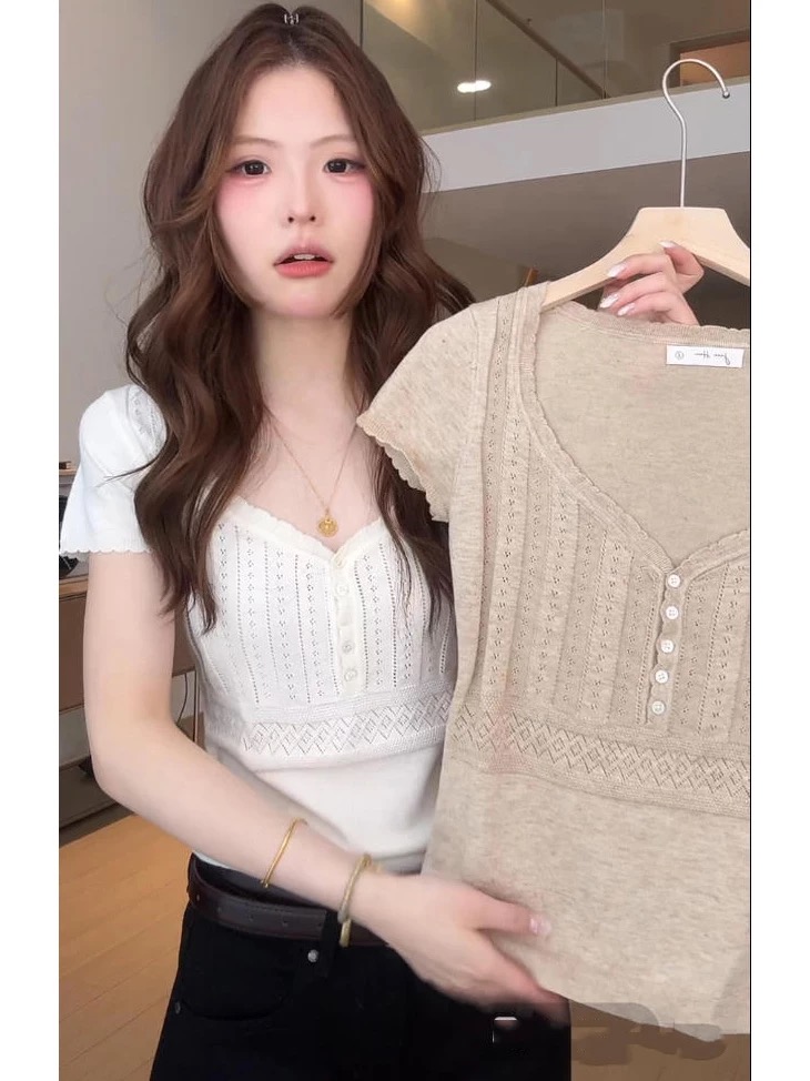 BY11556# 韩系设计感纽扣低领短袖t恤女夏季新款收腰显瘦百搭短款上衣 服裝批發女裝批發服飾貨源