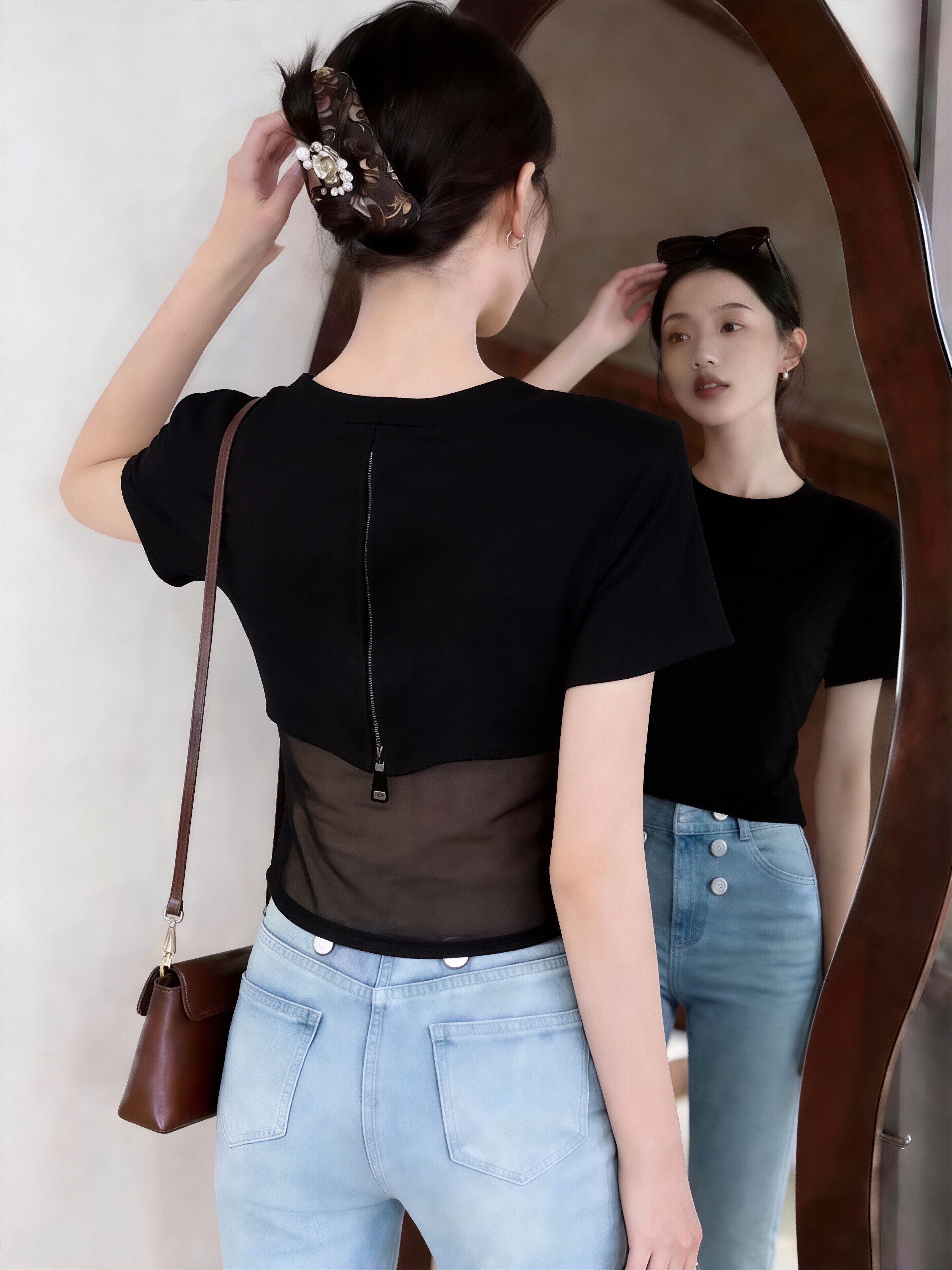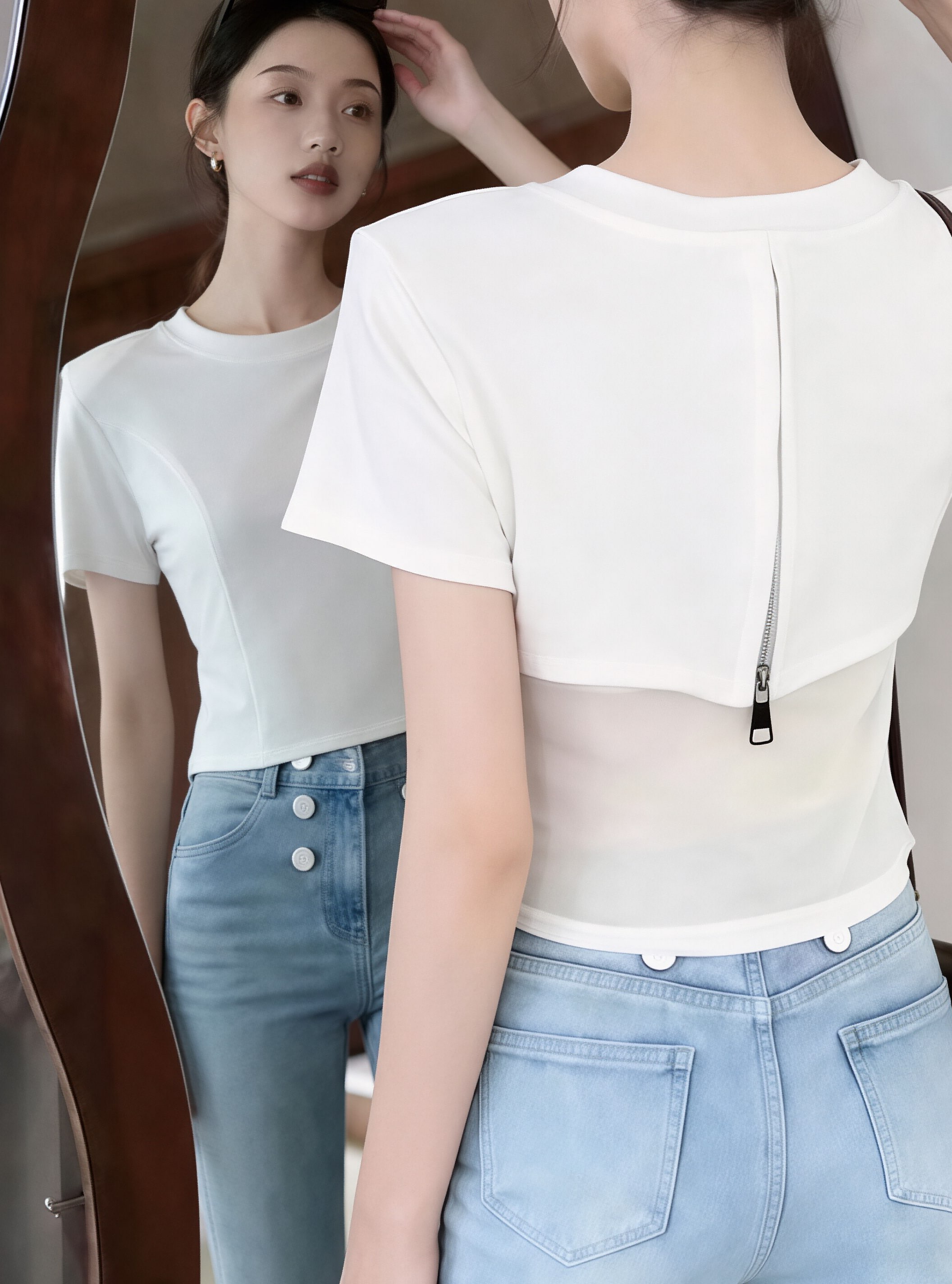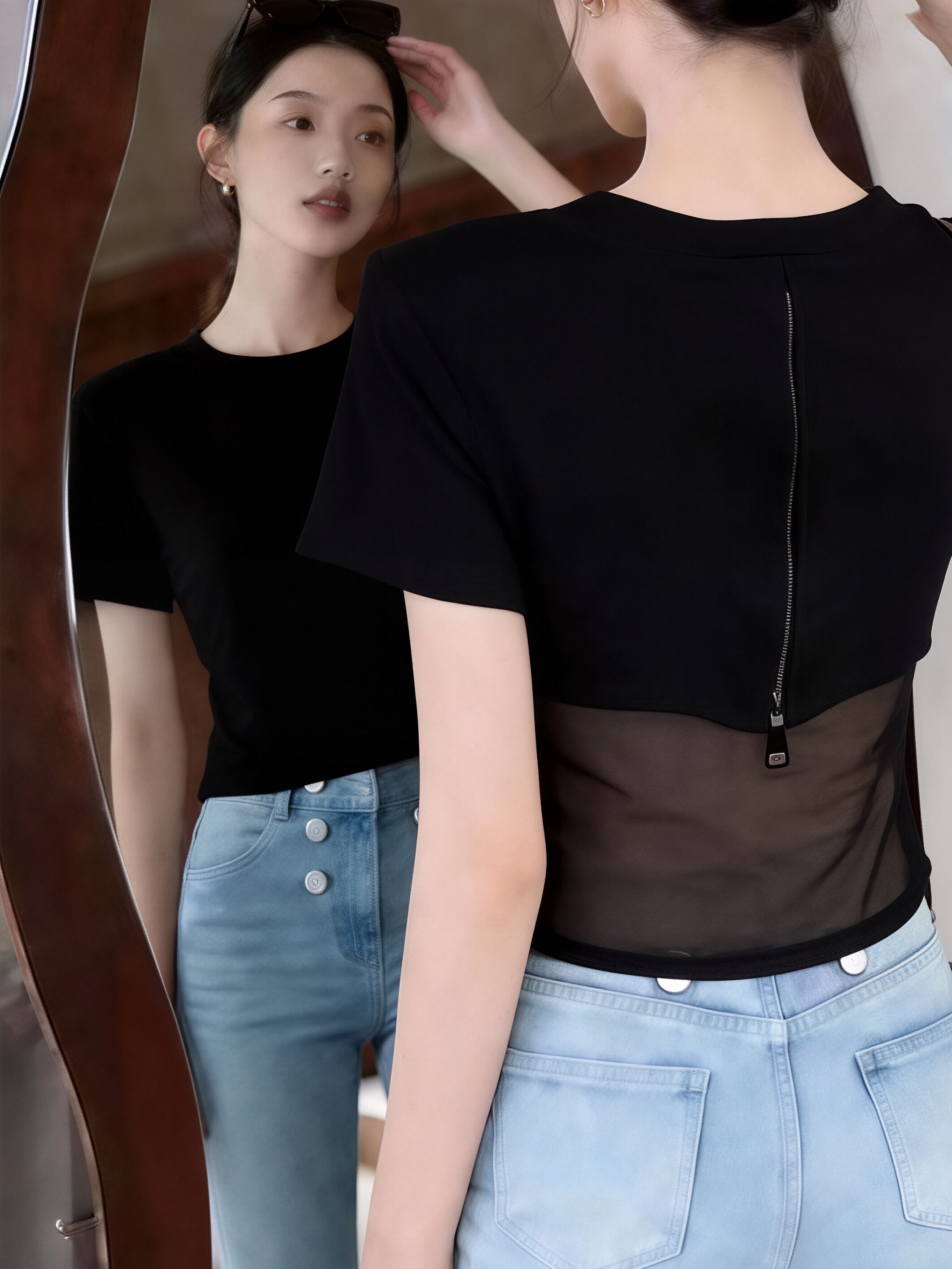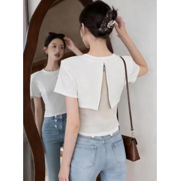 BY11561# 新款设计感辣妹后背网纱拼接拉链短袖t外搭打底衫上衣 服裝批發女裝批發服飾貨源