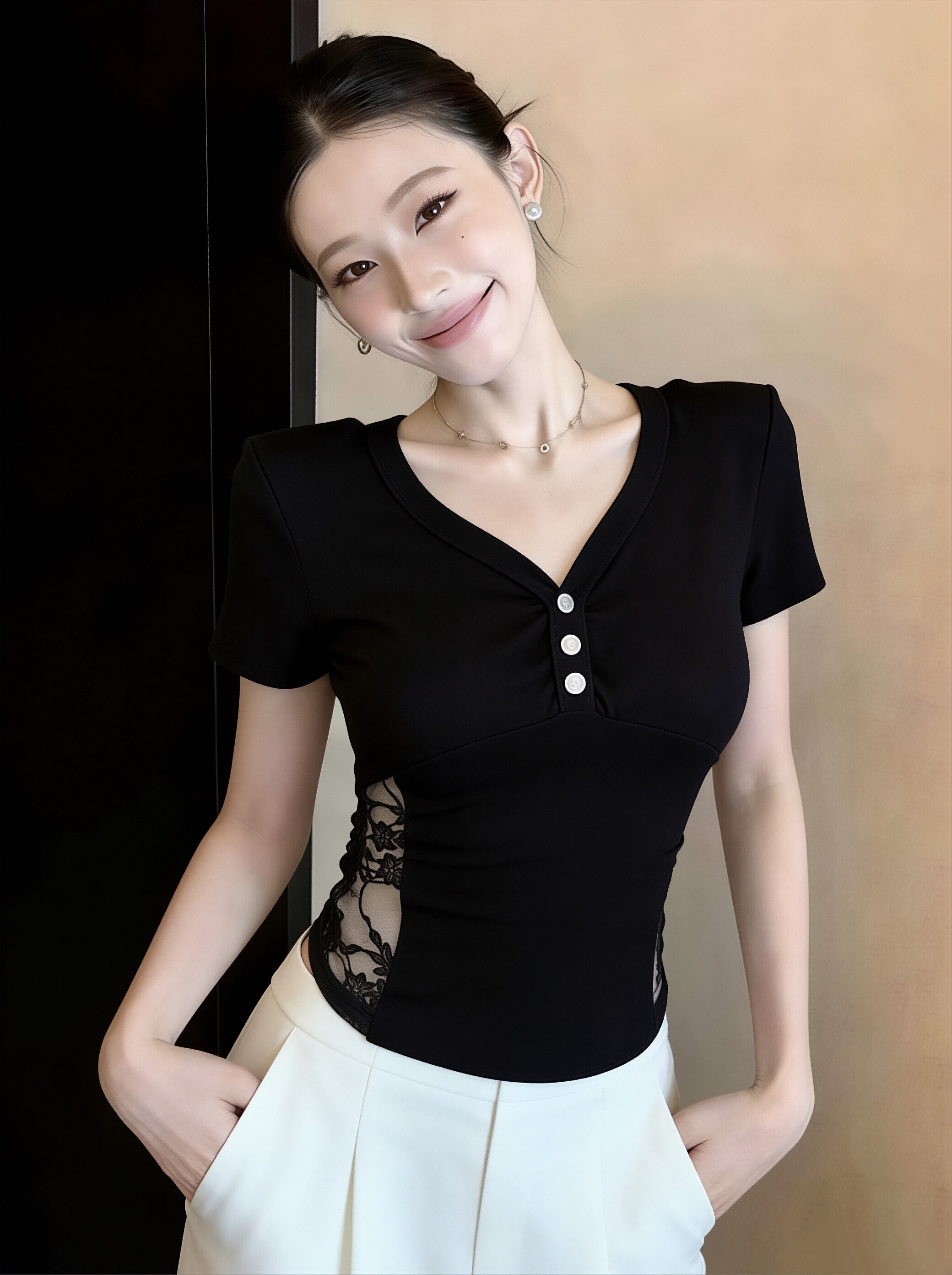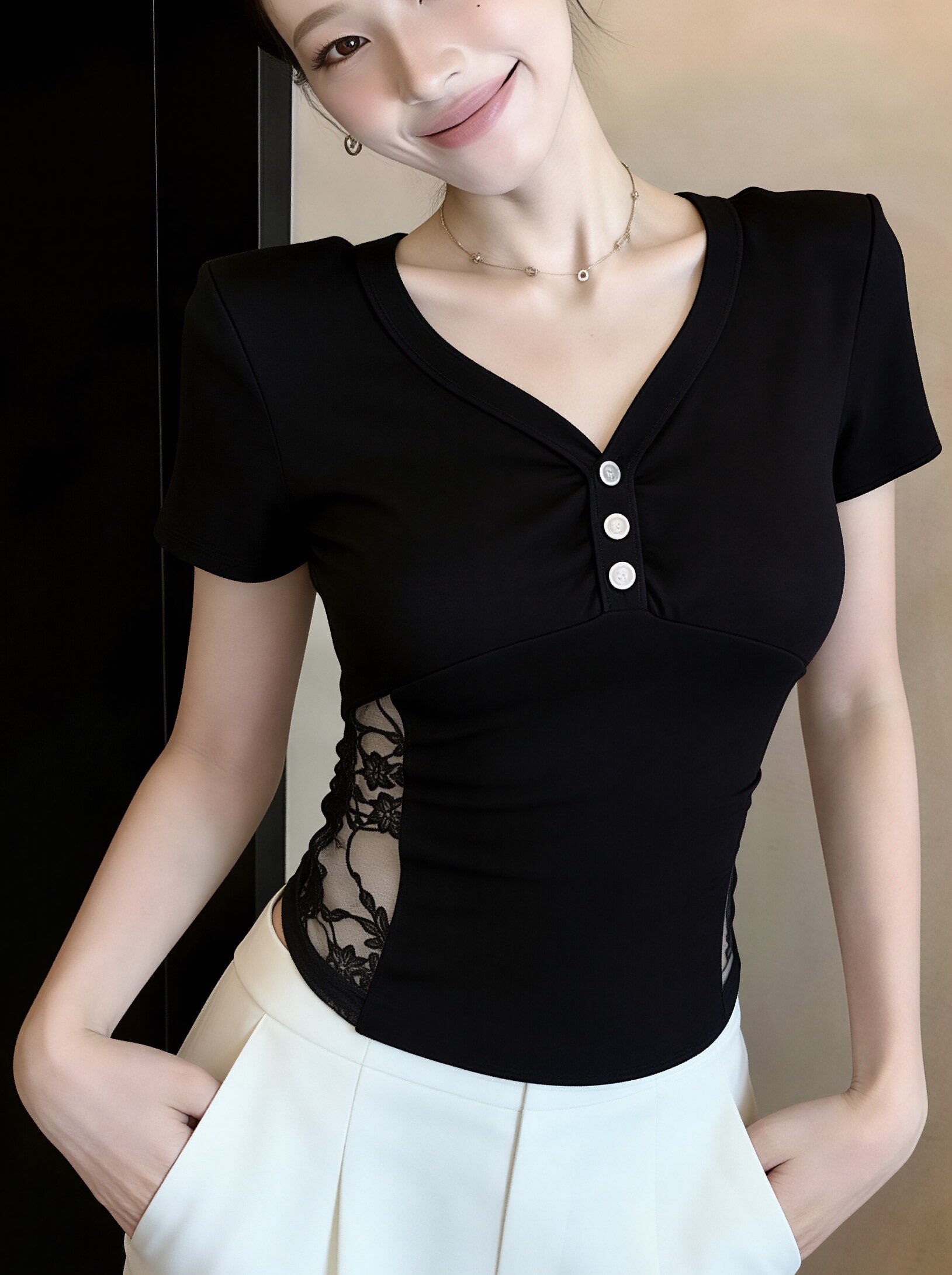 BY11562# 韩版时尚镂空蕾丝拼接V领长袖T恤女新款打底衫收腰上衣 服裝批發女裝批發服飾貨源