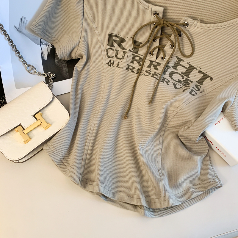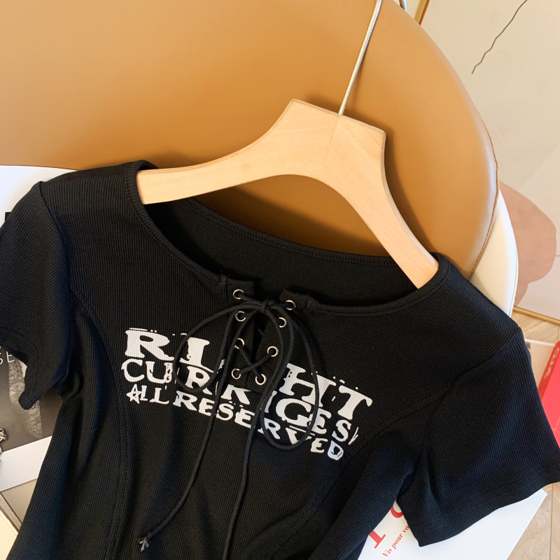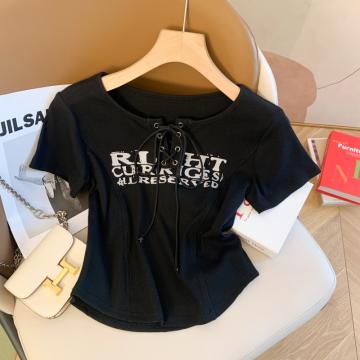 BY11584# 设计感小众印花交叉绑带修身显瘦短款辣妹短袖T恤女上衣 服裝批發女裝批發服飾貨源