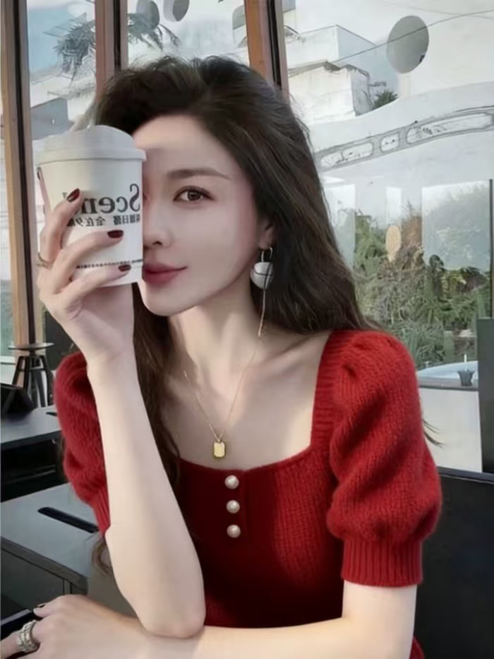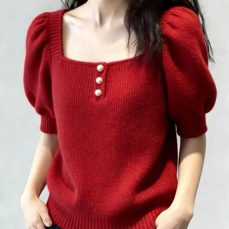 BY11743# 胖MM法式红色方领泡泡袖针织上衣女春季新款短袖百搭减龄通勤 服裝批發女裝批發服飾貨源