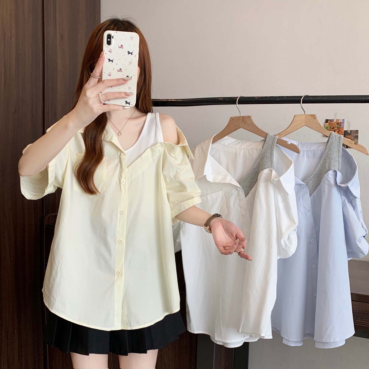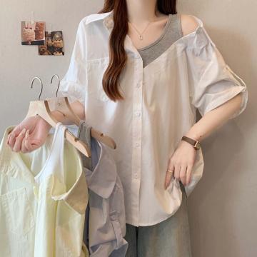 BY11893# 夏季新款针织拼接个性法式衬衣女大码宽松百搭休闲上衣 服裝批發女裝批發服飾貨源