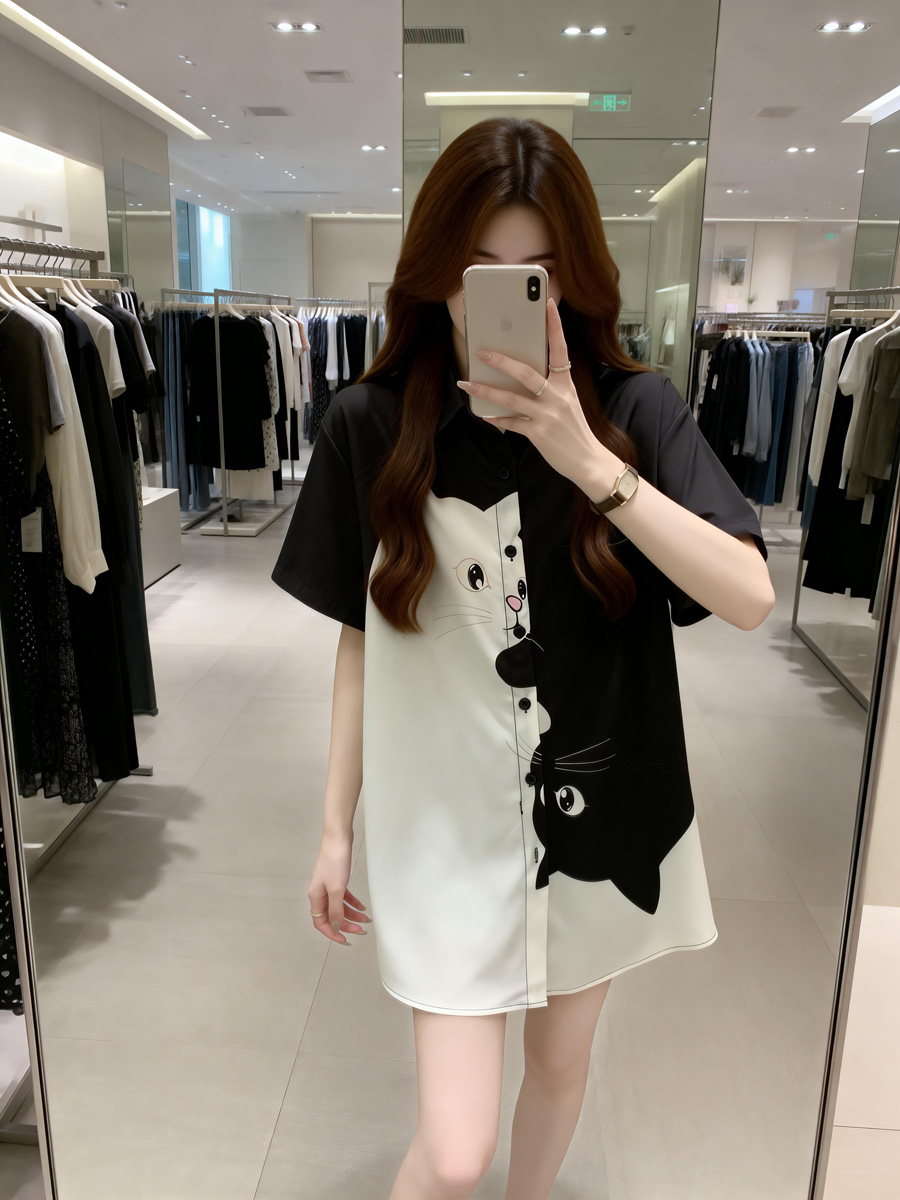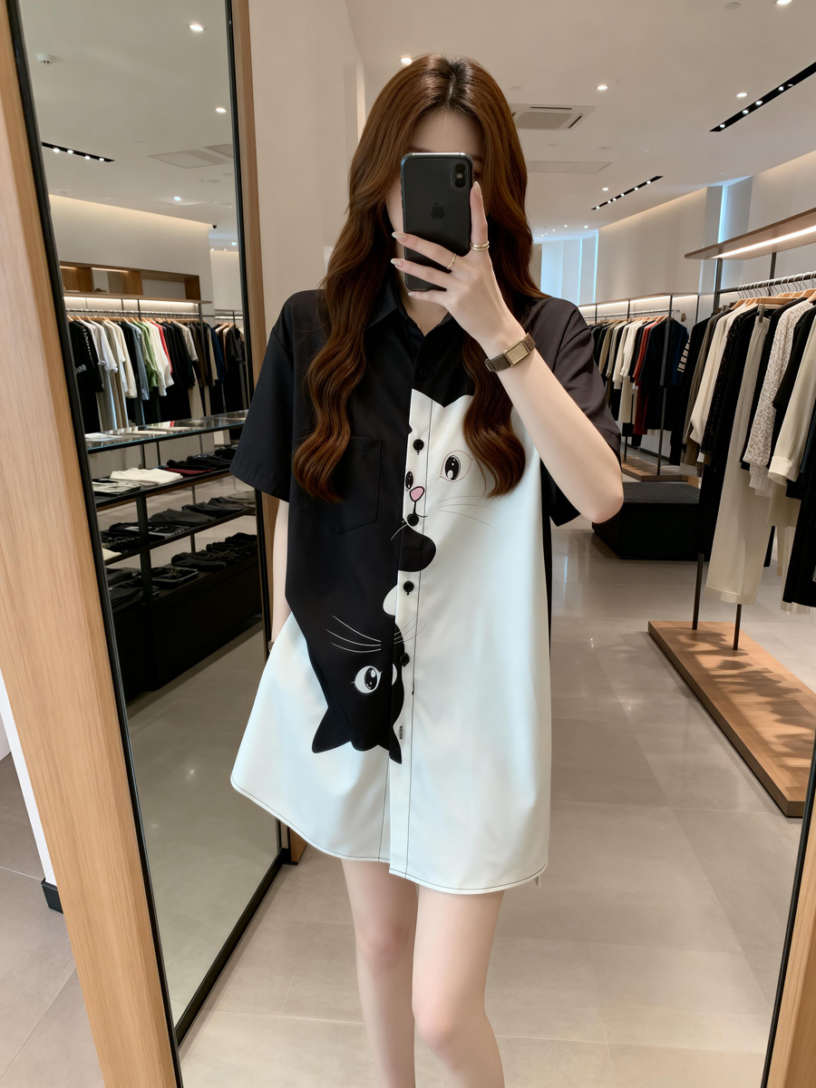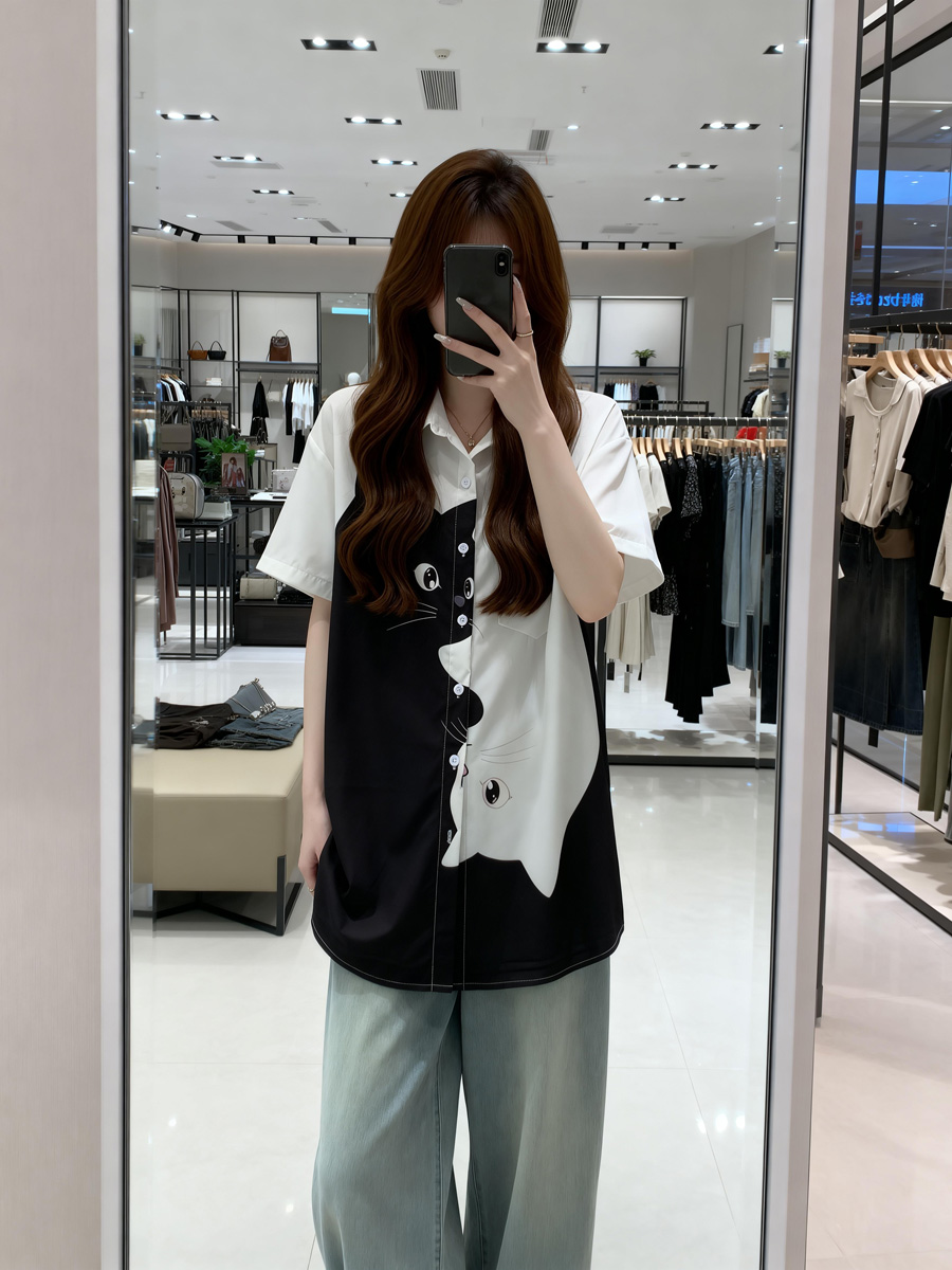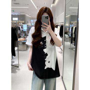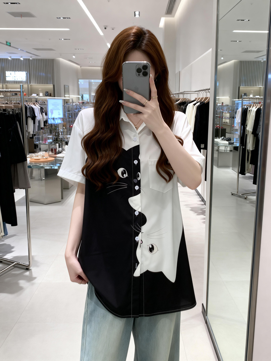 BY11903# 夏季新款卡通立体猫咪印花百搭衬衣女大码宽松休闲上衣 服裝批發女裝批發服飾貨源