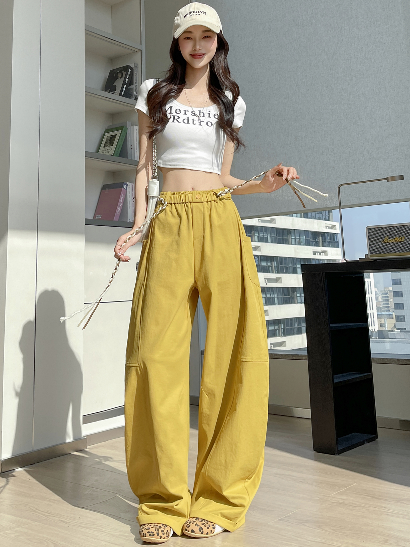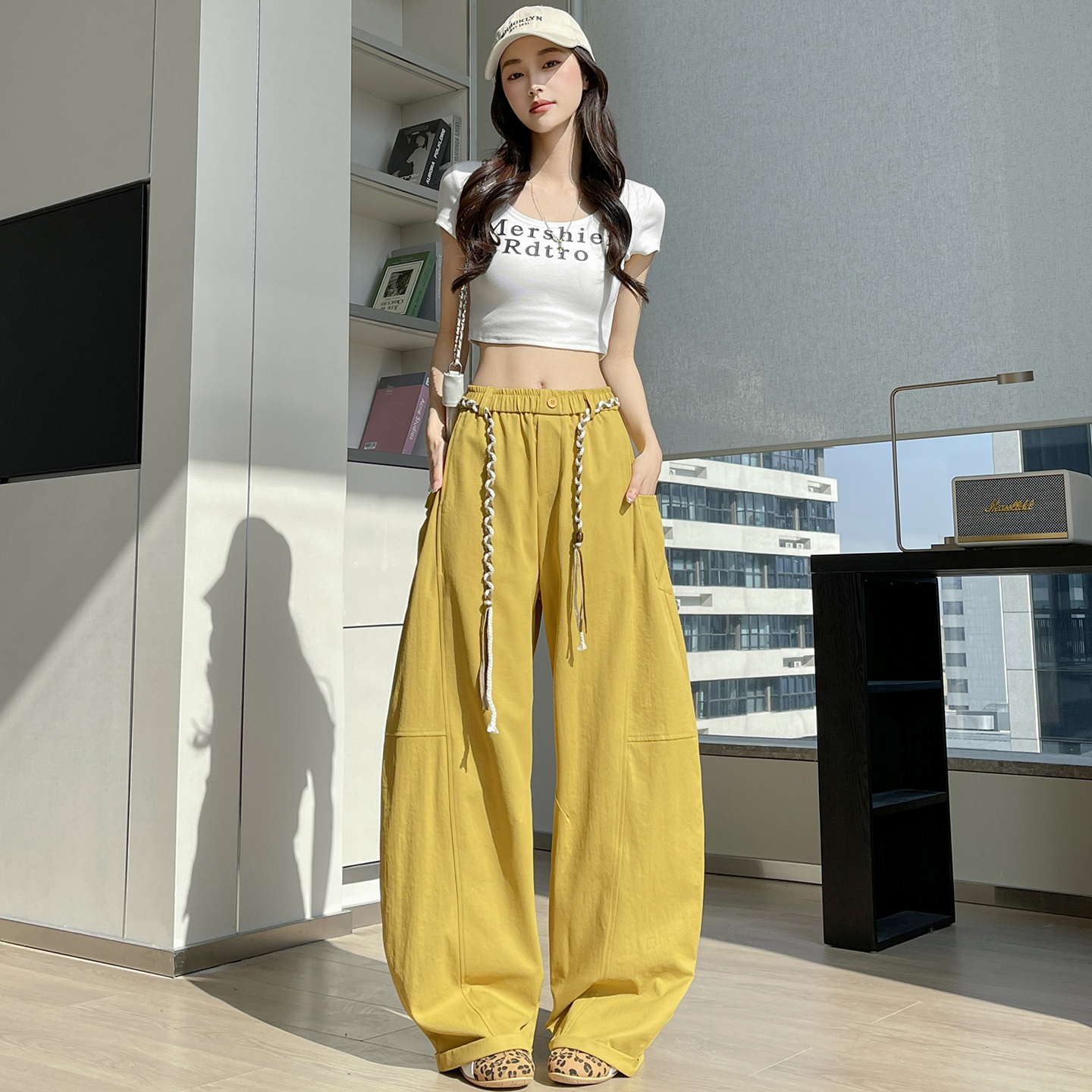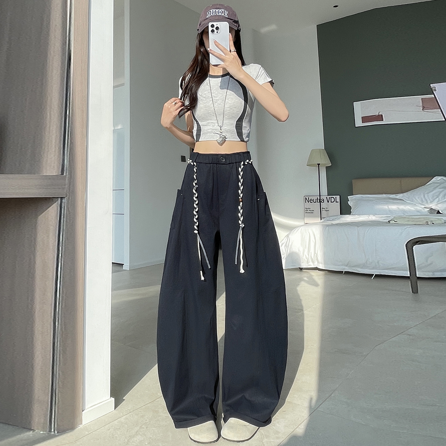 BY11939# 春季新款拼接设计感休闲阔腿裤女百搭宽松显瘦弯刀拖地长裤 服裝批發女裝批發服飾貨源