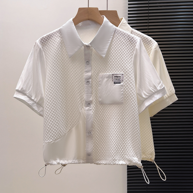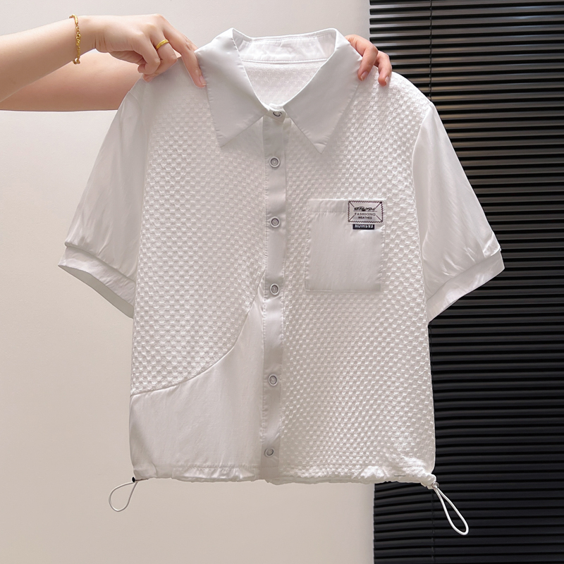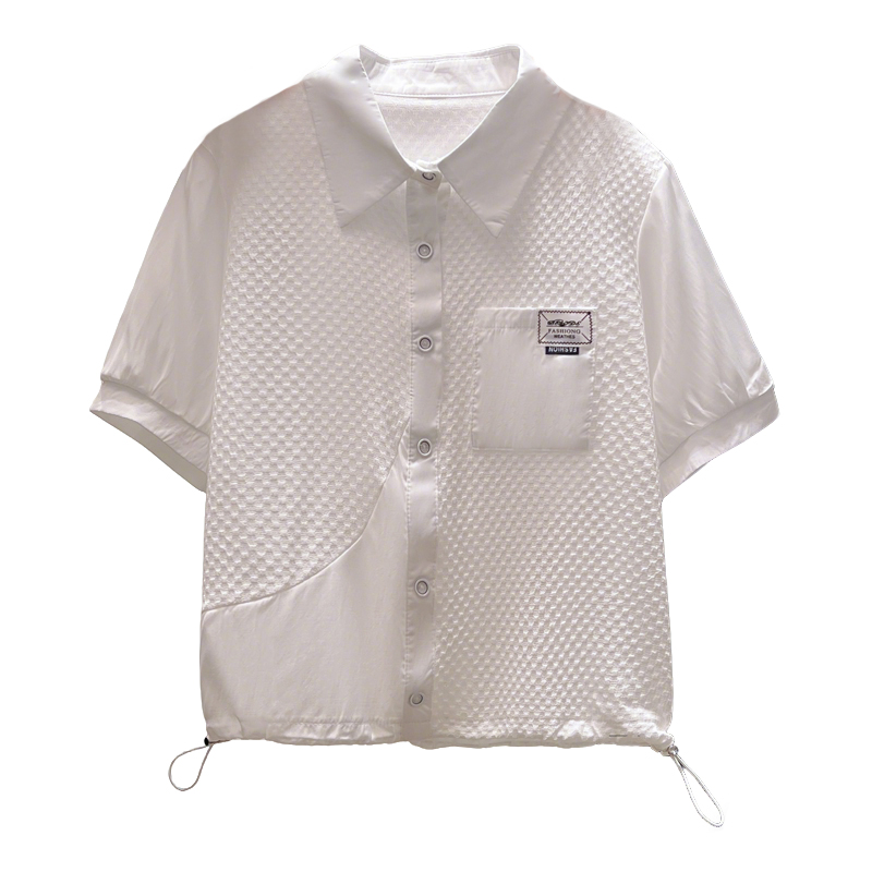 BY11976# 夏季新款时尚洋气假两件拼接短袖白色衬衫女时尚减龄小衫抽绳上衣 服裝批發女裝批發服飾貨源