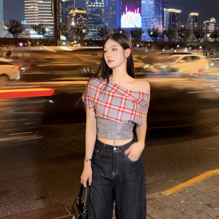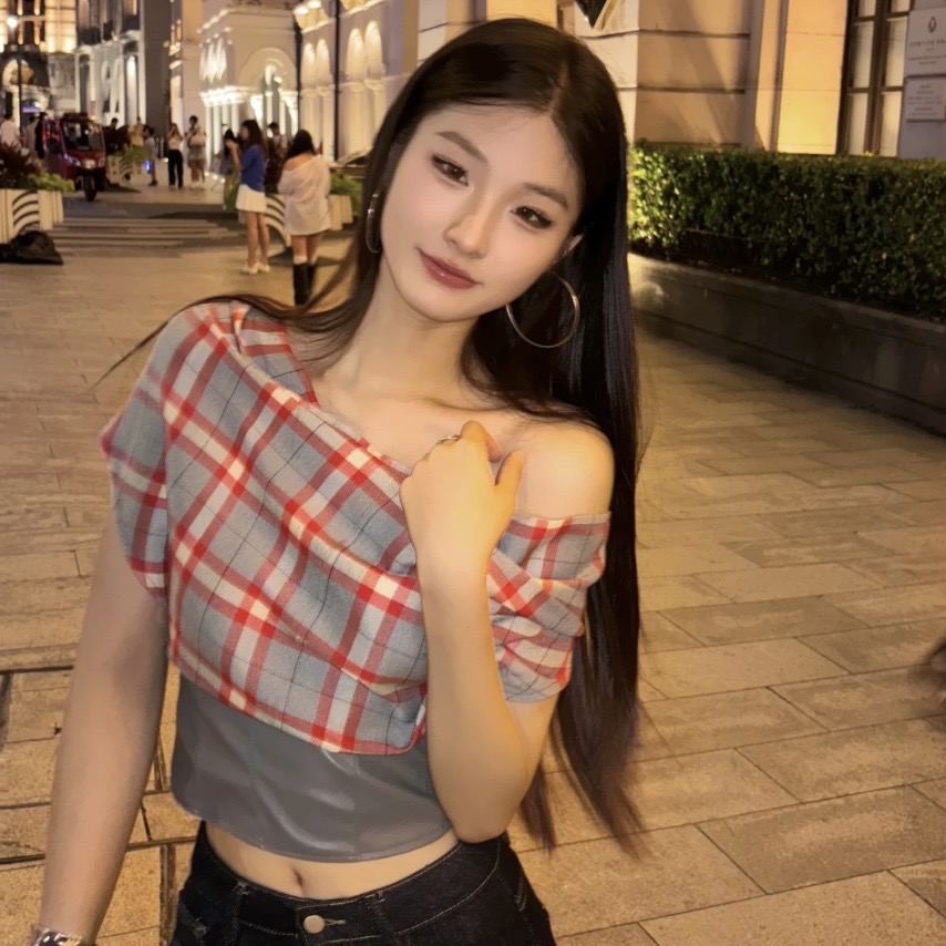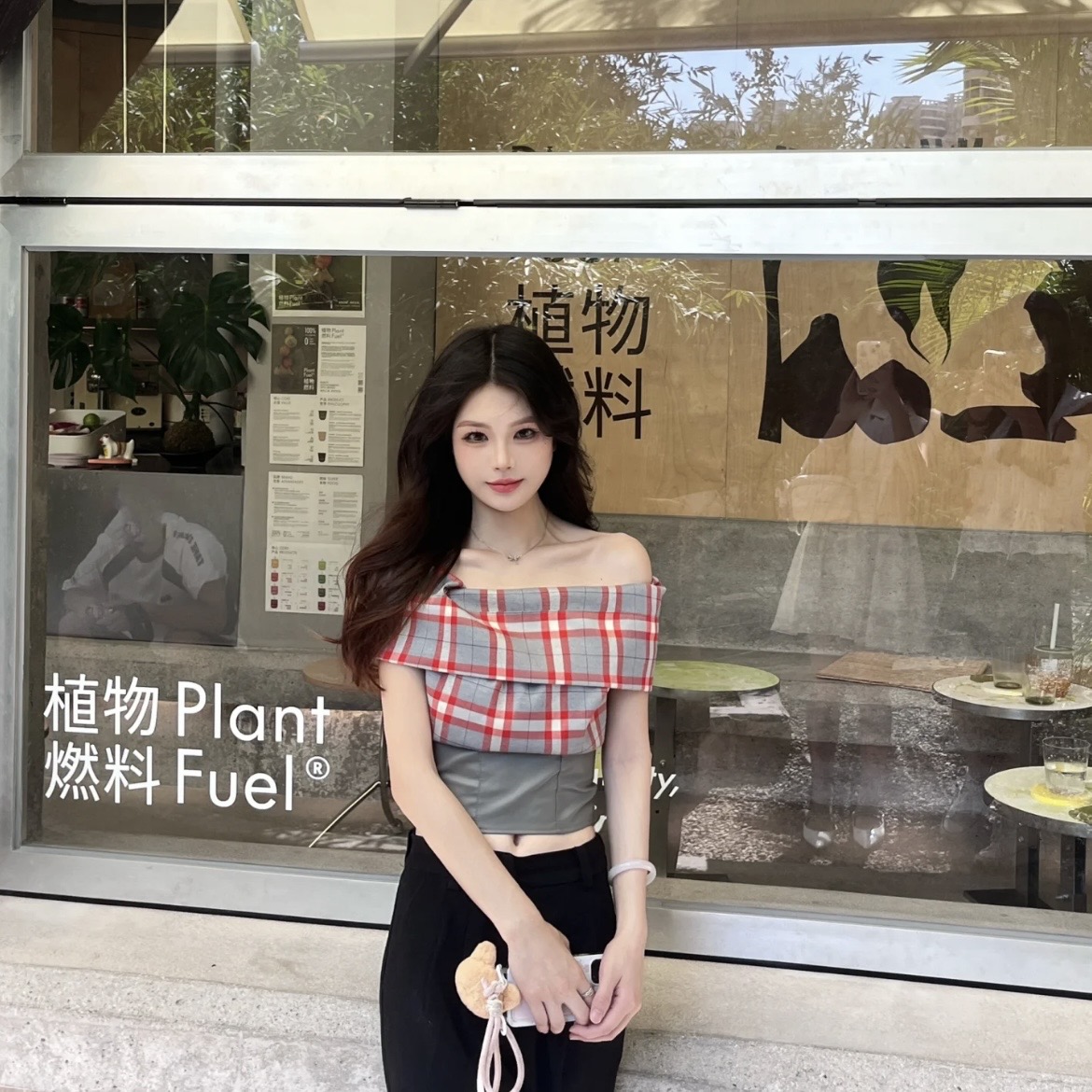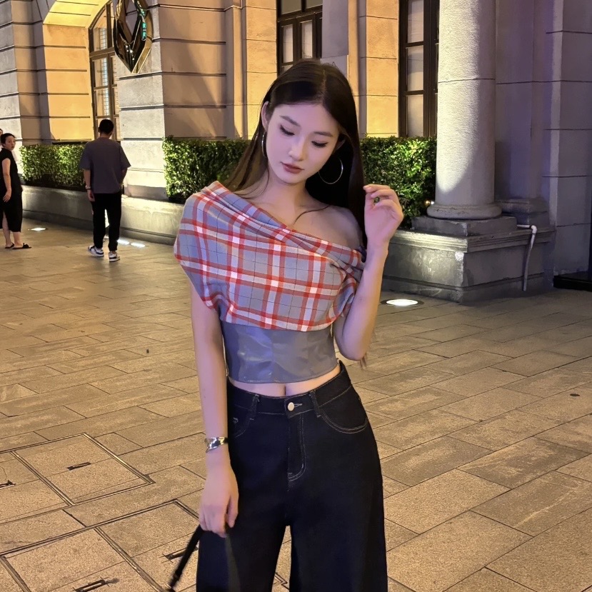 BY12141# 复古格纹短袖挂脖T恤设计感小众露背短款一字领上衣 服裝批發女裝批發服飾貨源