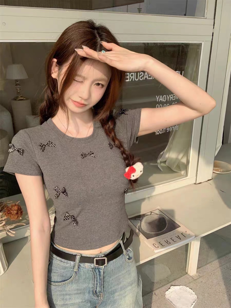 BY12146# 圆领蝴蝶结t恤女甜美小个子设计感小众正肩短袖上衣 服裝批發女裝批發服飾貨源