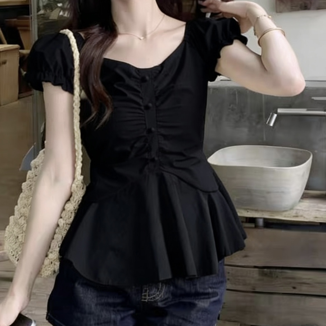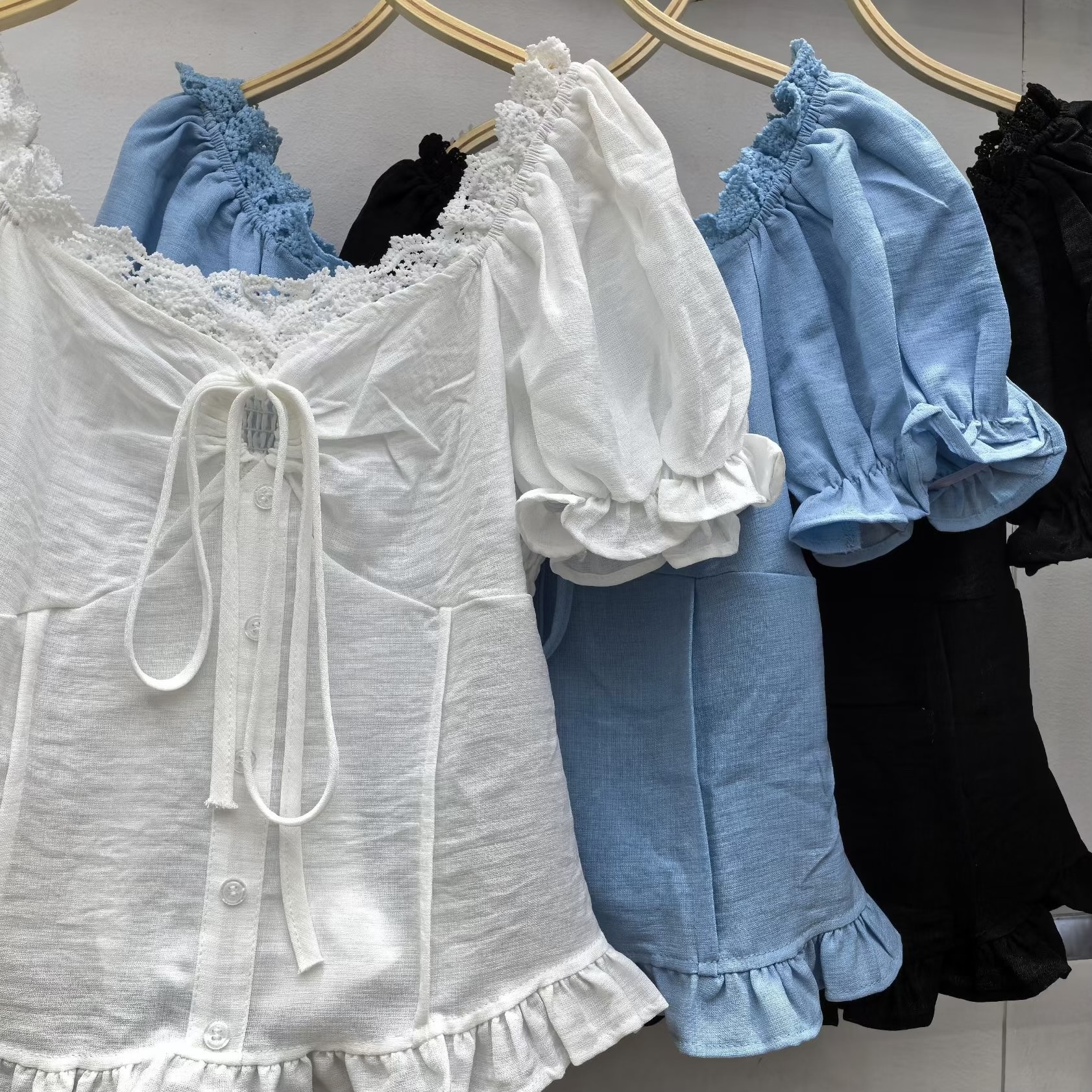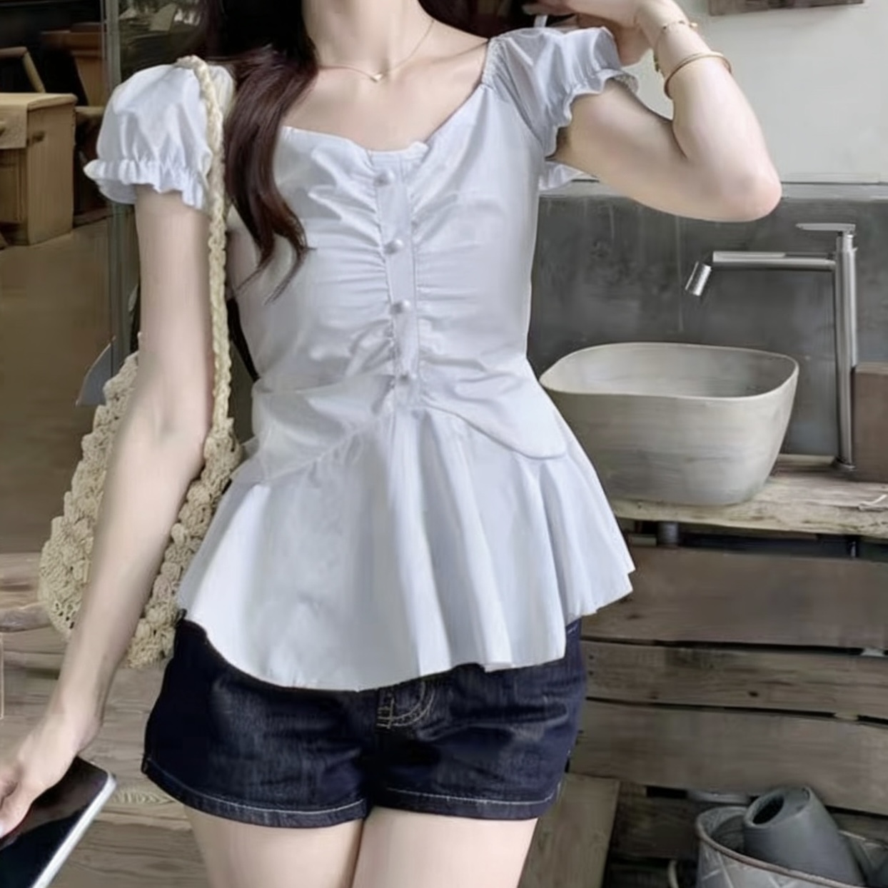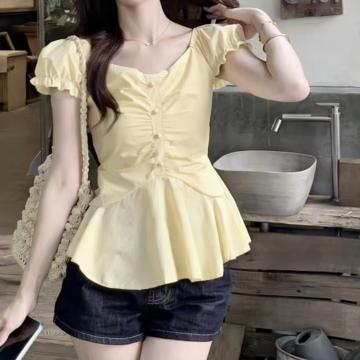 BY12156# 新款度假风夏季洋气轻法式V领捏褶泡泡袖花边小衫女上衣 服裝批發女裝批發服飾貨源