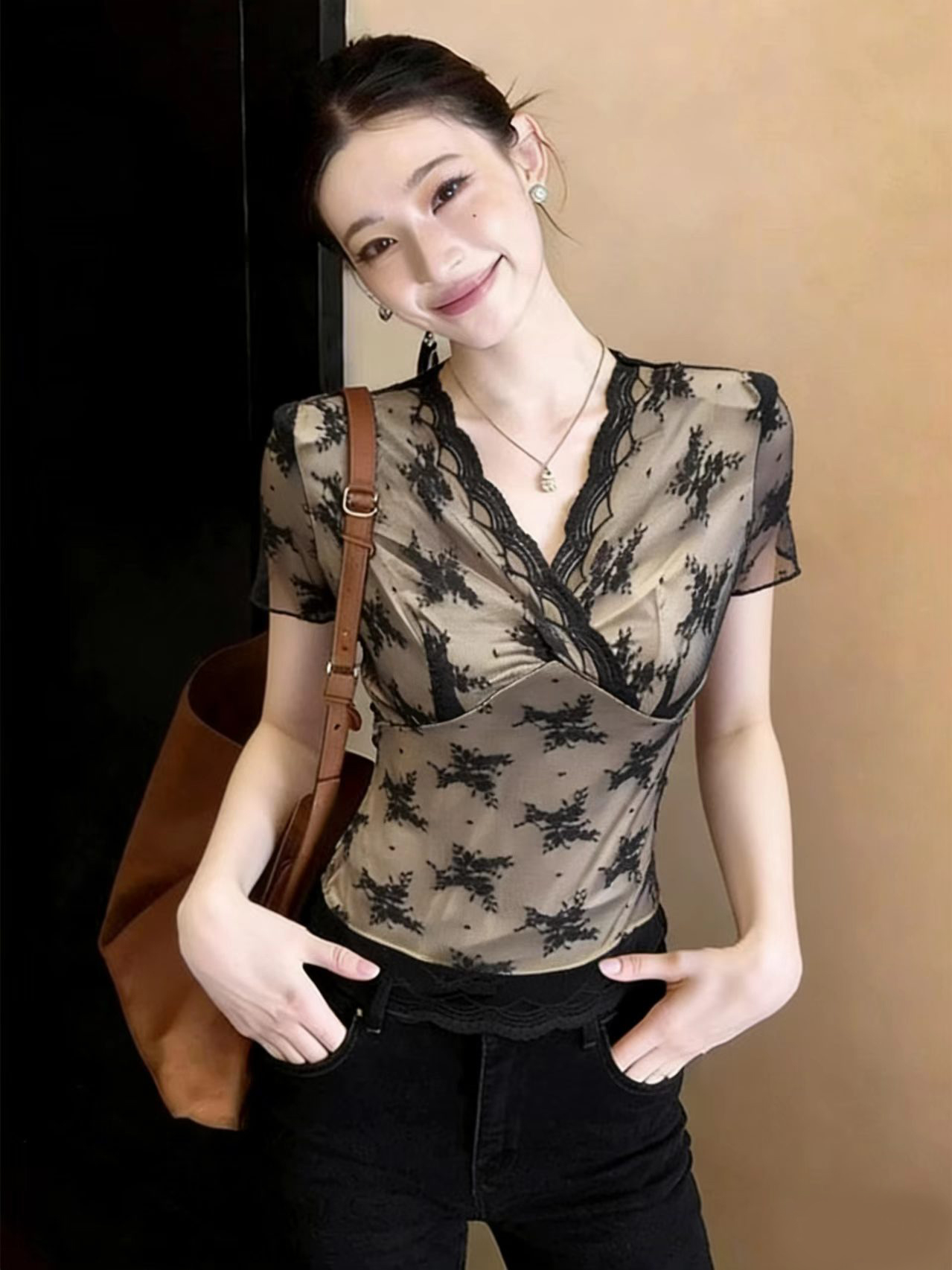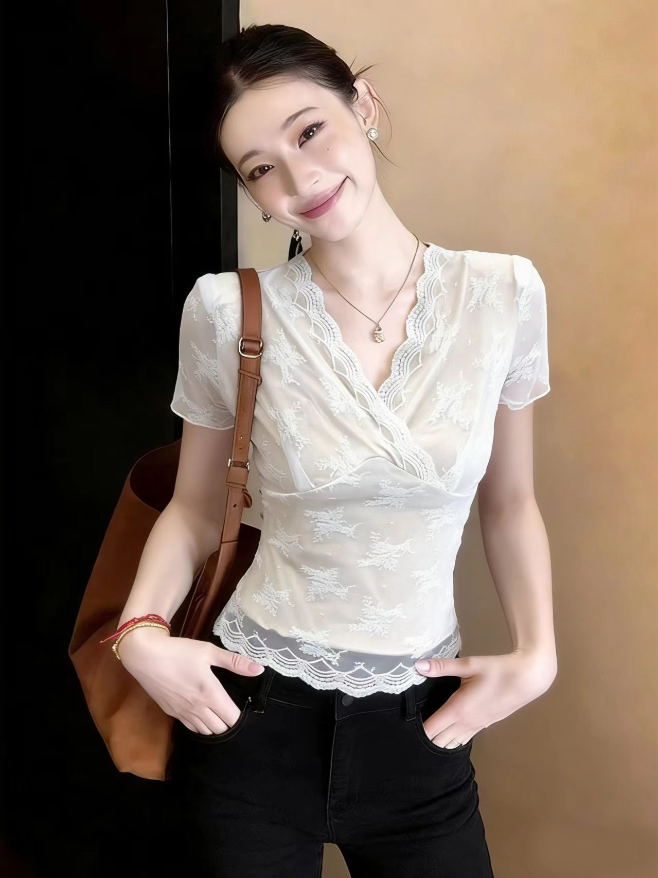 BY12165# 高级感法式蕾丝花边低V领短袖T恤女夏薄纱拼接打底衫修身显瘦上衣 服裝批發女裝批發服飾貨源