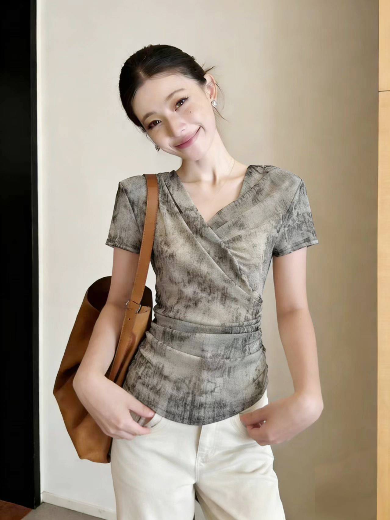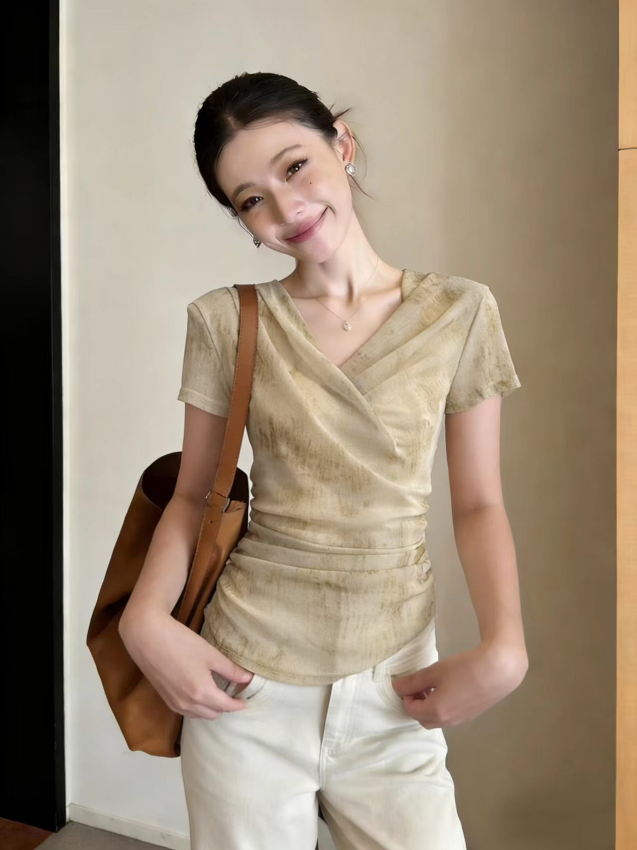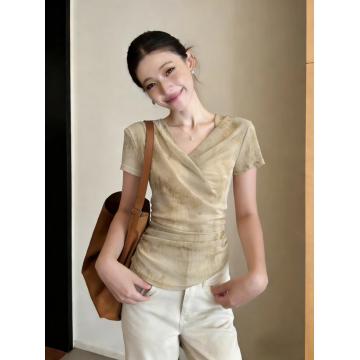 BY12167# 法式扎染正肩短袖t恤女夏季新款设计感v领褶皱收腰不规则漂亮上衣 服裝批發女裝批發服飾貨源
