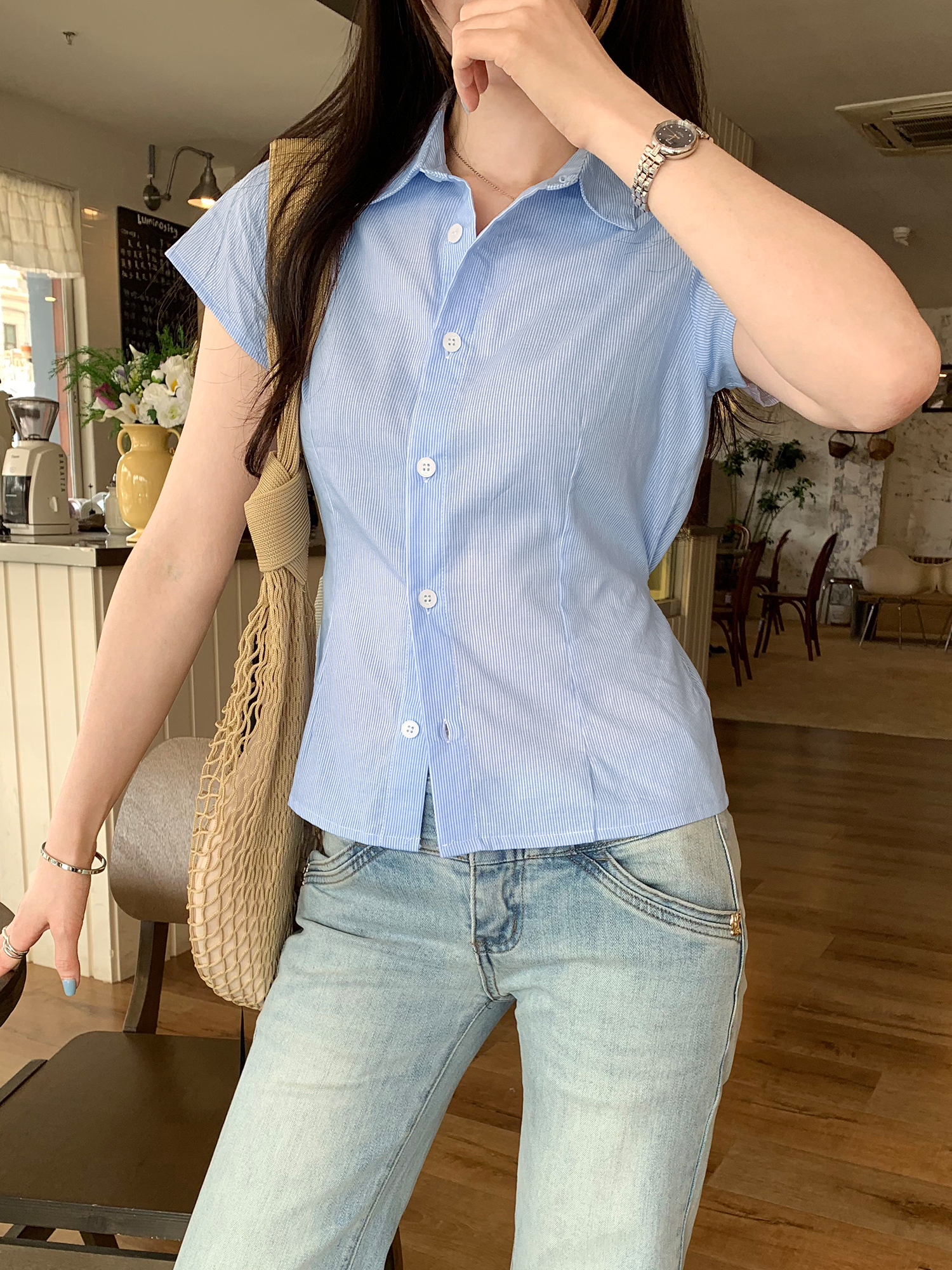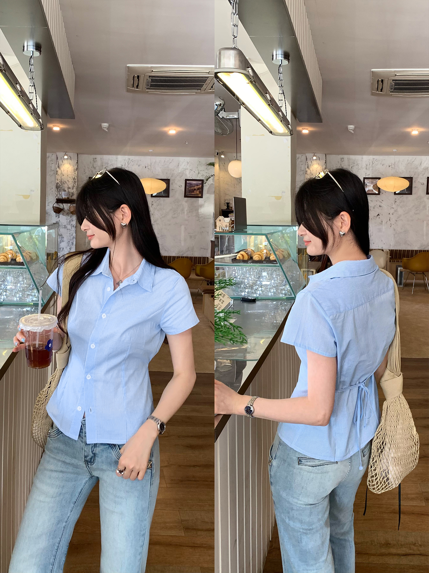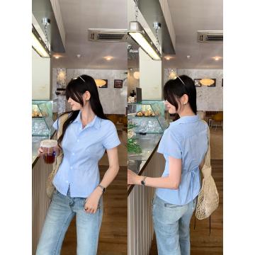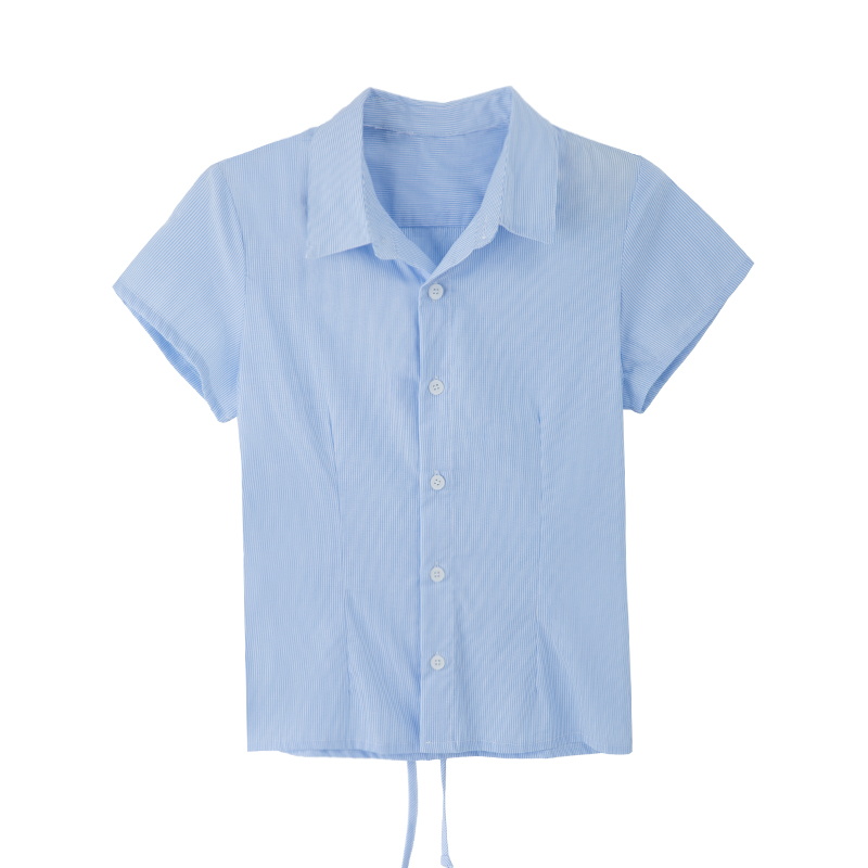 BY12323# 学院风韩系蓝色条纹短袖衬衫女夏新款设计感收腰系带上衣 服裝批發女裝批發服飾貨源
