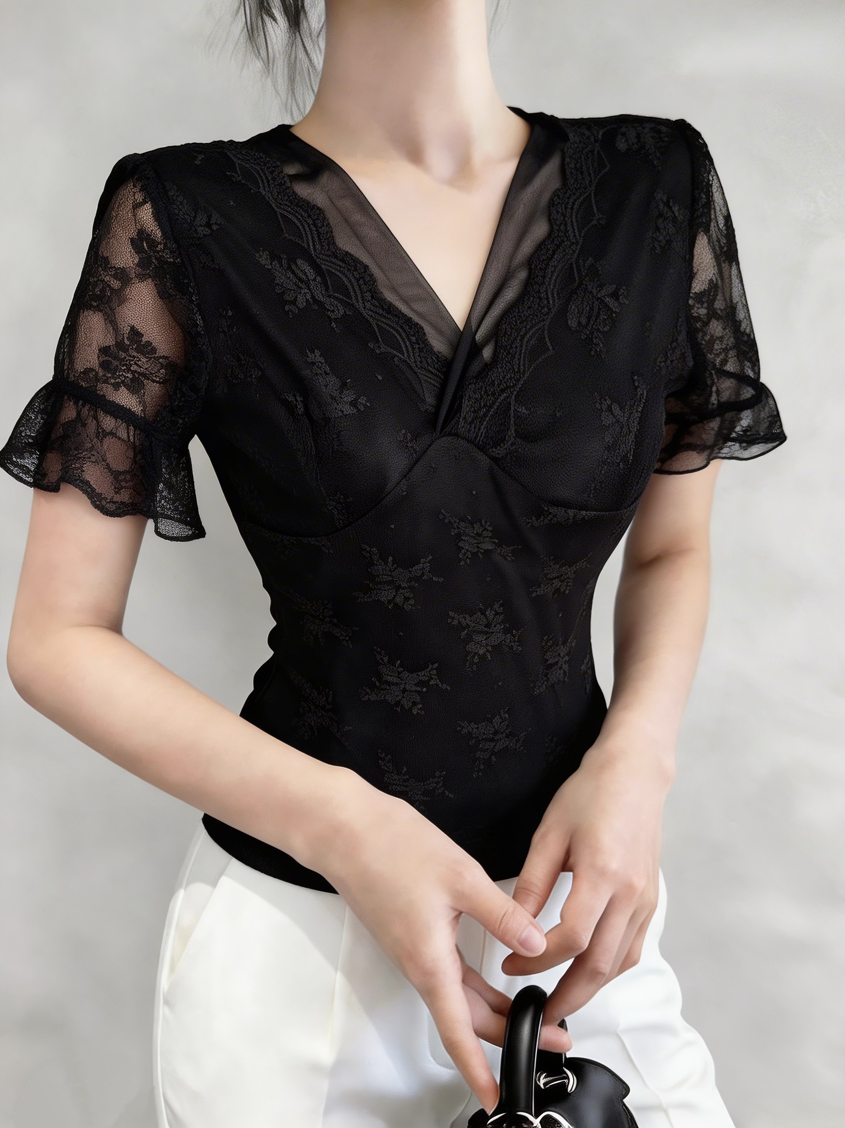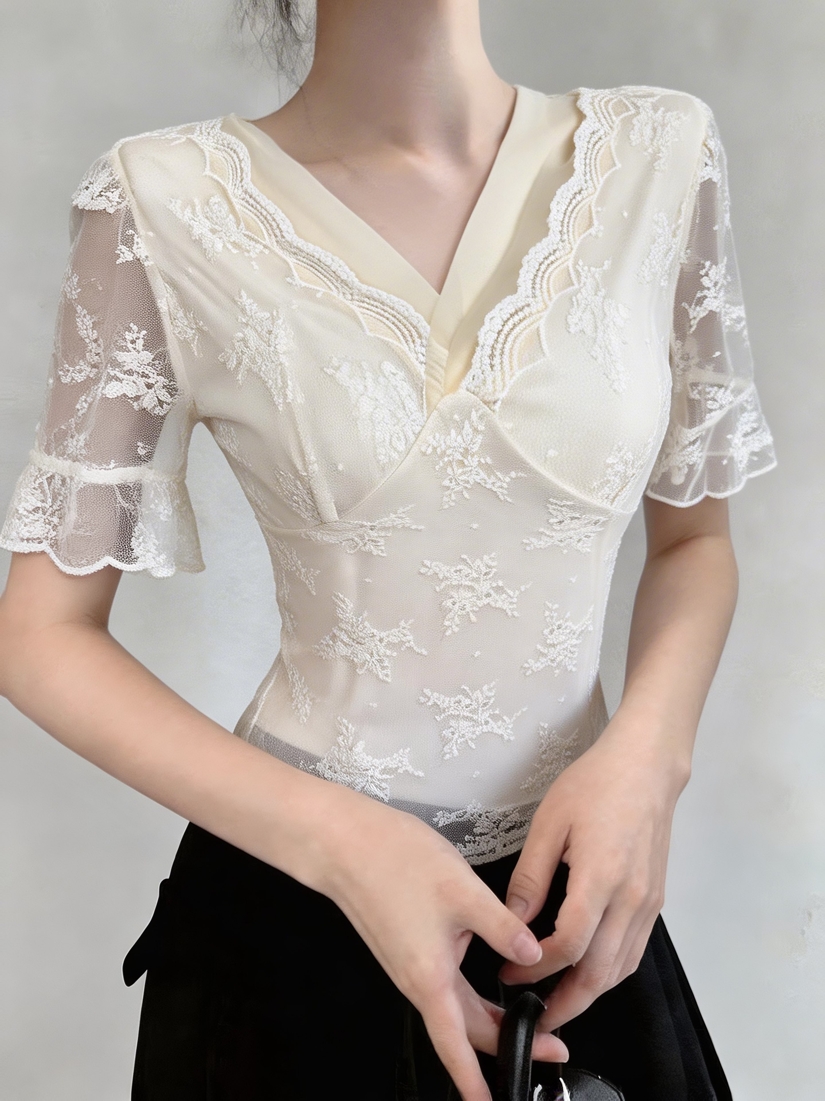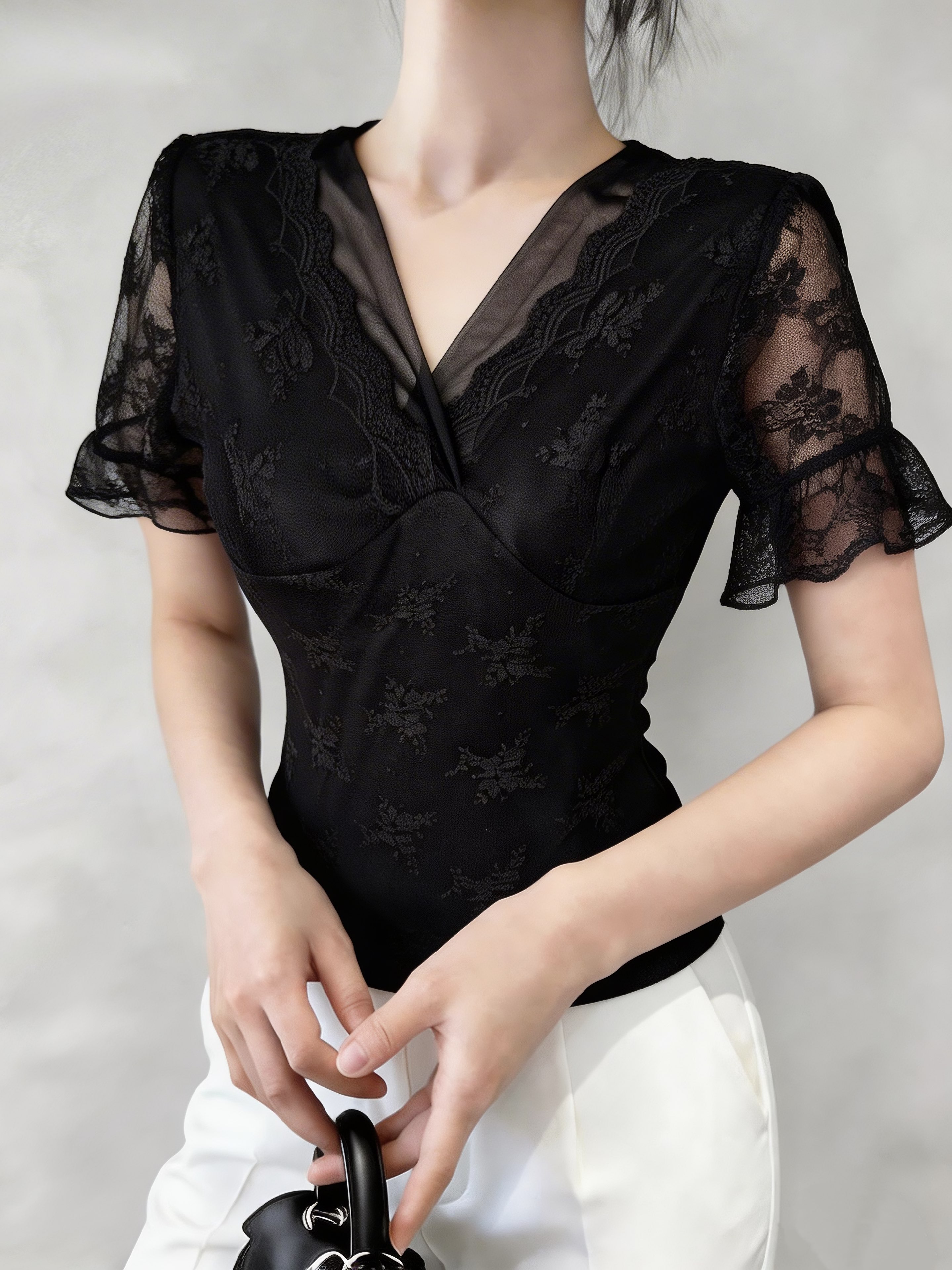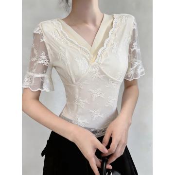 BY12343# 夏季新款拼接V领打底短袖蕾丝衫显瘦减龄透气单上衣 服裝批發女裝批發服飾貨源