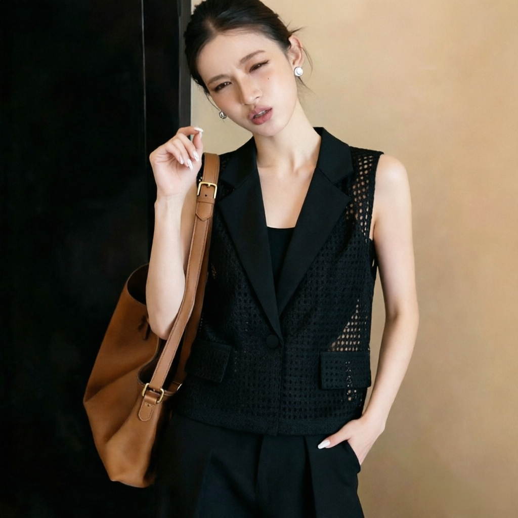 BY12390# 夏季新款镂空外搭西装领薄款黑色外穿坎肩背心马甲女 服裝批發女裝批發服飾貨源