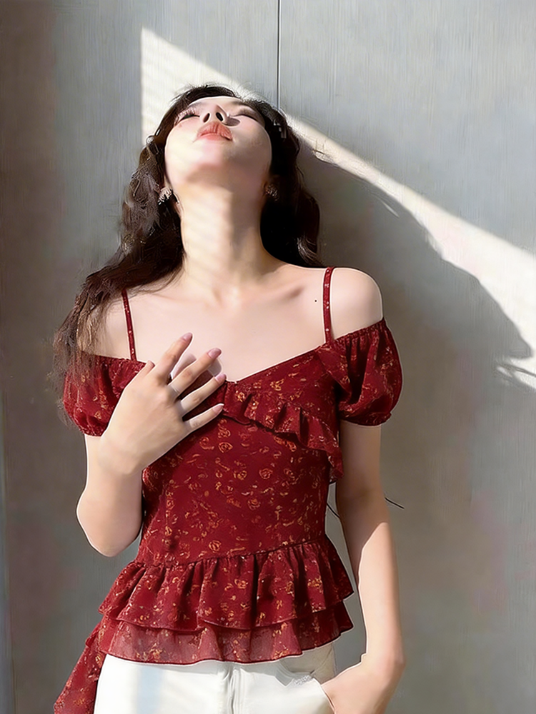 BY12416# 高端南油女装纯欲荷叶边碎花吊带背心春夏季款不规则飘带小上衣 服裝批發女裝批發服飾貨源