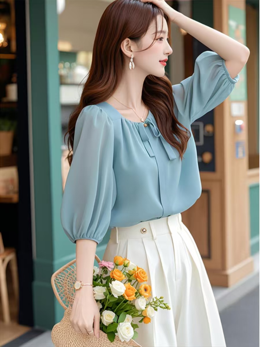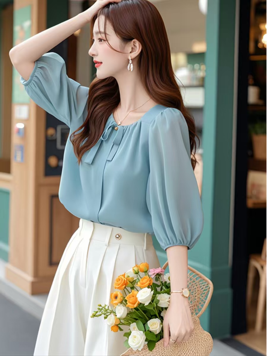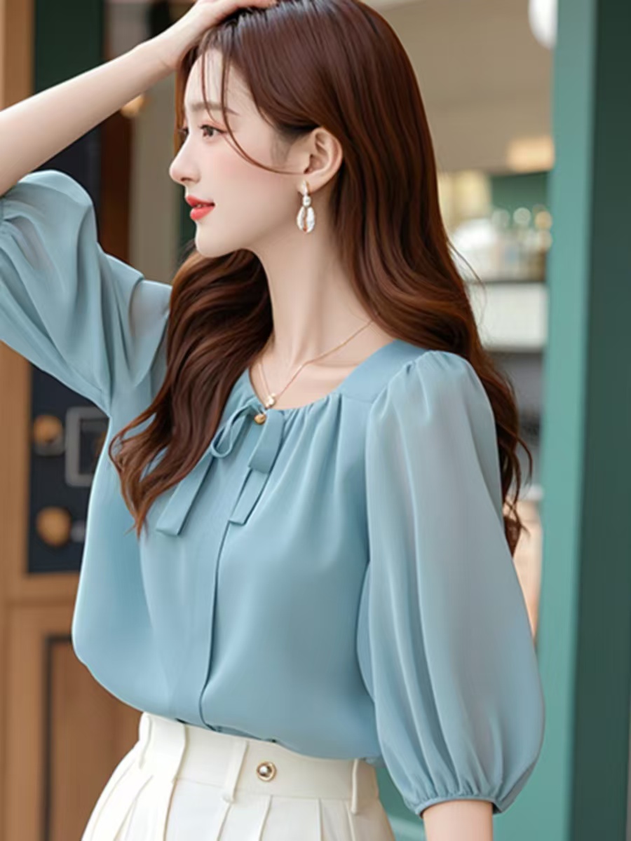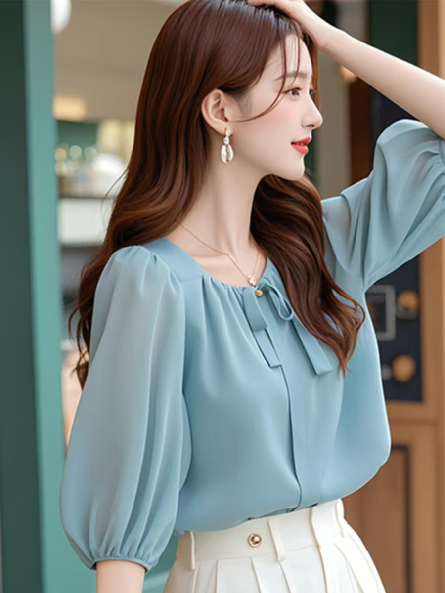 BY12430# 初夏减龄好看的韩系chic别致通勤上衣休闲蓝色五分袖雪纺衬衫女款 服裝批發女裝批發服飾貨源