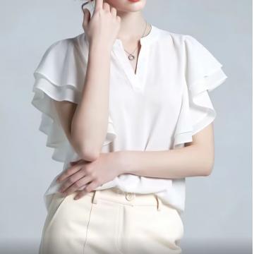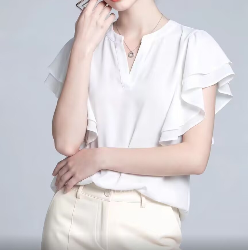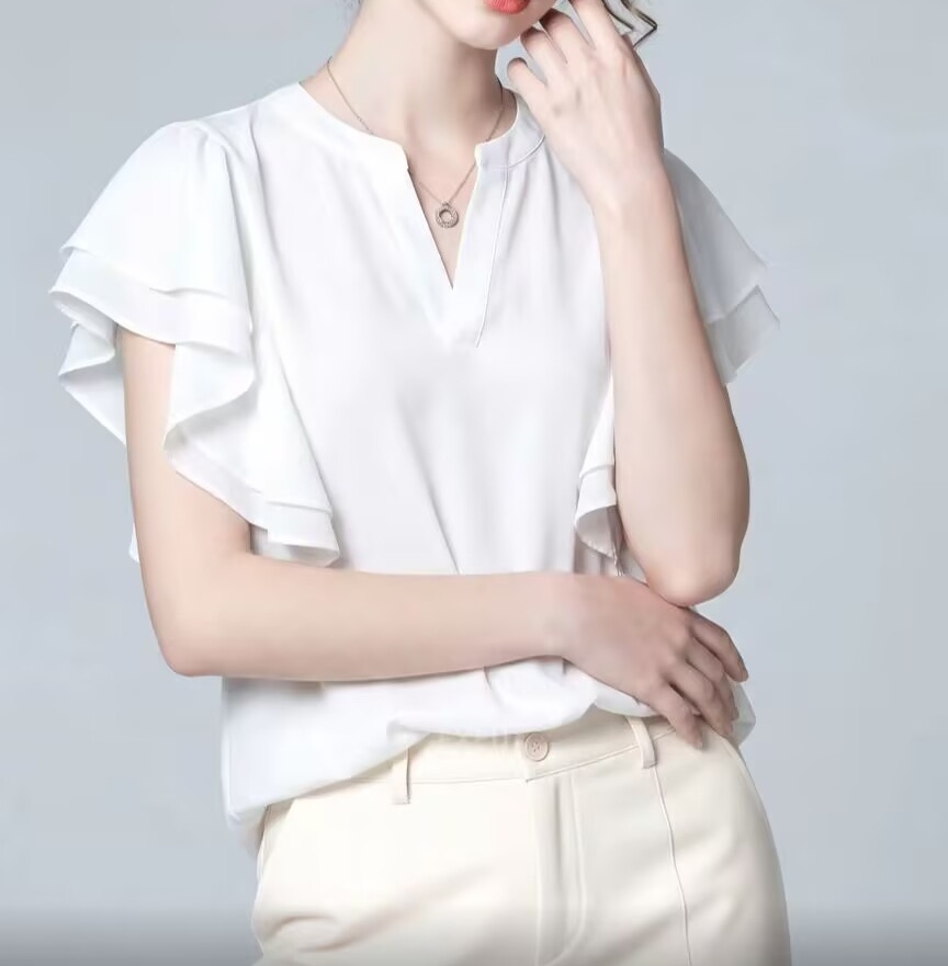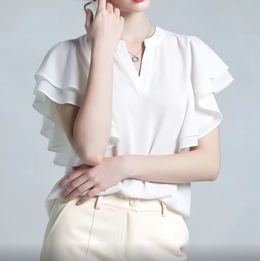 BY12450# 新款夏季韩系高级感白色荷叶边衬衫女百搭显瘦设计感气质上衣 服裝批發女裝批發服飾貨源