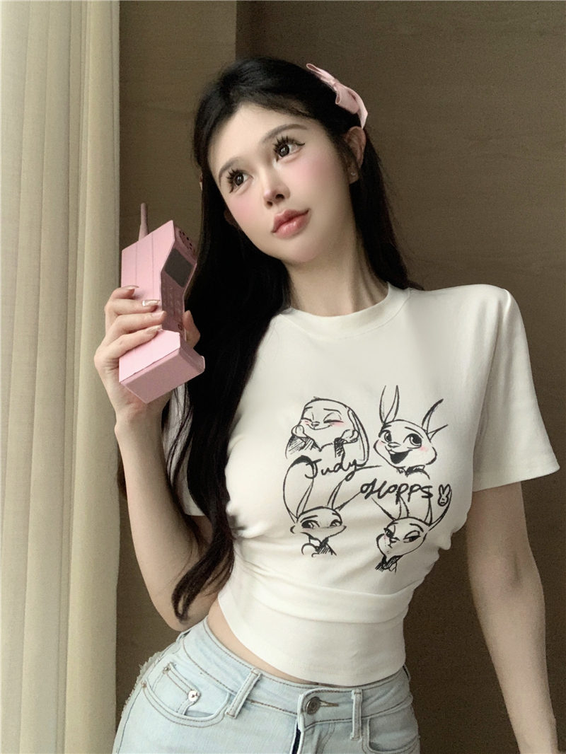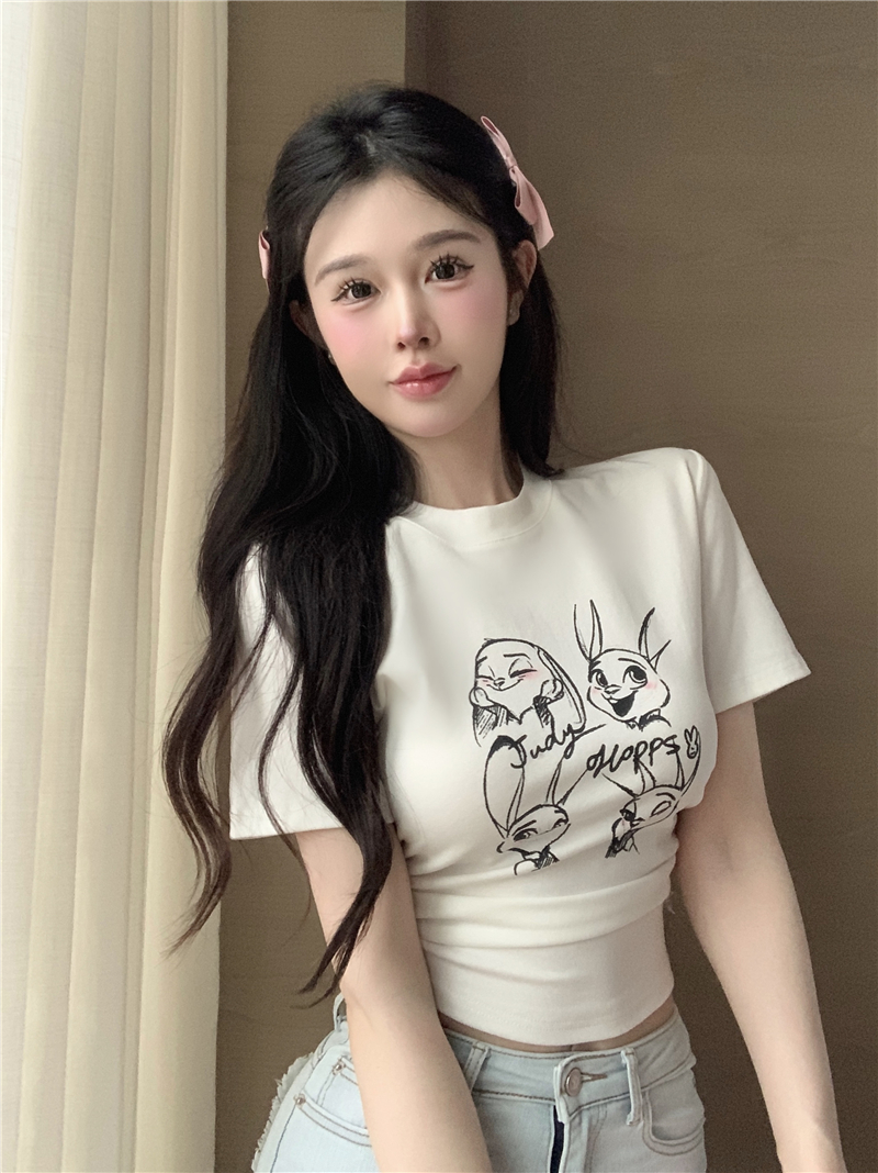 Home > 短袖T恤 > BY12487# 复古褶皱收腰短袖t恤设计感卡通印花露脐短款上衣女 服裝批發女裝批發服飾貨源
