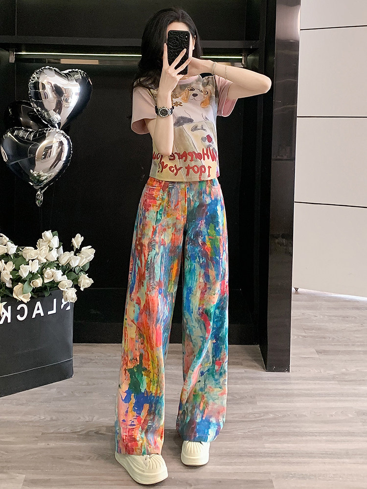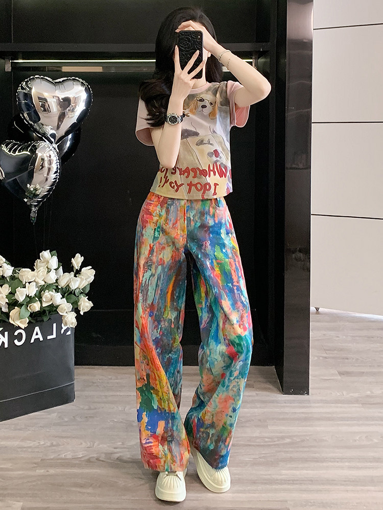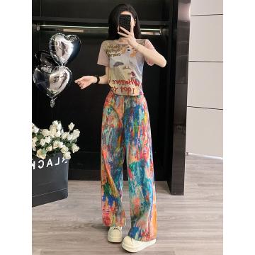 BY12495# 韩系高级感穿搭套装女夏新款温柔印花T恤潮流泼墨彩色牛仔裤 服裝批發女裝批發服飾貨源